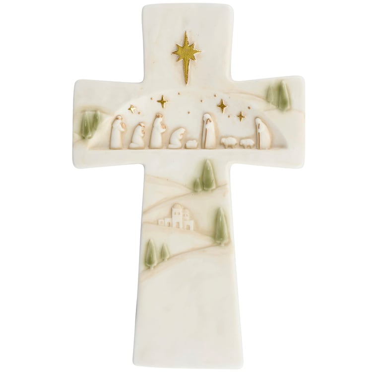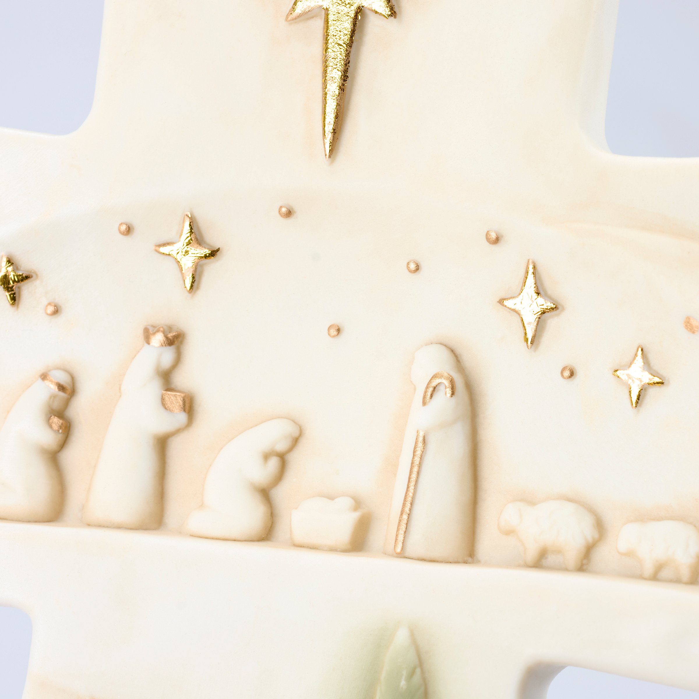 A hanging décor piece from our Christmas Collection featuring a ceramic cross design displaying a nativity scene sculpted into the cross with metallic gold accents. Our Ceramic Cross hanging decor is ready to hang for display using the predrilled holes on the back. A nativity home accent perfect for seasonal display.
