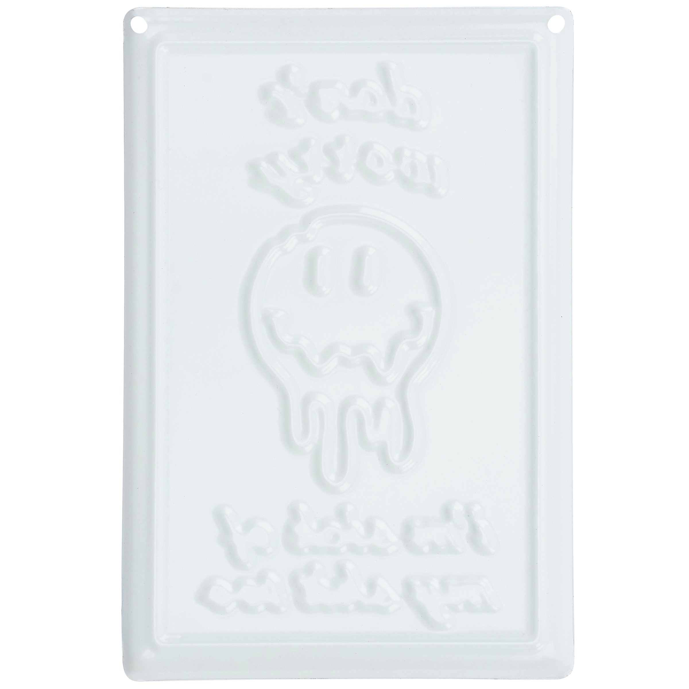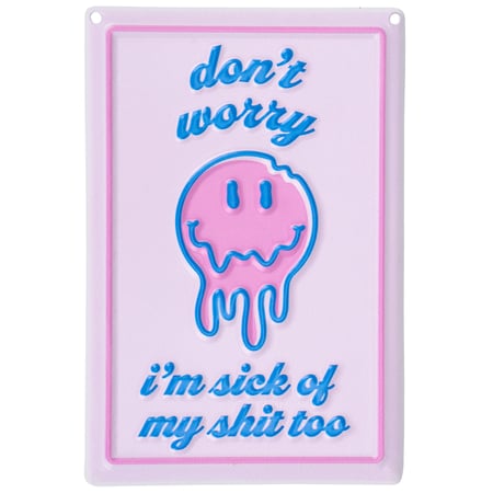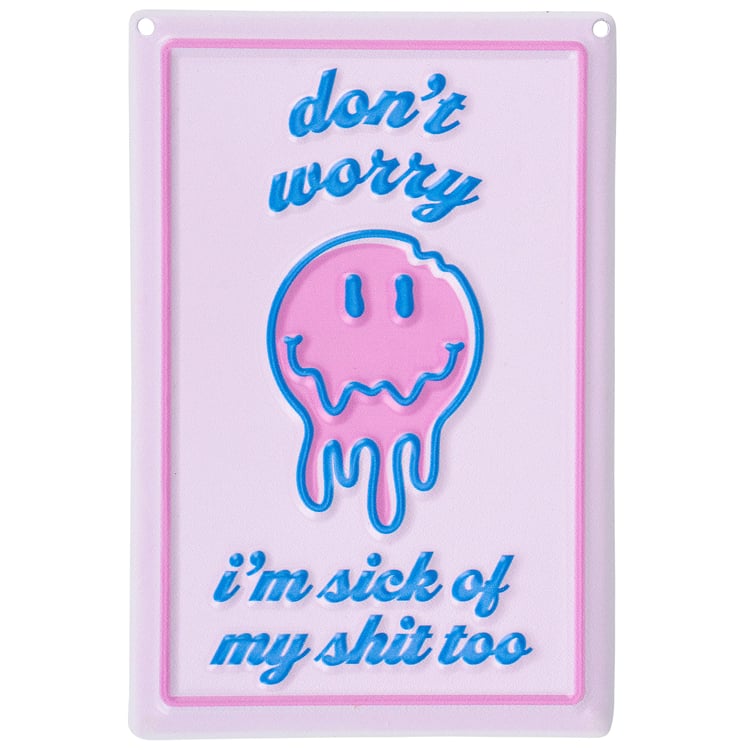 Easily add personality to any space with designs that "pop" off the wall in more ways than one. This ready to hang metal décor piece features a sassy eye-catching design full of self-expression with embossed details for added dimension. Let them know they aren't the only one with this cute retro inspired design of a melting smiley face and sassy sentiment that reads "Don't Worry I'm Sick Of My Shit Too." Our Don't Worry metal wall décor is easy to hang against wall using the included mounting hardware and pre-drilled holes in each corner. Sassy wall decor that is great for gifting!