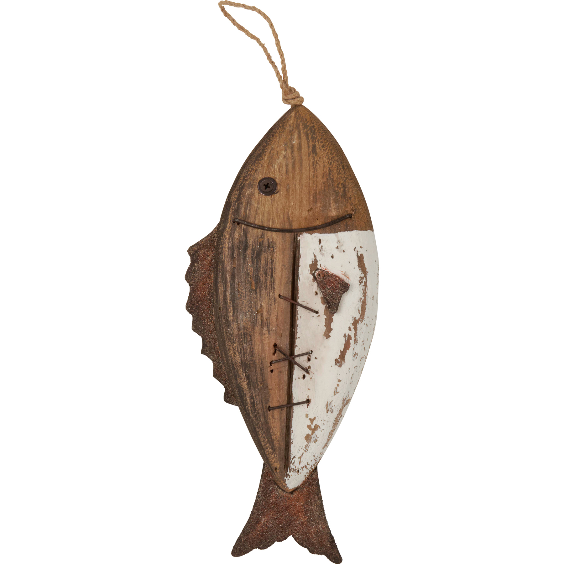 A decorative fish from our Lake & Cabin Collection displaying a driftwood aesthetic with handmade accents. Fish features double-sided design with distressed details and aged metal for fins and tail. Our Driftwood Fish hanging décor is easy to hang via attached jute rope hanger. A rustic outdoor-themed home accent.
