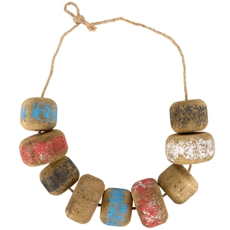 A hanging décor piece from our Beach Collection displaying fishing floats on a jute string made from natural wood pieces. Each fishing float features painted designs with distressed details for a unique handmade appearance. Our hanging Fishing Floats décor is easy to hang for display via jute loop. A rustic beach-themed home accent that coordinates well with primitive home décor.