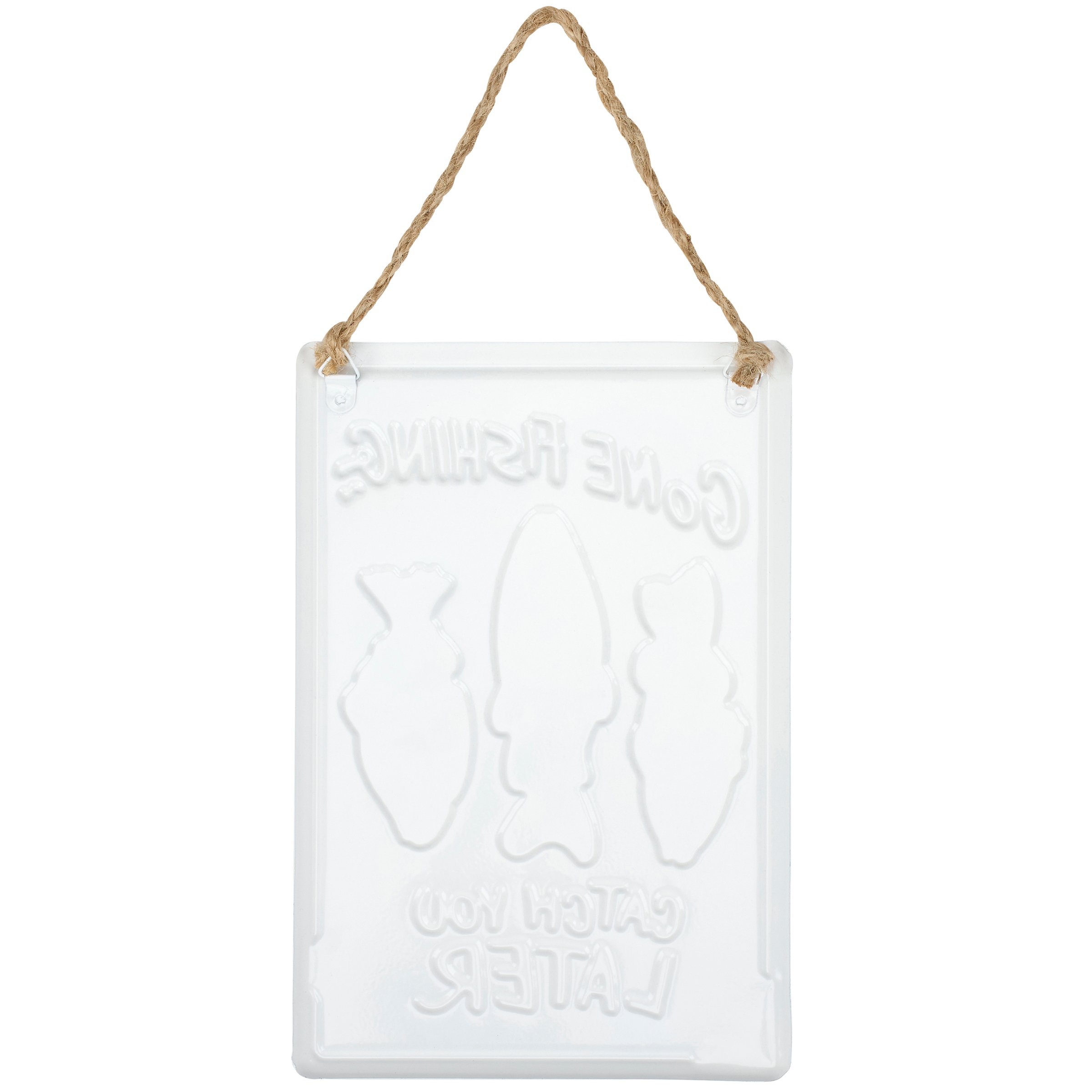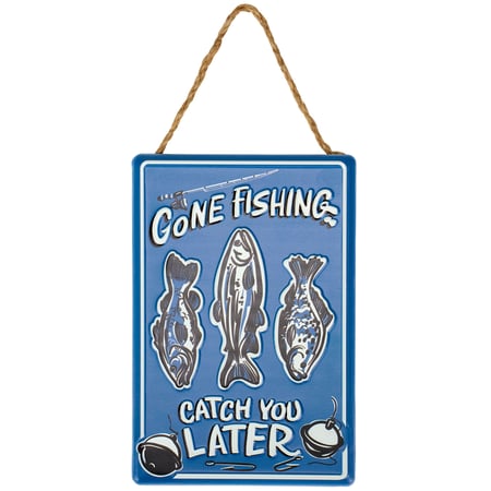 A metal décor piece from our Lake & Cabin Collection displaying hand illustrated fishing designs with a fun fishing inspired sentiment that reads "Gone Fishing - Catch You Later." This funny fishing sign features embossed details to accent the original hand illustrated art as well as a lake blue color palette. Our metal Gone Fishing sign is easy to hang on a wall or doorknob for display via the attached jute hanger. A fun fishing-themed gift perfect for showing off a love for fishing in any home or work space.