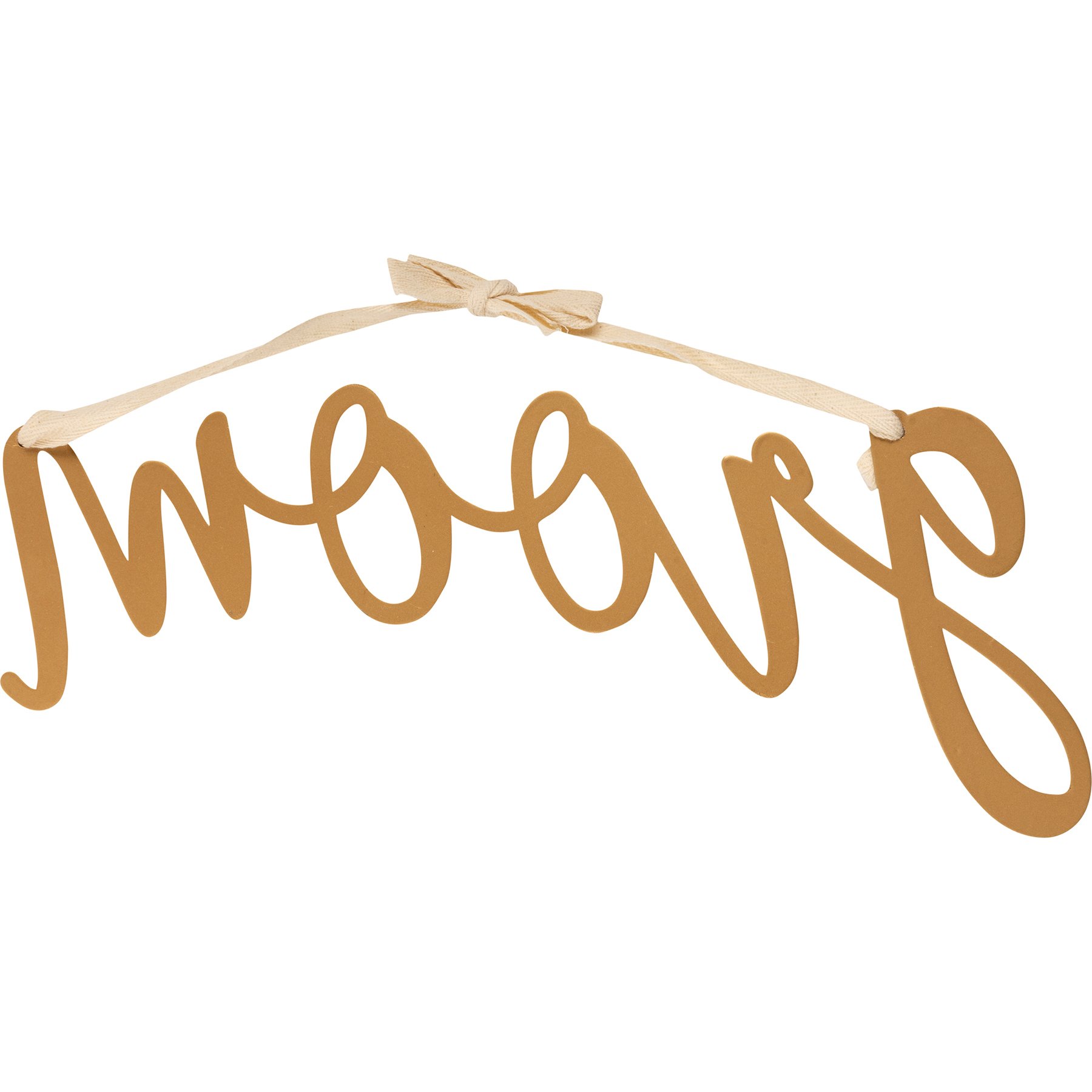 A metal hanging décor piece from our Wedding Collection featuring "Groom" sentiment in gold. Our Groom sign hanging décor easily hangs via attached cotton tape hangers which can be tied together at the top.