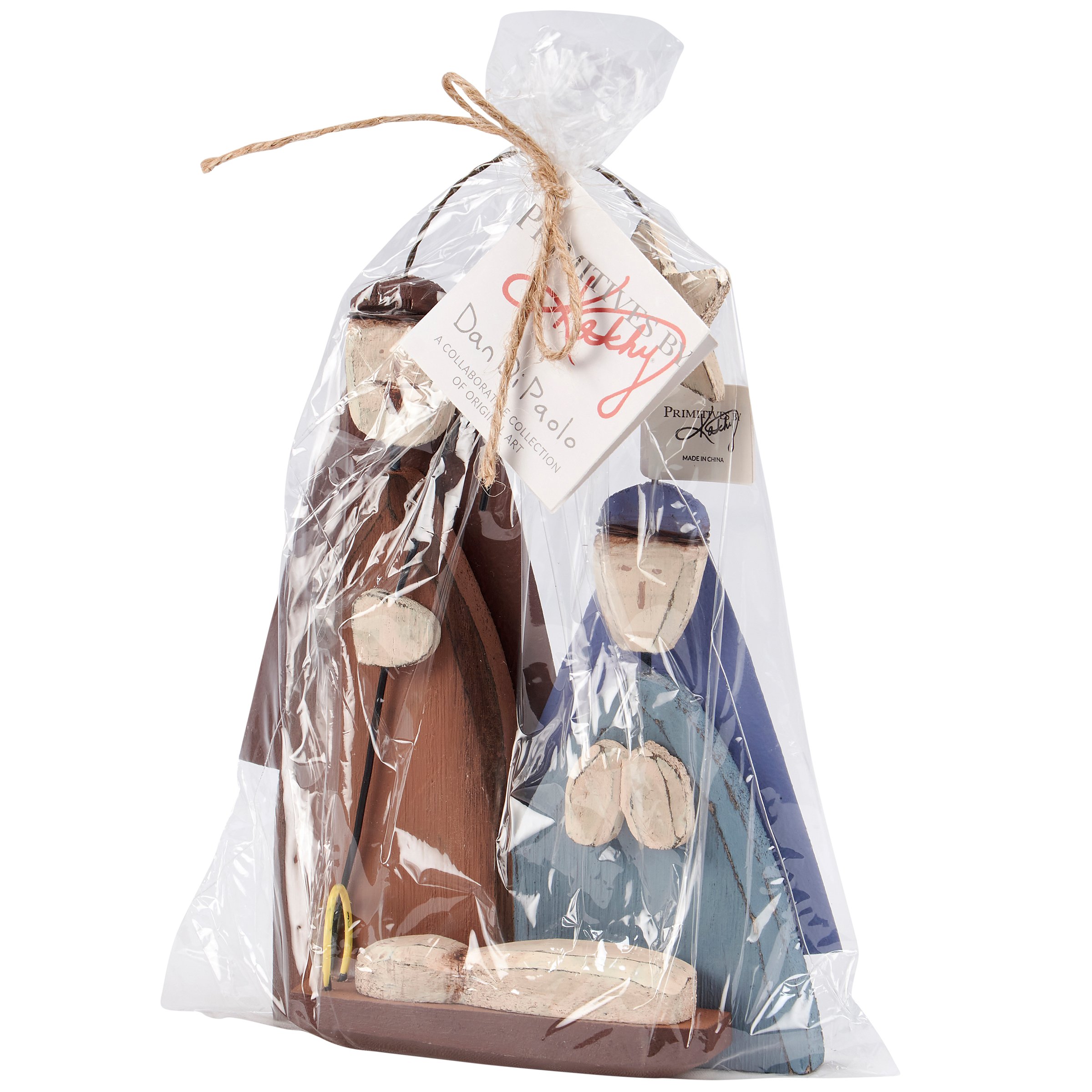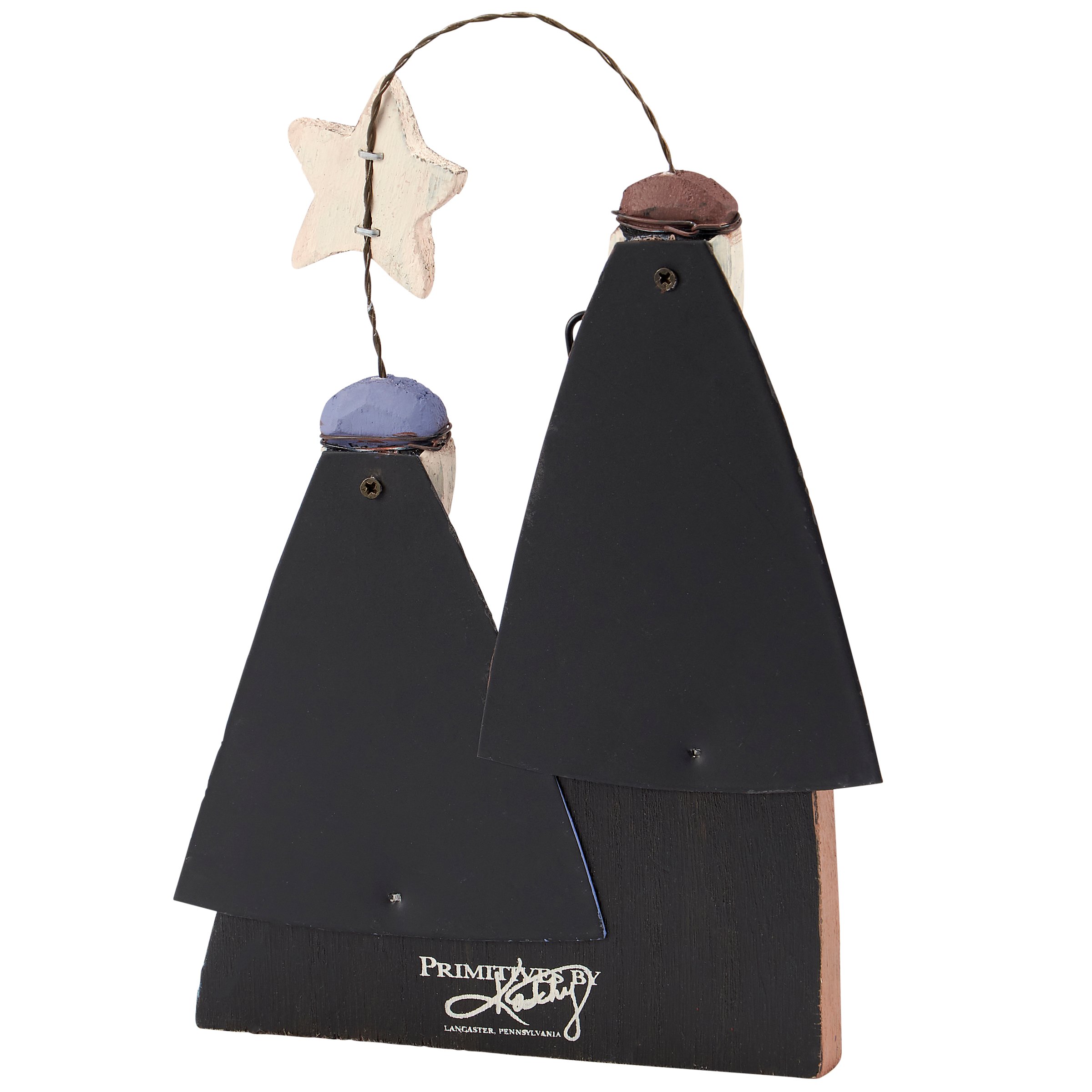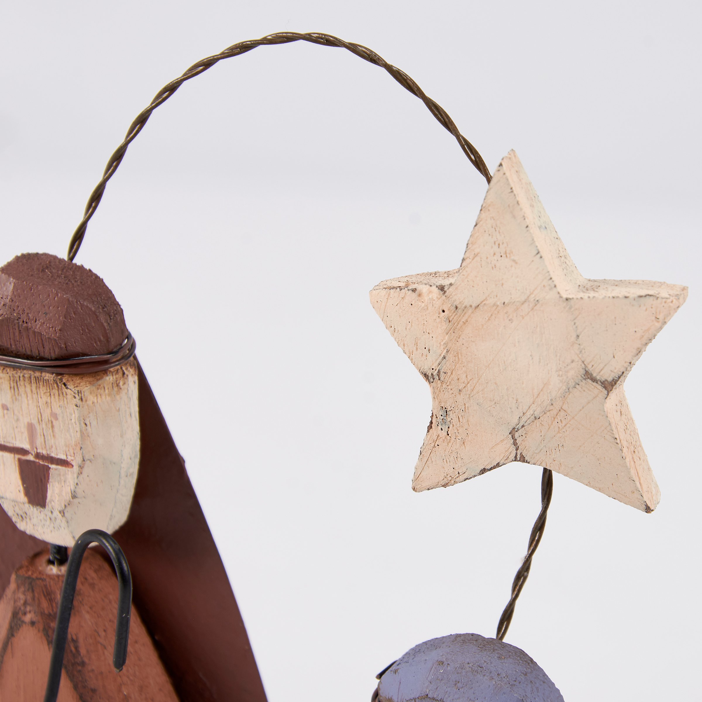 A wooden hanging decor piece from our Christmas Collection displaying a rustic nativity scene recreated from an original hand carved piece with distressed details and metal accents. Nativity decor features shaped metal wire and painted details to create a handmade feel. Our Holy Family hanging decor is designed to hang via twisted wire hanger with wooden star accent or can free-stand on flat surface for display. A rustic nativity home accent perfect for seasonal display.