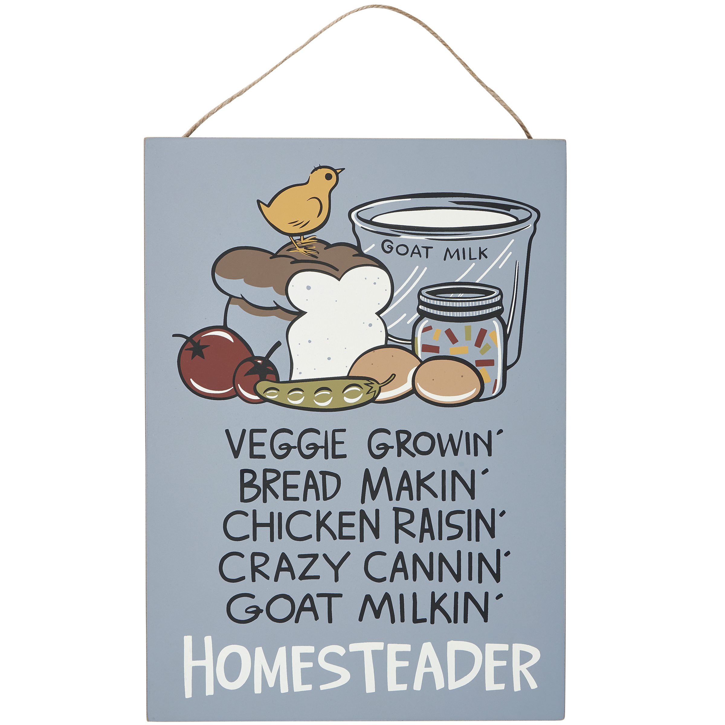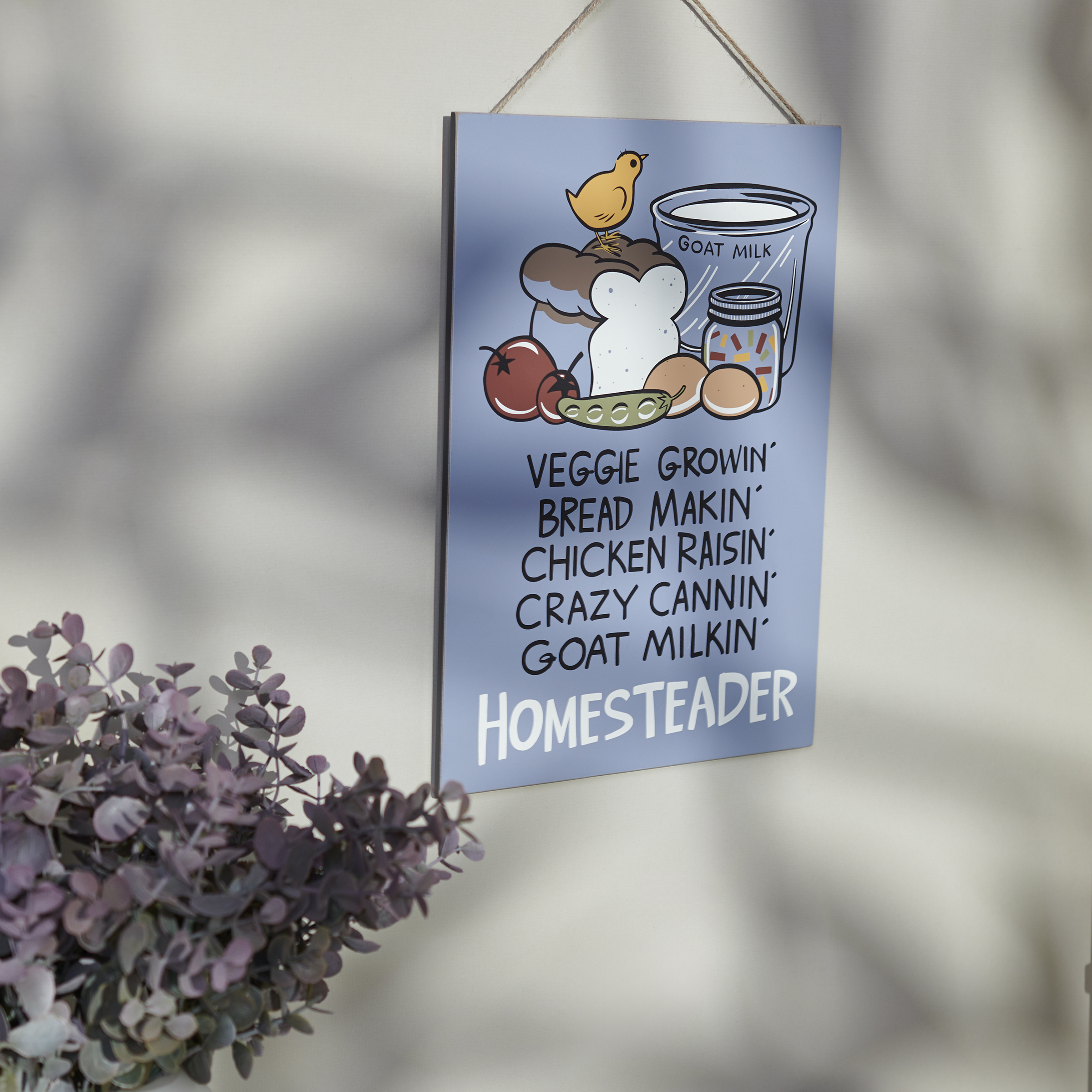 A hanging décor piece from our Homestead Collection displaying unique hand illustrated designs of whole foods and a chick with a fun homestead inspired sentiment that reads "Veggie Growin' - Bread Makin' - Chicken Raisin' - Crazy Cannin' - Goat Milkin' Homesteader." Wooden hanging décor features coordinating black color on the sides and back. Our Homesteader hanging décor is easy to hang via attached jute hanger. A fun everyday home accent perfect for adding character to any room.