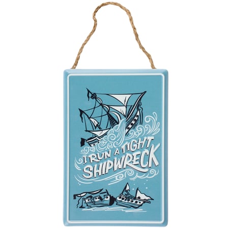 A metal décor piece from our Beach Collection displaying a hand illustrated scene of a ship on rough waves and a sunken ship with a fun sailing inspired sentiment that reads "I Run A Tight Shipwreck." This funny sailing sign features embossed details to accent the original hand illustrated art as well as an ocean blue color palette that easily coordinates with beach home decor. Our I Run A Tight Shipwreck metal hanging décor is easy to hang for display via the attached jute hanger. A fun beach-themed gift perfect for beach house decorating or showing off a love for the ocean anywhere.