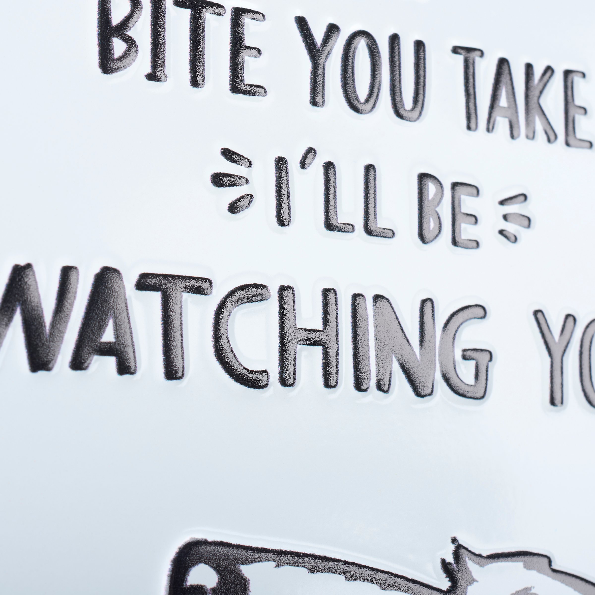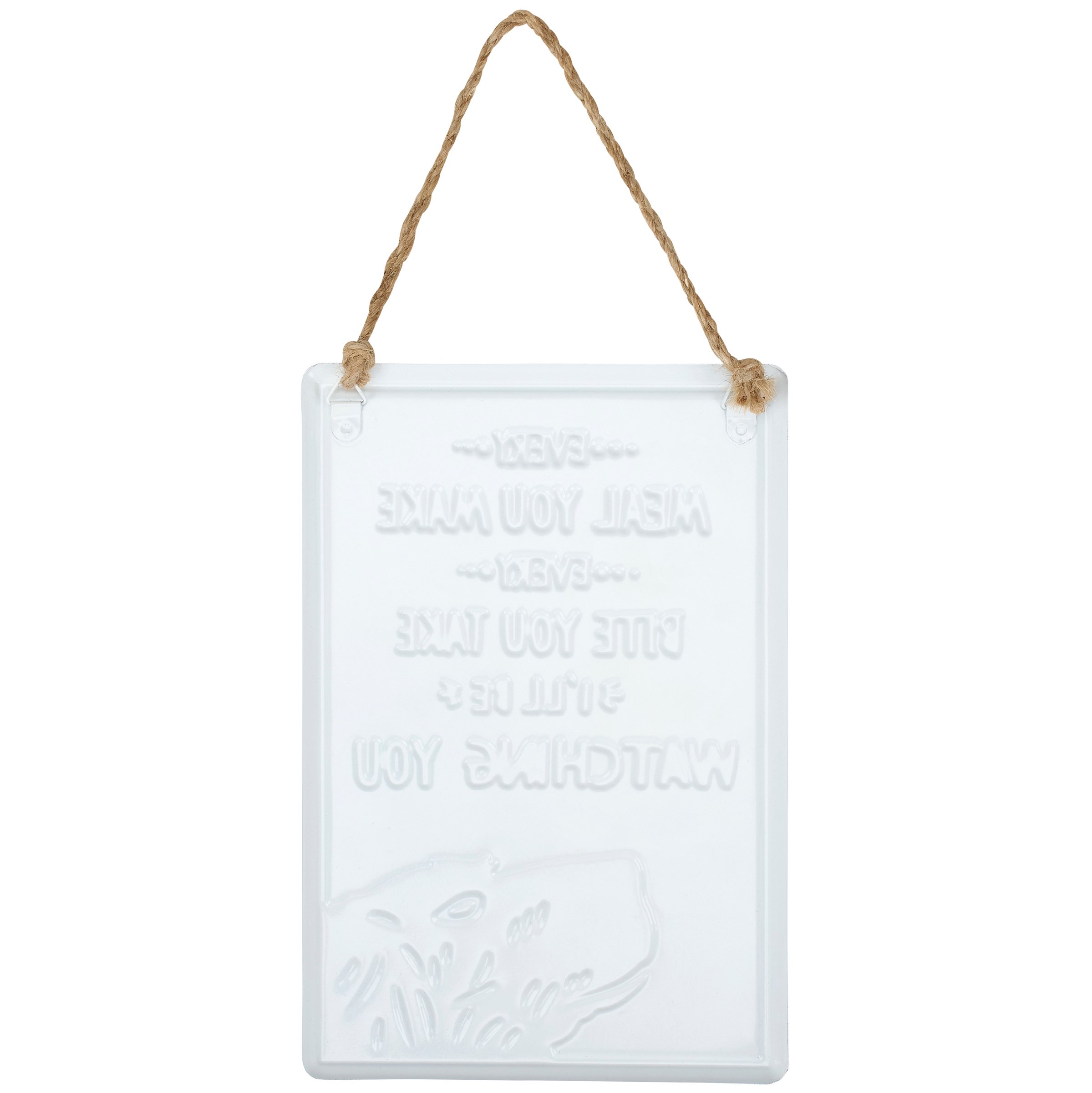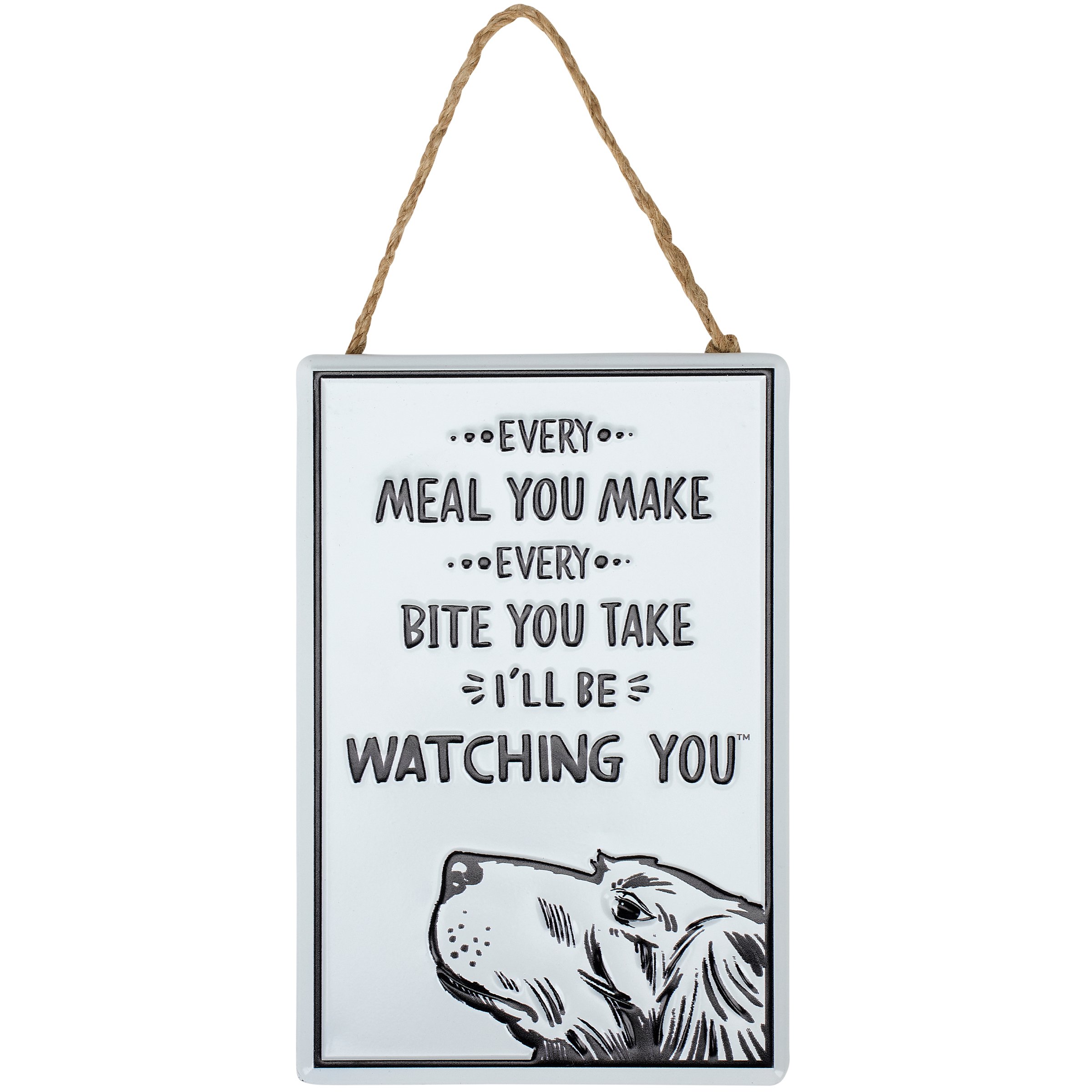 A metal décor piece from our Pet Collection displaying a hand illustrated dog design with a fun pet inspired sentiment that reads "Every Meal You Make - Every Bite You Take - I'll Be Watching You." This funny pet sign features embossed details to accent the original hand illustrated art for added dimension. Our metal I'll Be Watching You sign is easy to hang on a wall or doorknob for display via the attached jute hanger. A fun dog-themed gift perfect for showing off a love for pets in any home or work space.