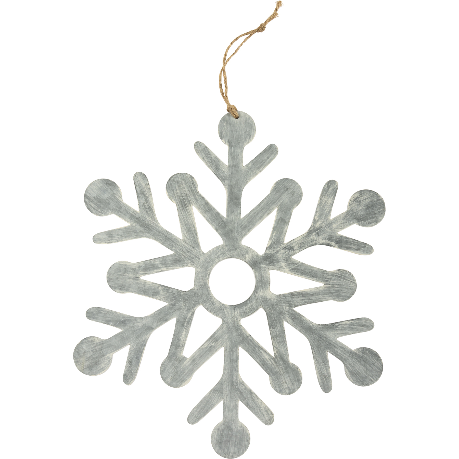 A decorative hanging décor piece from our Christmas Collection featuring a cutout metal snowflake design. Our large hanging Snowflake decor is easy to hang via a jute loop. A rustic seasonal home accent.