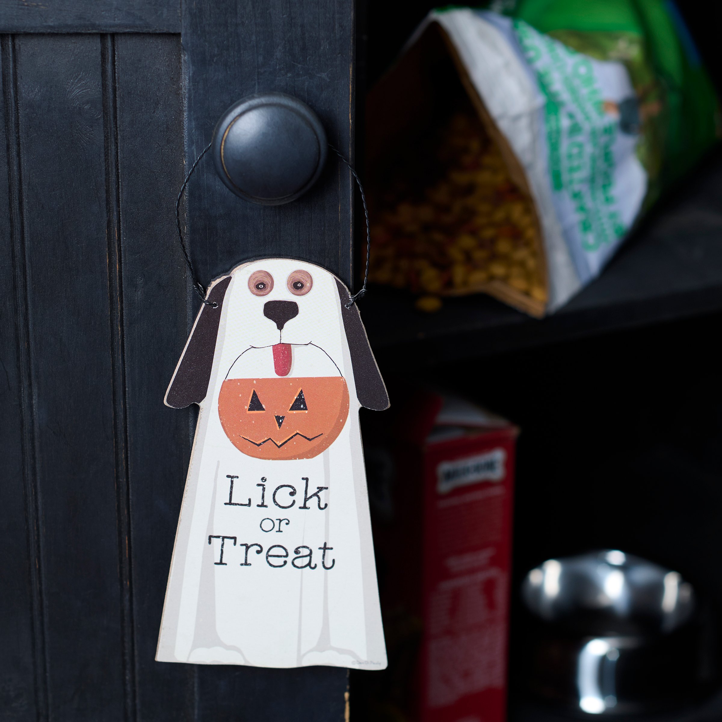 A wooden hanging décor piece boasting a rustic design of a dog wearing a ghost costume and holding a treat pail and featuring "Lick Or Treat" sassy sentiment. Easily hangs by twisted wire loop.