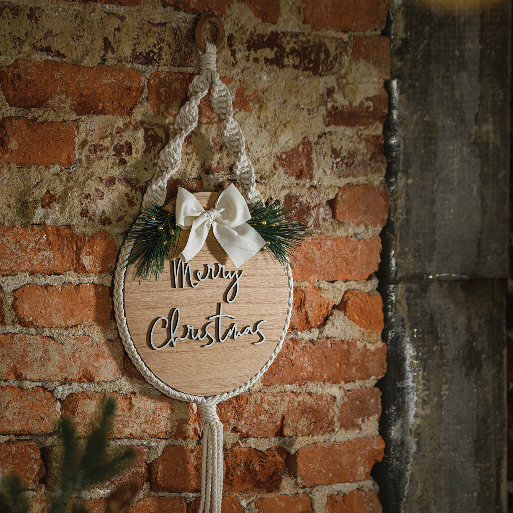 A hanging décor piece from our Christmas Collection displaying a bohemian style holiday design with warm gray "Merry Christmas" sentiment that pops out from natural wood background. Hanging decor features macrame cord wrapped around the edge that comes together at wooden hanger with complementing bow and pine accents. The Merry Christmas hanging decor is easy to hang via wooden ring hanger.