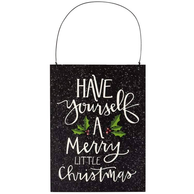 A hanging decor piece from our Christmas Collection displaying holly designs and an inspirational seasonal sentiment in a hand illustrated style that reads "Have Yourself A Merry Little Christmas." Christmas hanging decor features mica coating for a snowy effect and coordinating black color on the sides and back. Our Merry Little Christmas hanging decor is easy to hang for display via the attached twisted wire hanger. A moody Christmas home accent perfect for seasonal display.