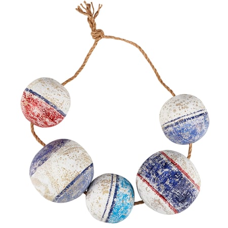 A hanging décor piece from our Beach Collection displaying nautical floats on a rope loop made from carved wood pieces. Nautical floats décor features painted designs with distressed details for a unique handmade appearance. Our Nautical Floats hanging décor is easy to hang via rope loop. A beach-themed everyday home accent perfect for adding character to any room.