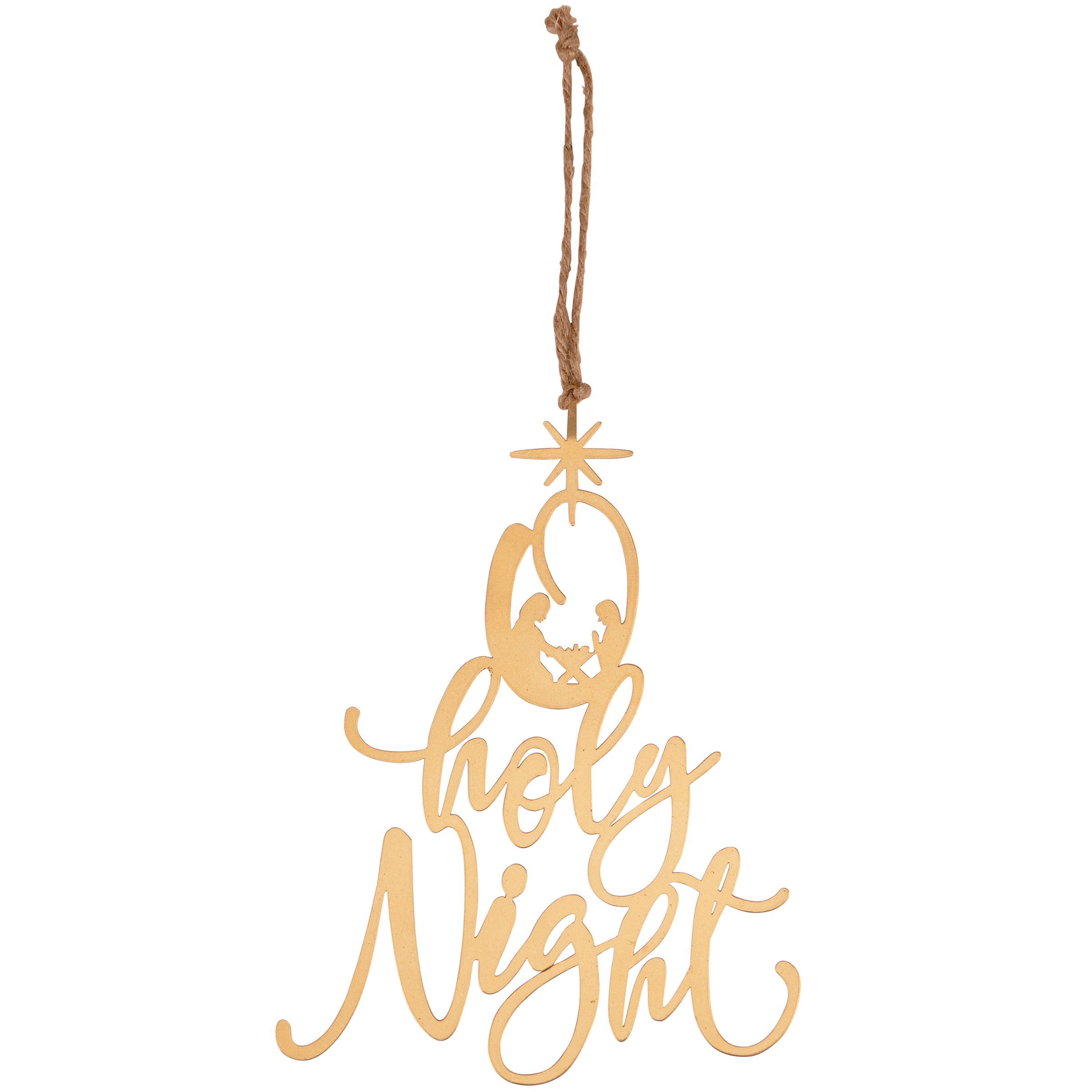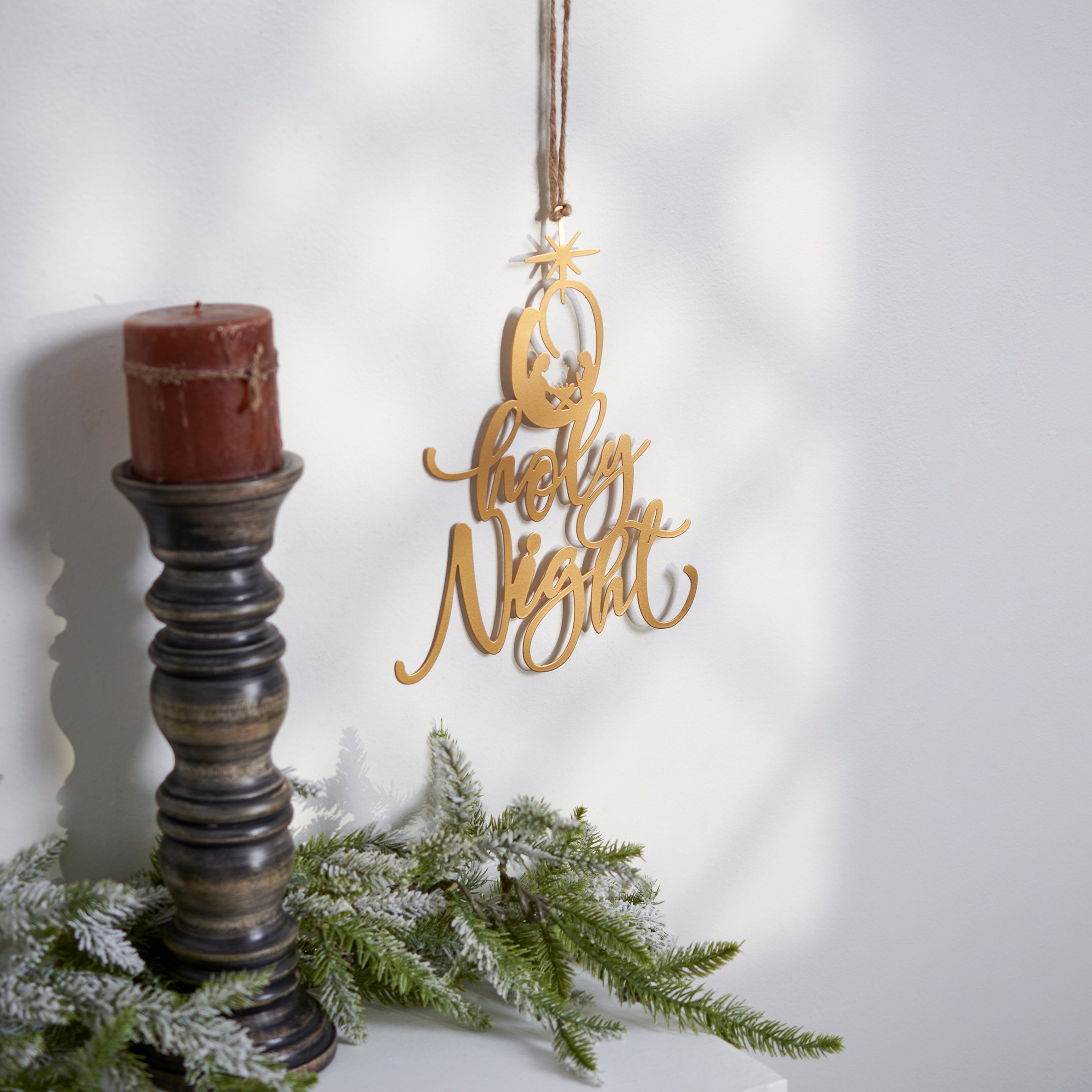 A hanging décor piece from our Christmas Collection featuring a metal cutout of a nativity inspired sentiment that reads "O Holy Night" with a nativity silhouette in the "O." Our O Holy Night hanging décor is easy to hang for display via the attached jute hanger. A nativity-themed seasonal home accent that can be easily displayed in any home for the holidays.