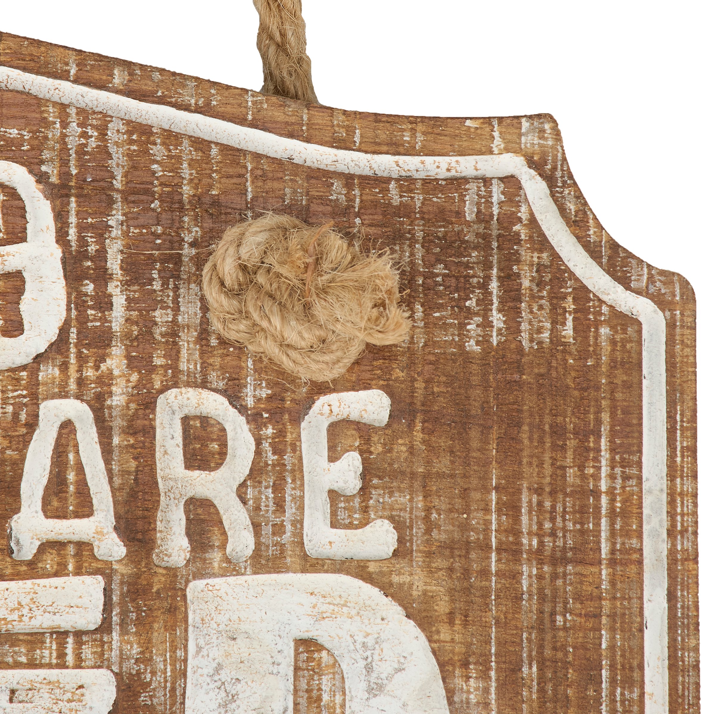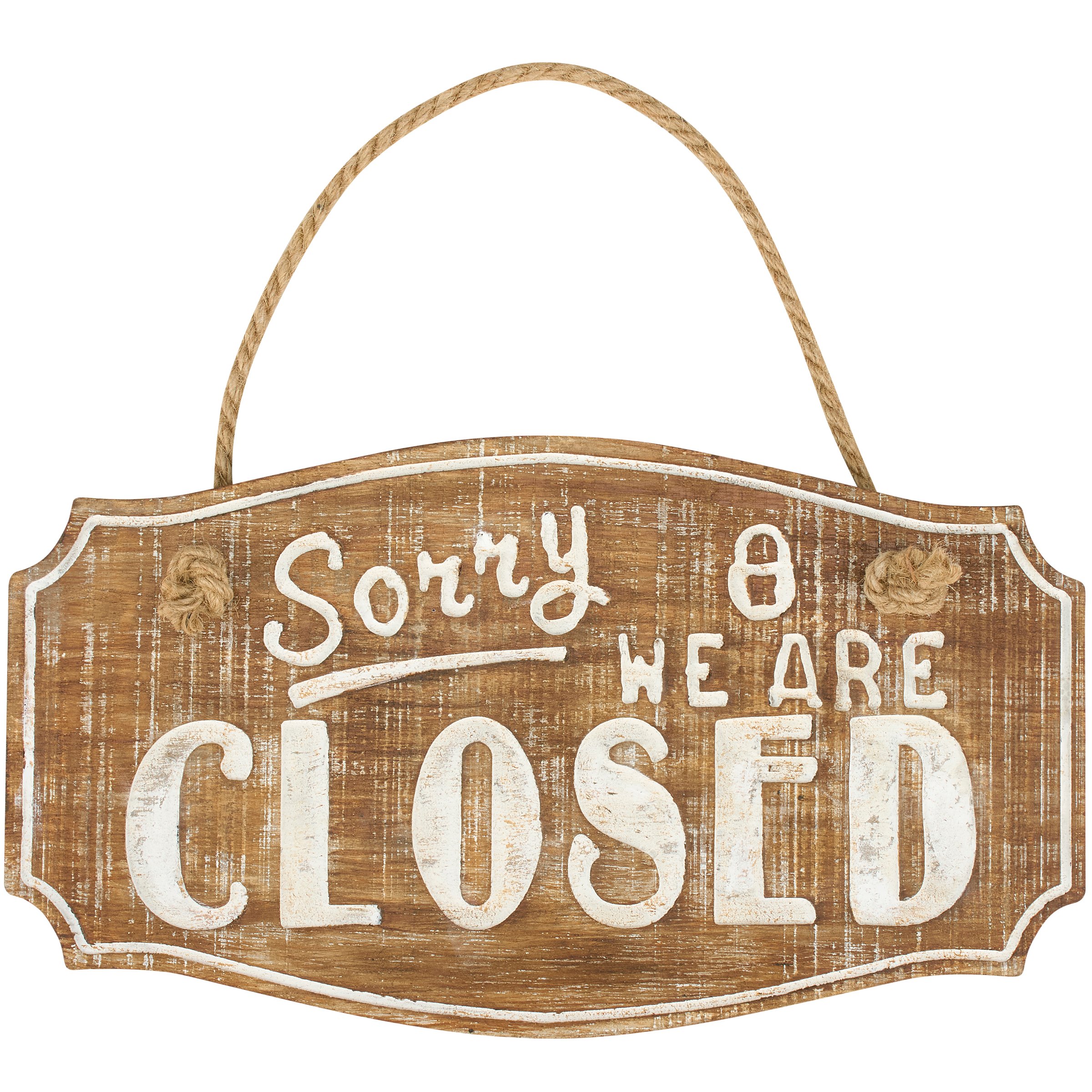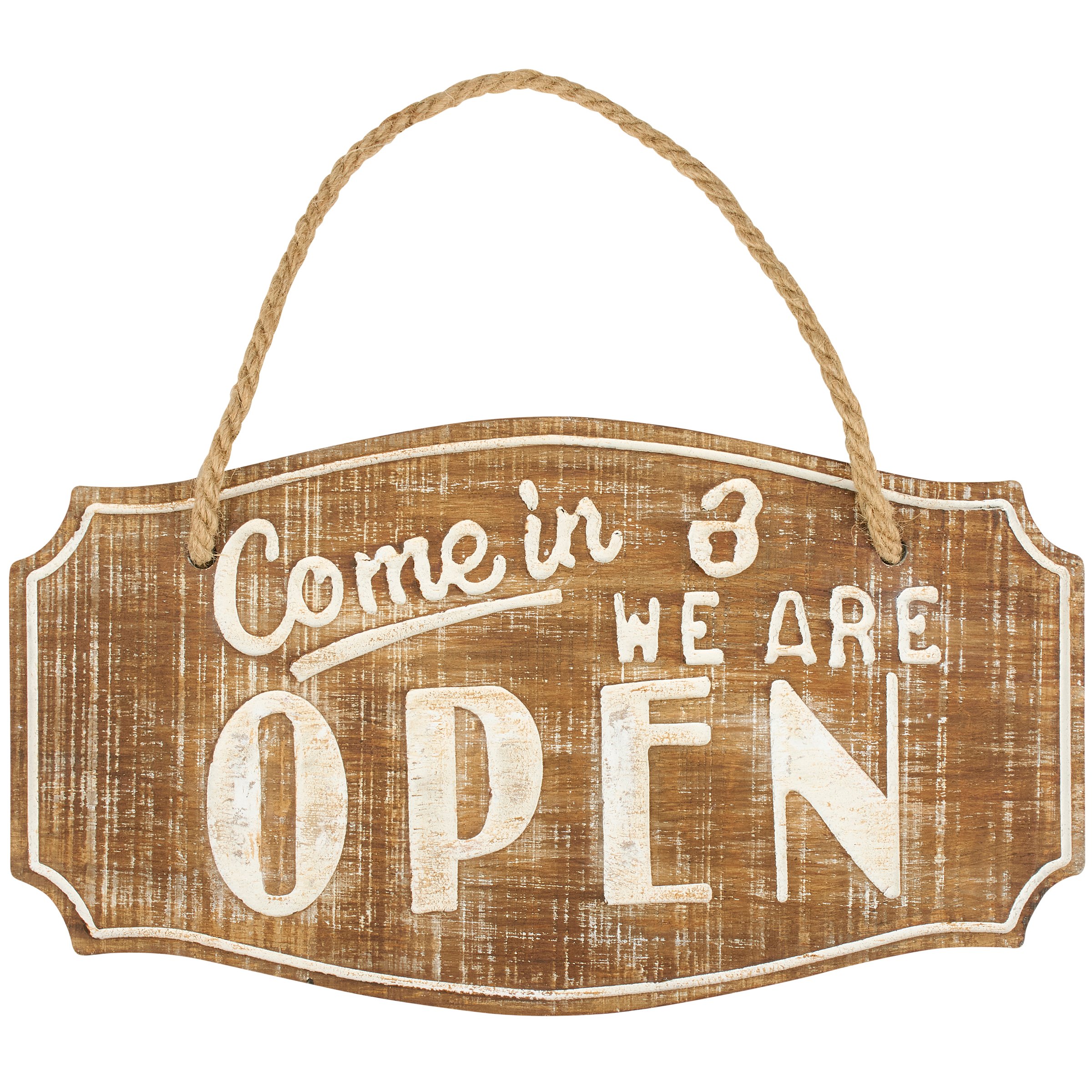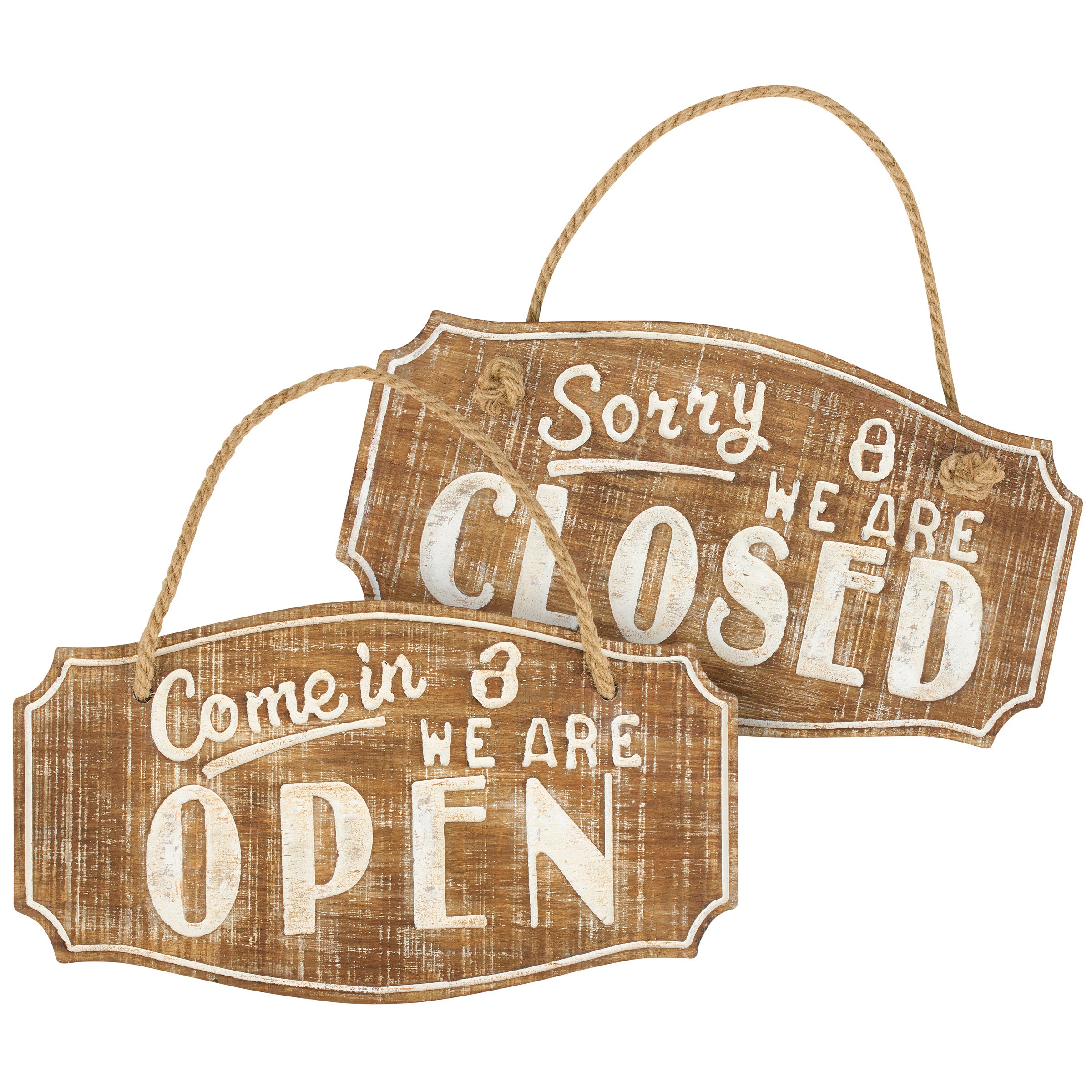 A wooden hanging décor piece from our Homestead Collection featuring a open/closed sign inspired design displaying double-sided sentiments that read "Come In - We Are Open" and "Sorry We Are Closed" with matching lock designs. Sign design also features debossed details for added dimension. Our Open/Closed hanging decor is easy to hang on a wall or doorknob for display via the attached jute hanger. A rustic home accent that coordinates well with farmhouse home decor.