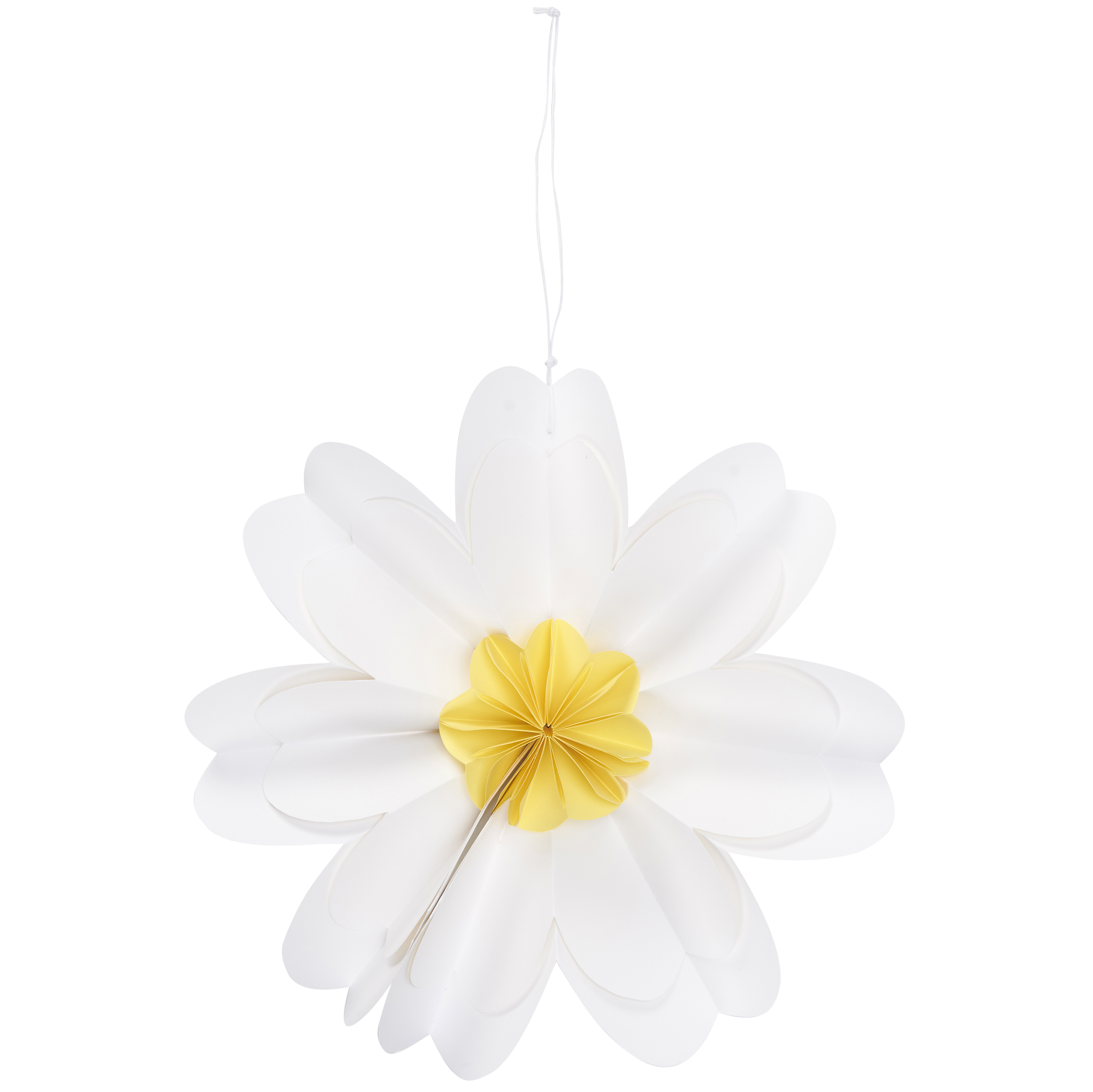 A hanging décor piece from our Garden Collection displaying a large daisy in a folded paper design. Our Paper Daisy hanging décor is easy to display using the attached string hanger. To display, unfold and attach ends via magnetic closure. Paper daisy folds up flat when not in use for easy storage. A charming daisy-themed home accent perfect for any room or for event decorations.