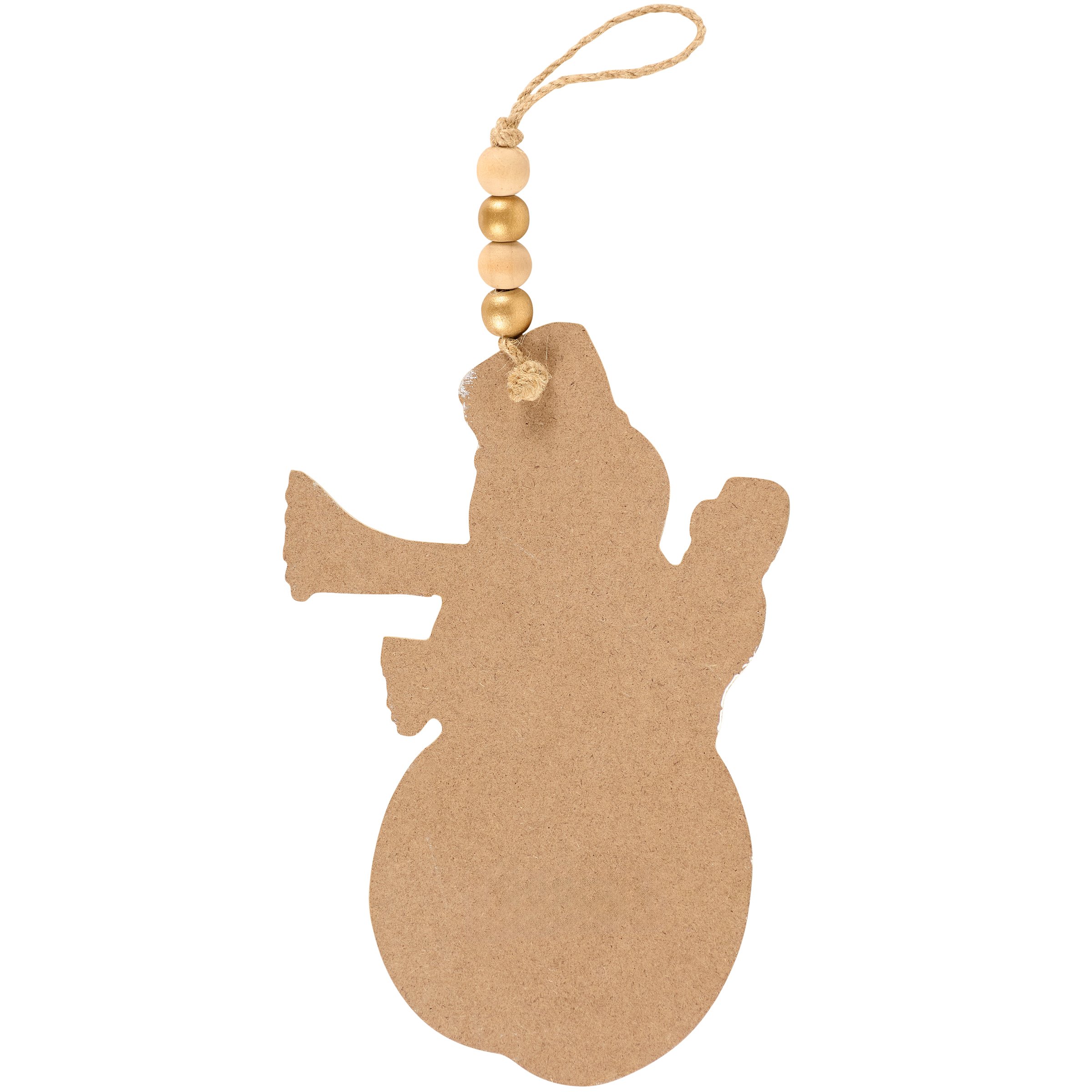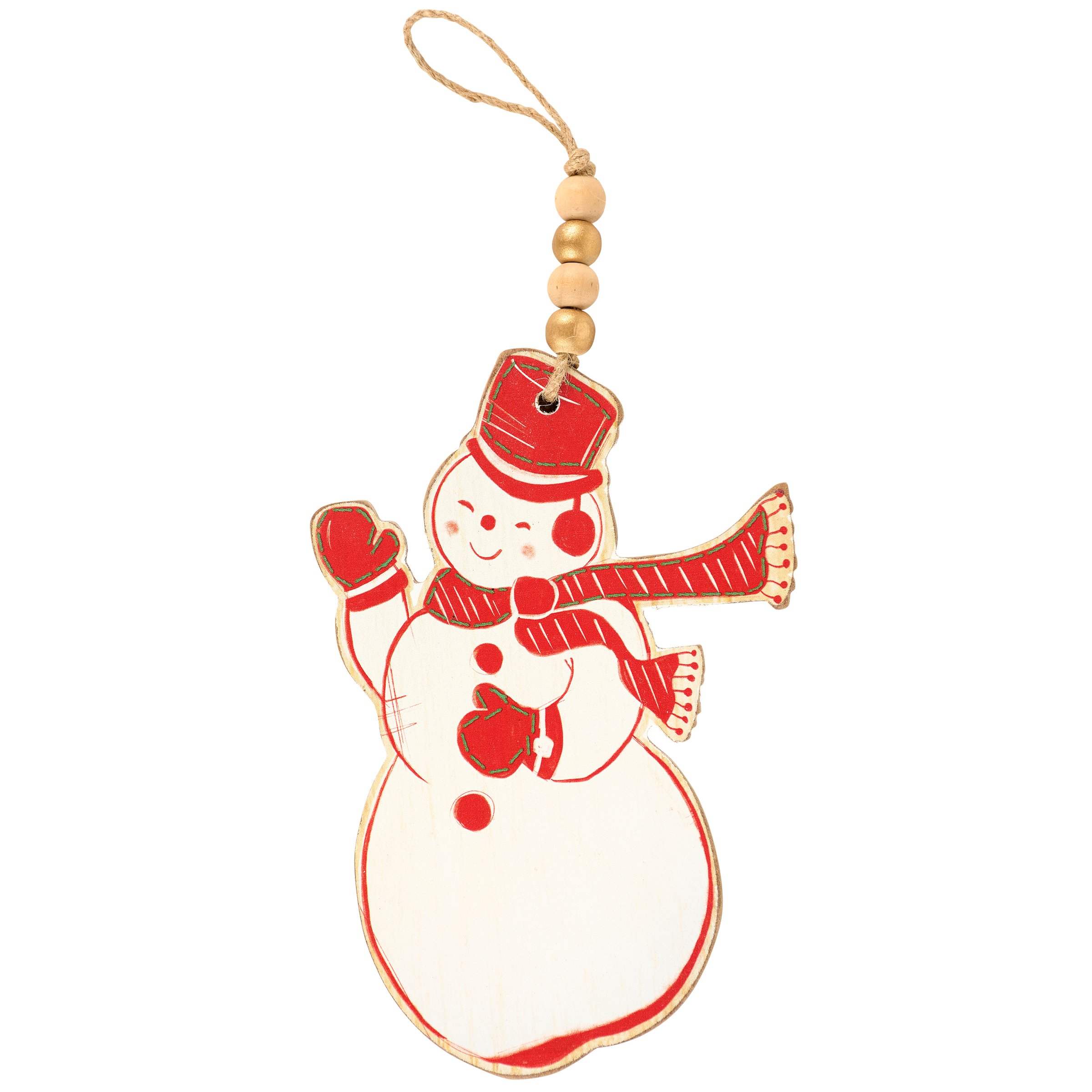 A hanging decor piece from our Christmas Collection displaying a wooden cutout of a fun retro snowman design attached to a jute string with natural wood and metallic gold beads. Our Snowman hanging decor is easy to hang for display via the attached jute loop. A fun retro Christmas home accent perfect for seasonal display.