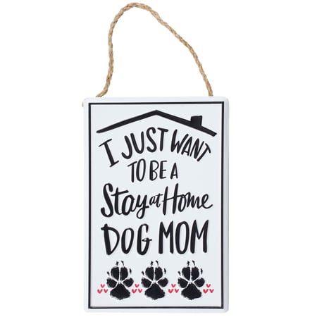 A metal décor piece from our Pet Collection displaying a hand illustrated design of a house roof with paw prints and hearts around a fun dog inspired sentiment that reads "I Just Want To Be A Stay At Home Dog Mom." This funny pet sign features embossed details to accent the original hand illustrated art for added dimension. Our metal Stay At Home Dog Mom sign is easy to hang on a wall or doorknob for display via the attached jute hanger. A fun dog-themed gift perfect for showing off a love for pets in any home or work space.