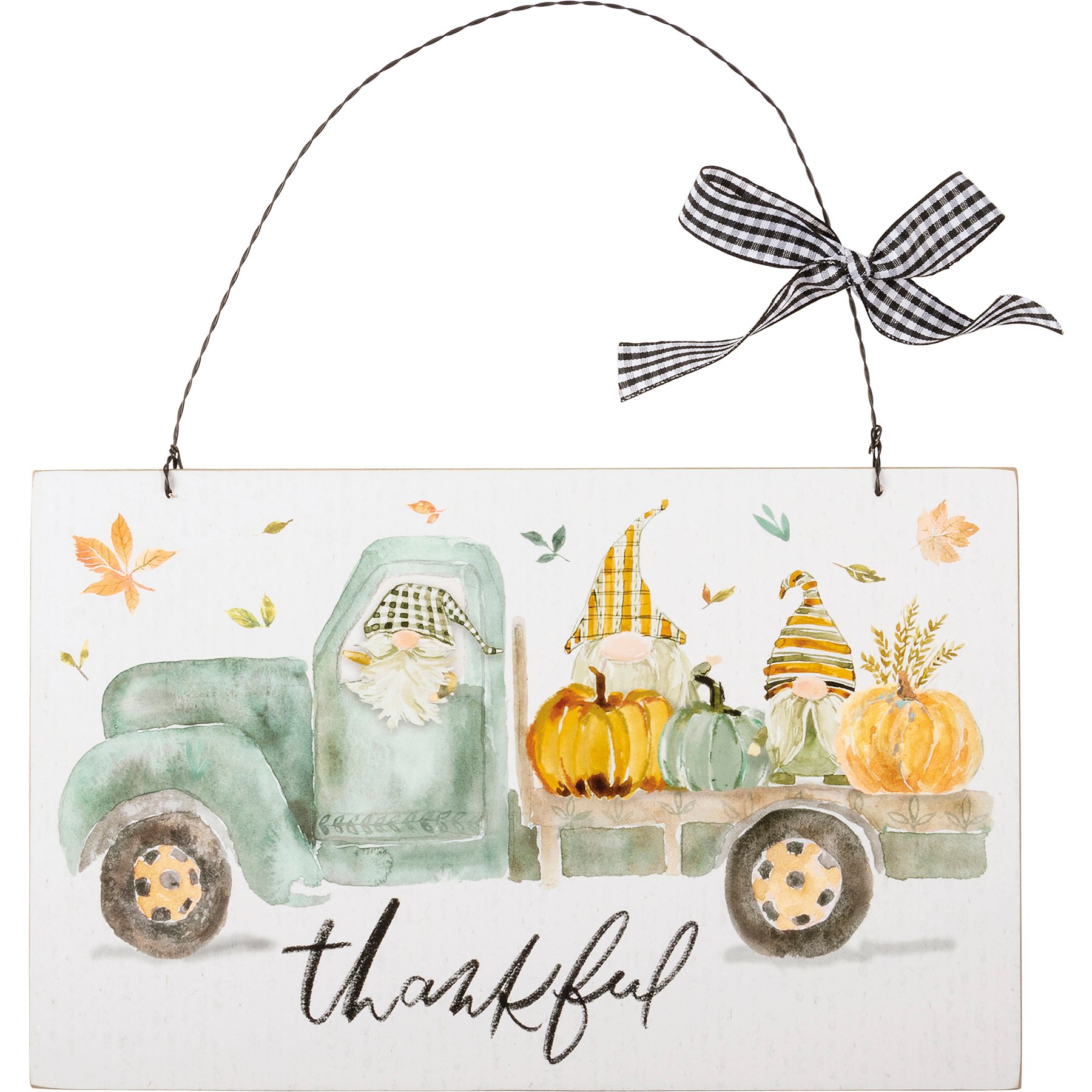 A hanging wood sign featuring watercolor gnome, truck, and fall botanical art and hand lettered "Thankful" sentiment. Wooden wall art hangs easily by attached twisted wire loop and includes plaid bow for added interest.