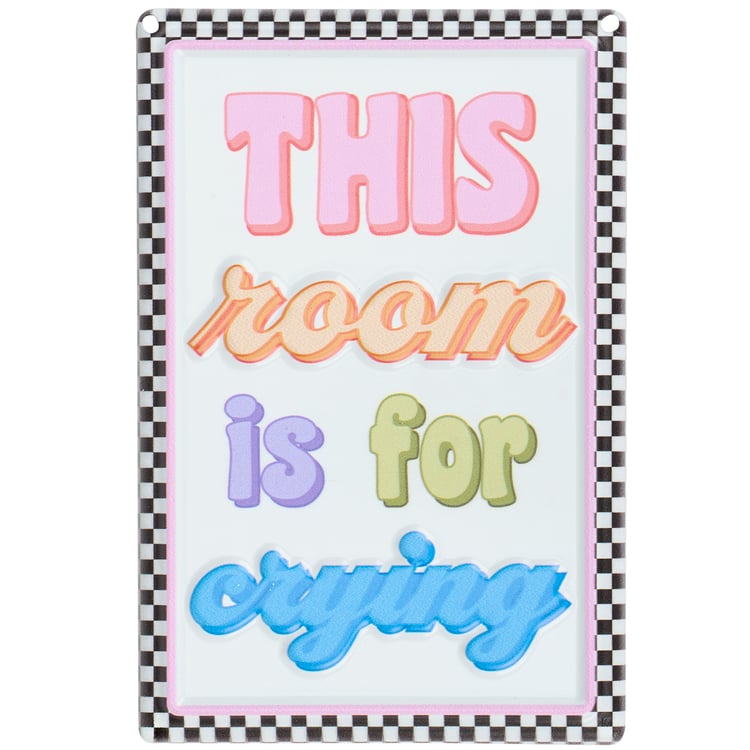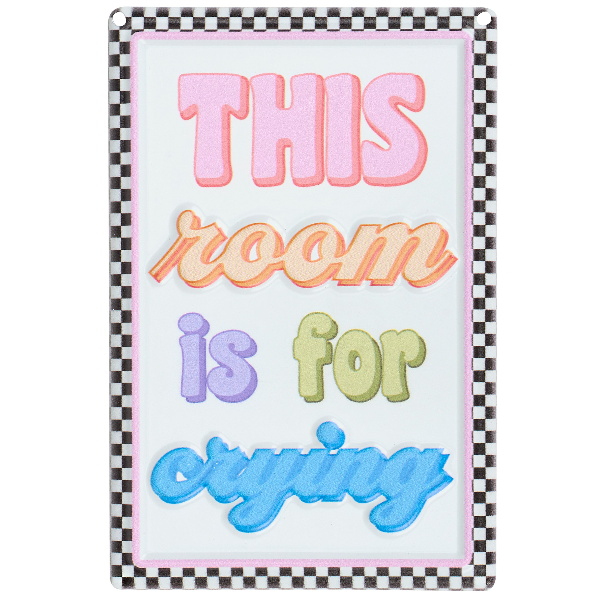 Easily add personality to any space with designs that "pop" off the wall in more ways than one. This ready to hang metal décor piece features an eye-catching relatable design full of self-expression with embossed details for added dimension. Show them the way to the emotion zone with this cute retro inspired design of a relatable sentiment that reads "This Room Is For Crying." Our This Room Is For Crying metal wall décor is easy to hang against wall using the included mounting hardware and pre-drilled holes in each corner. Expressive wall decor that is great for gifting!