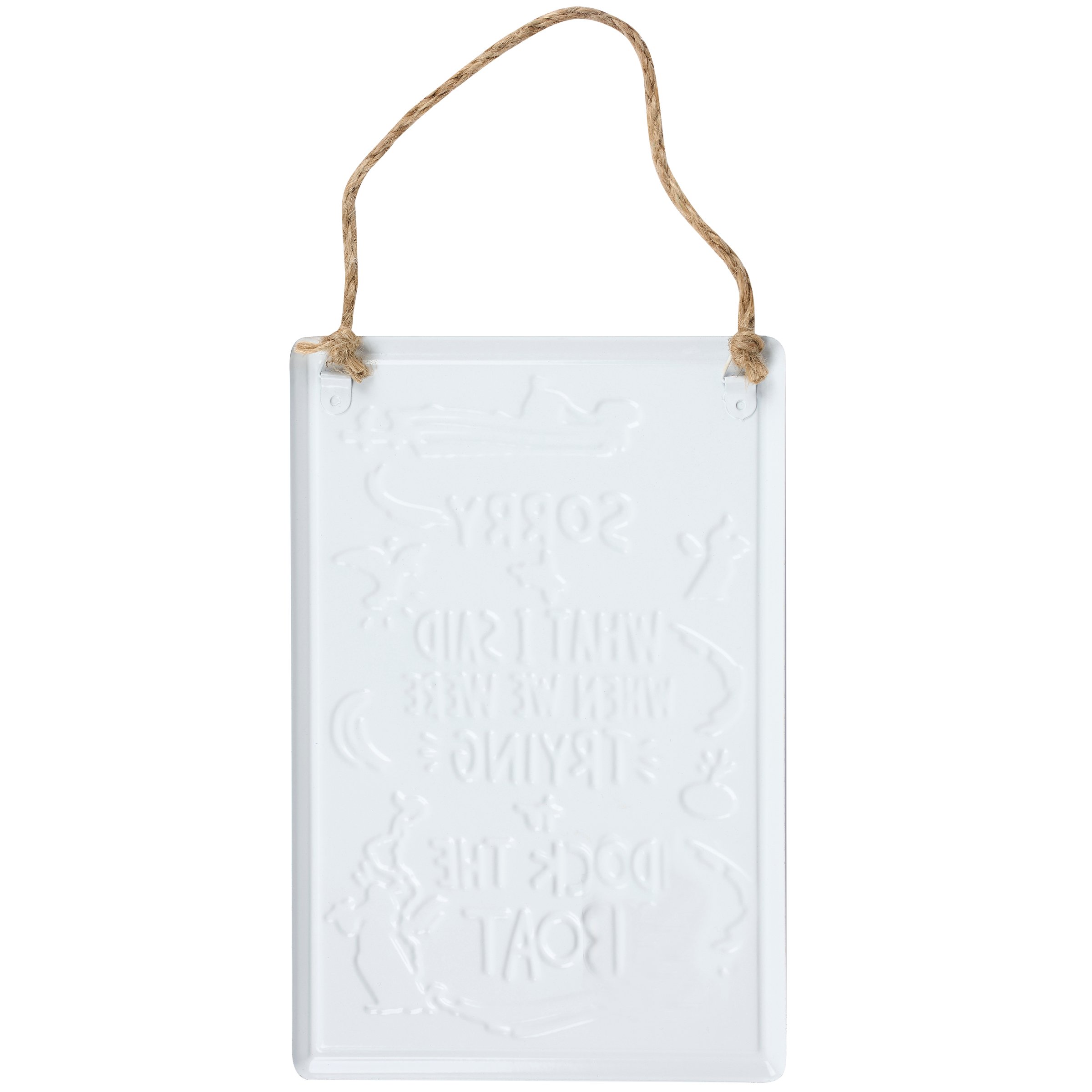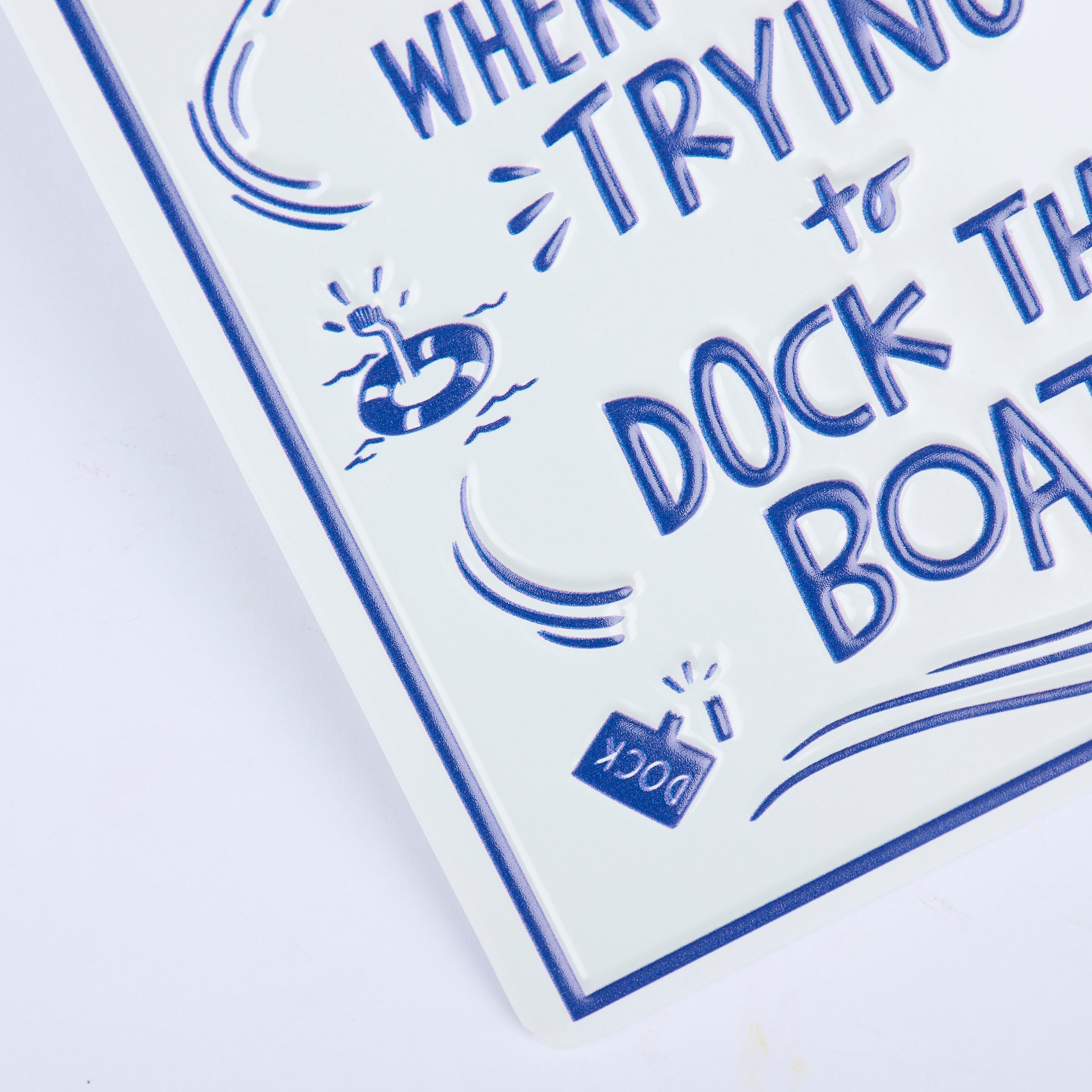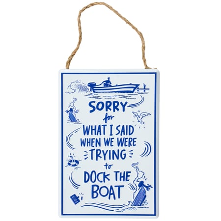 A metal décor piece from our Lake & Cabin Collection displaying hand illustrated boating designs with a fun boat inspired sentiment that reads "Sorry For What I Said When We Were Trying To Dock The Boat." This funny boat sign features embossed details and lake blue color to accent the original hand illustrated art. Our metal Trying To Dock The Boat sign is easy to hang on a wall or doorknob for display via the attached jute hanger. A fun boat-themed gift perfect for boats or lake house decorating.