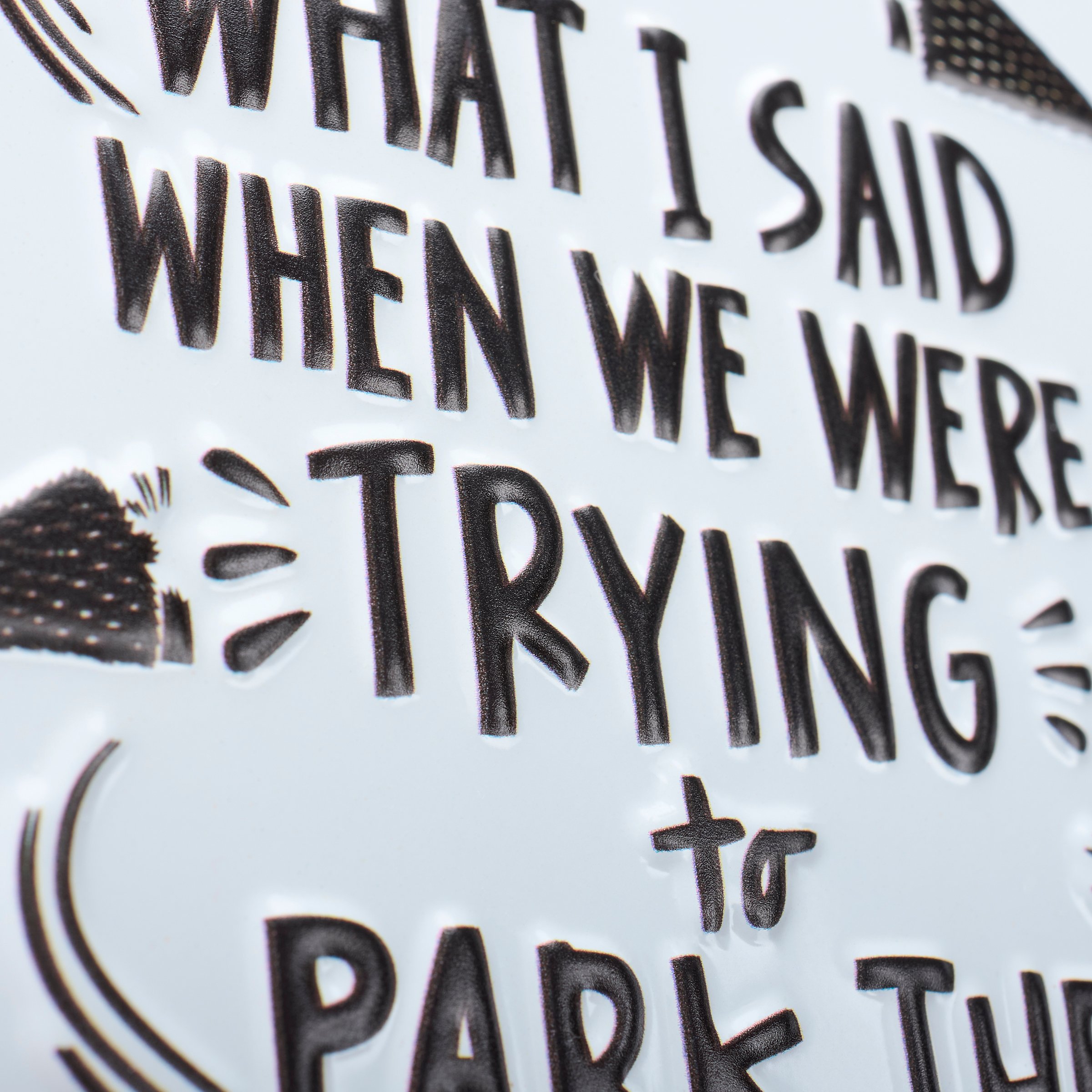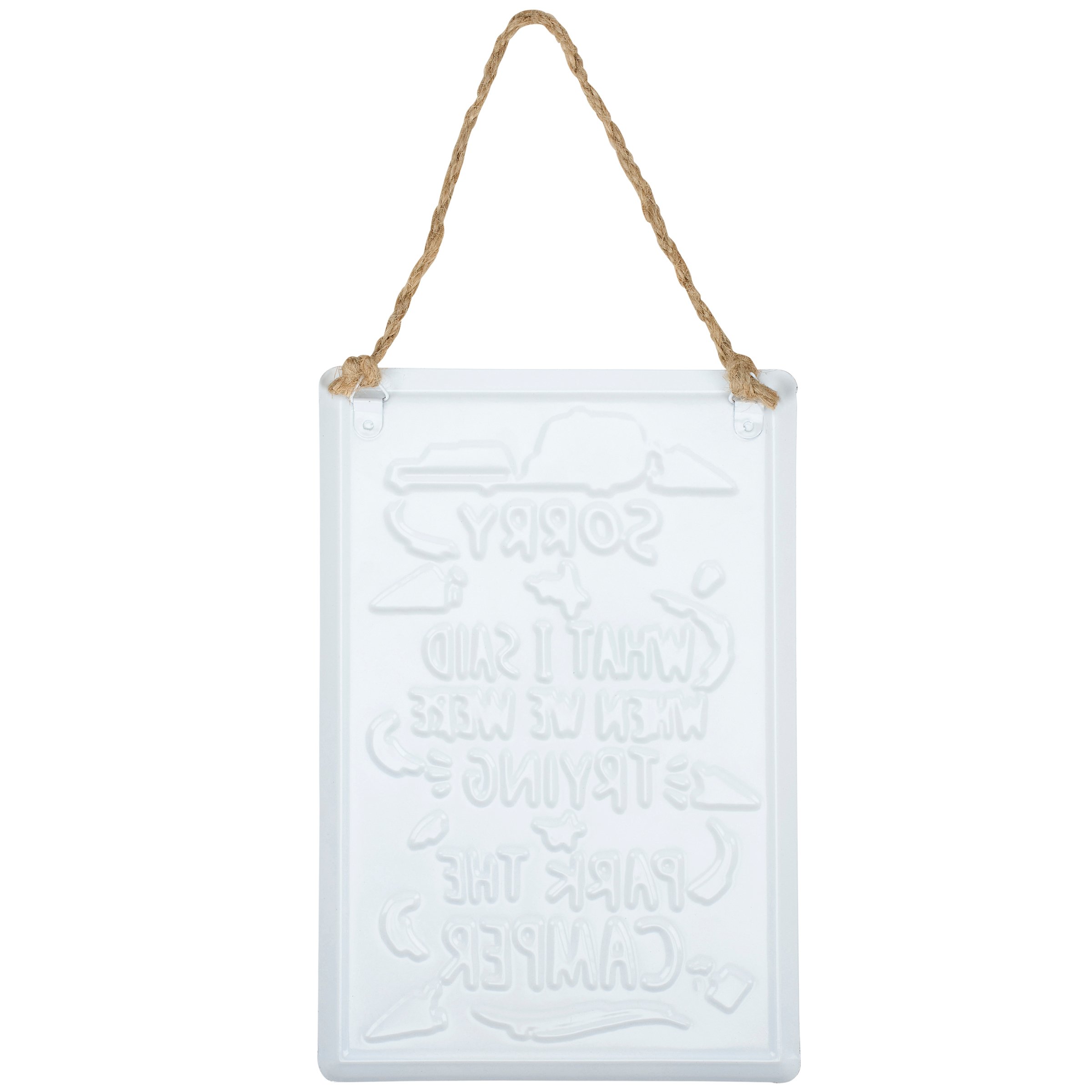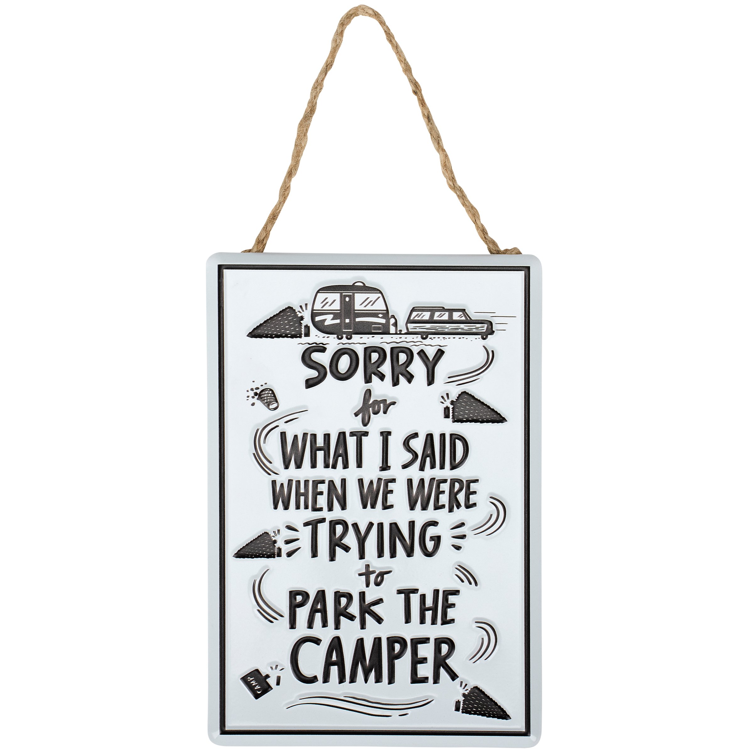 A metal décor piece from our Lake & Cabin Collection displaying a hand illustrated design of a camper driving through trees with a fun camping inspired sentiment that reads "Sorry For What I Said When We Were Trying To Park The Camper." This funny camper sign features embossed details to accent the original hand illustrated art. Our metal Trying To Park The Camper sign is easy to hang on a wall or doorknob for display via the attached jute hanger. A fun camping-themed gift perfect for campers or cabin decorating.