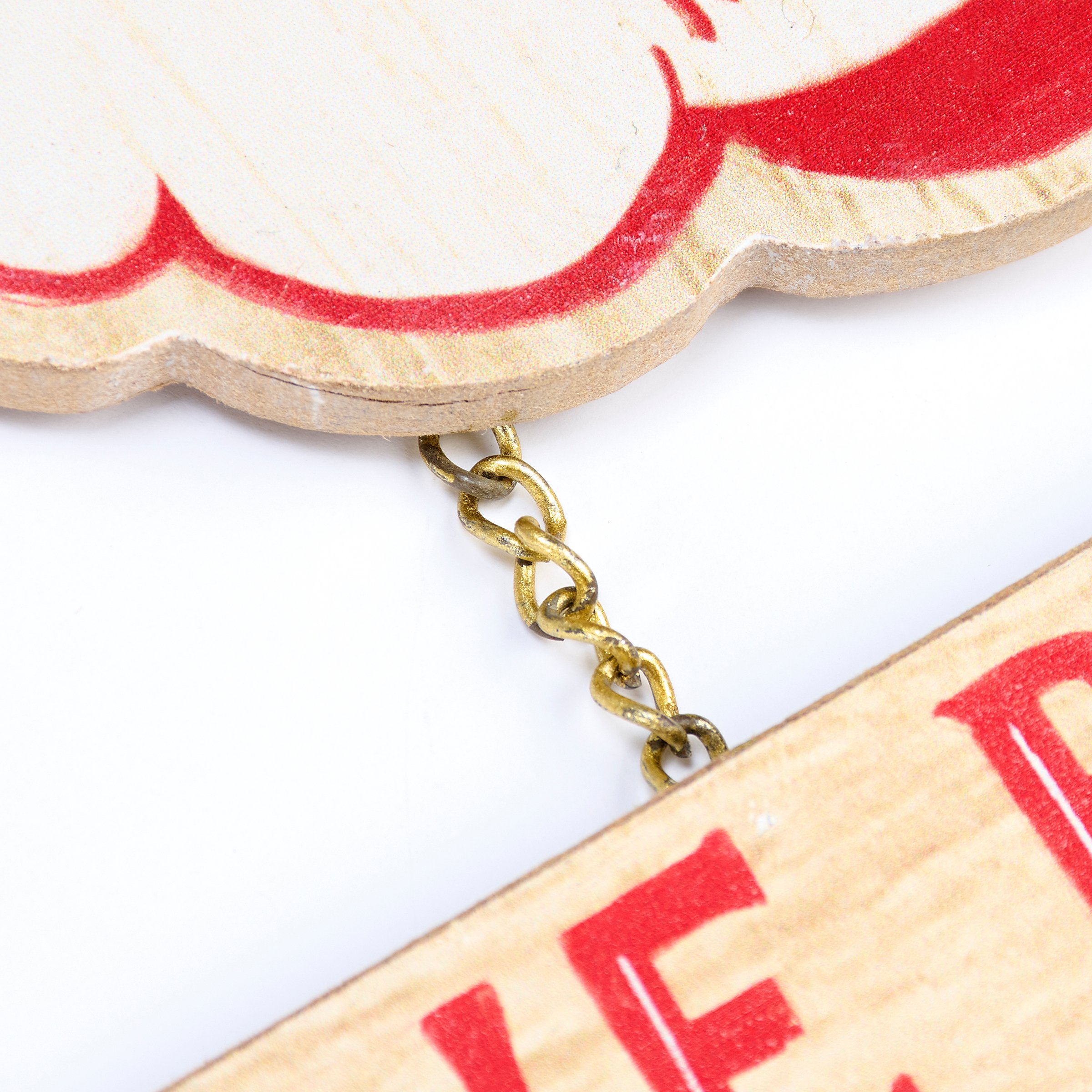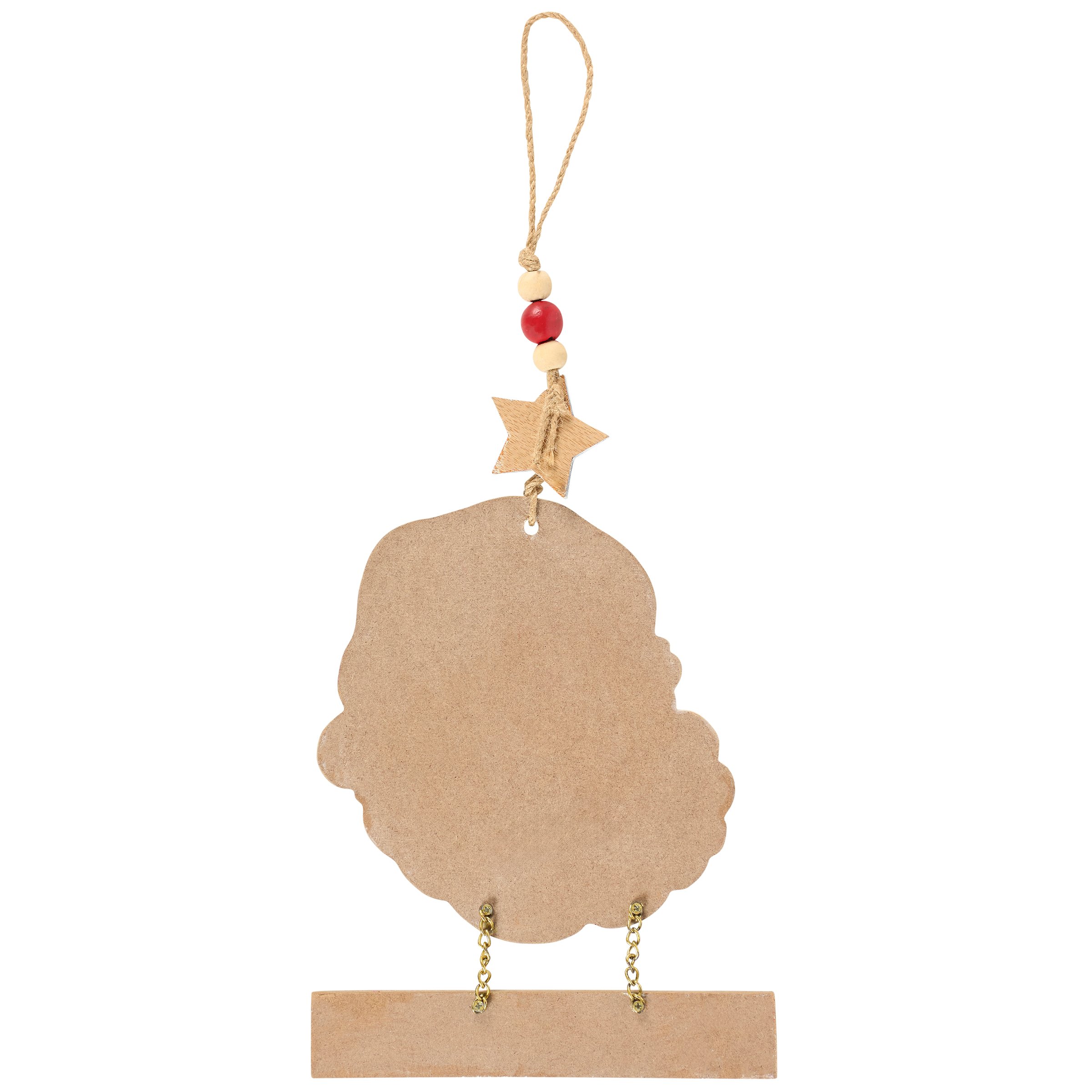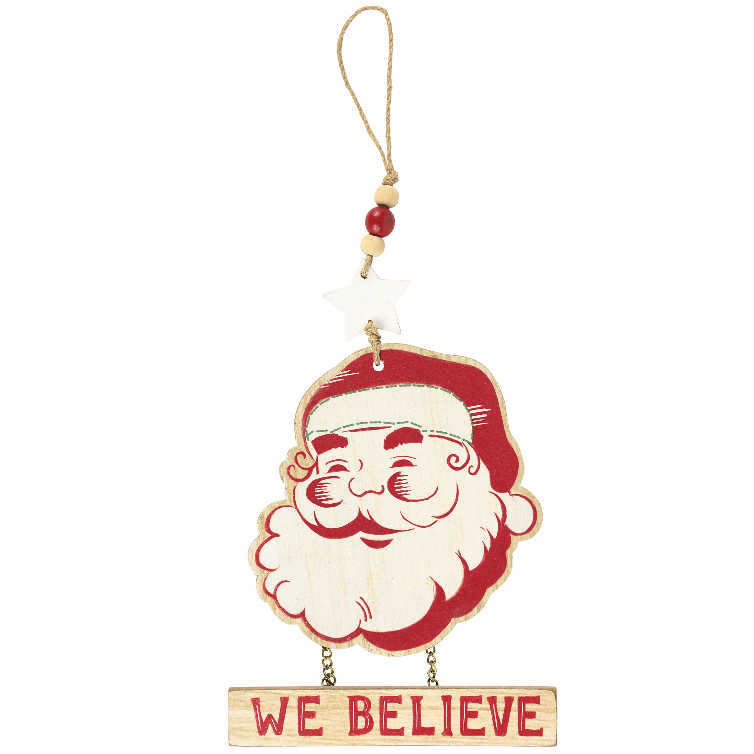 A hanging decor piece from our Christmas Collection displaying a wooden cutout of a fun retro Santa head design with a wooden sign hanging on chains that reads "We Believe." Santa hanging decor is attached to a jute string loop featuring a wooden star and wooden beads. Our We Believe hanging decor is easy to hang for display via the attached jute loop. A fun retro Christmas home accent perfect for seasonal display.