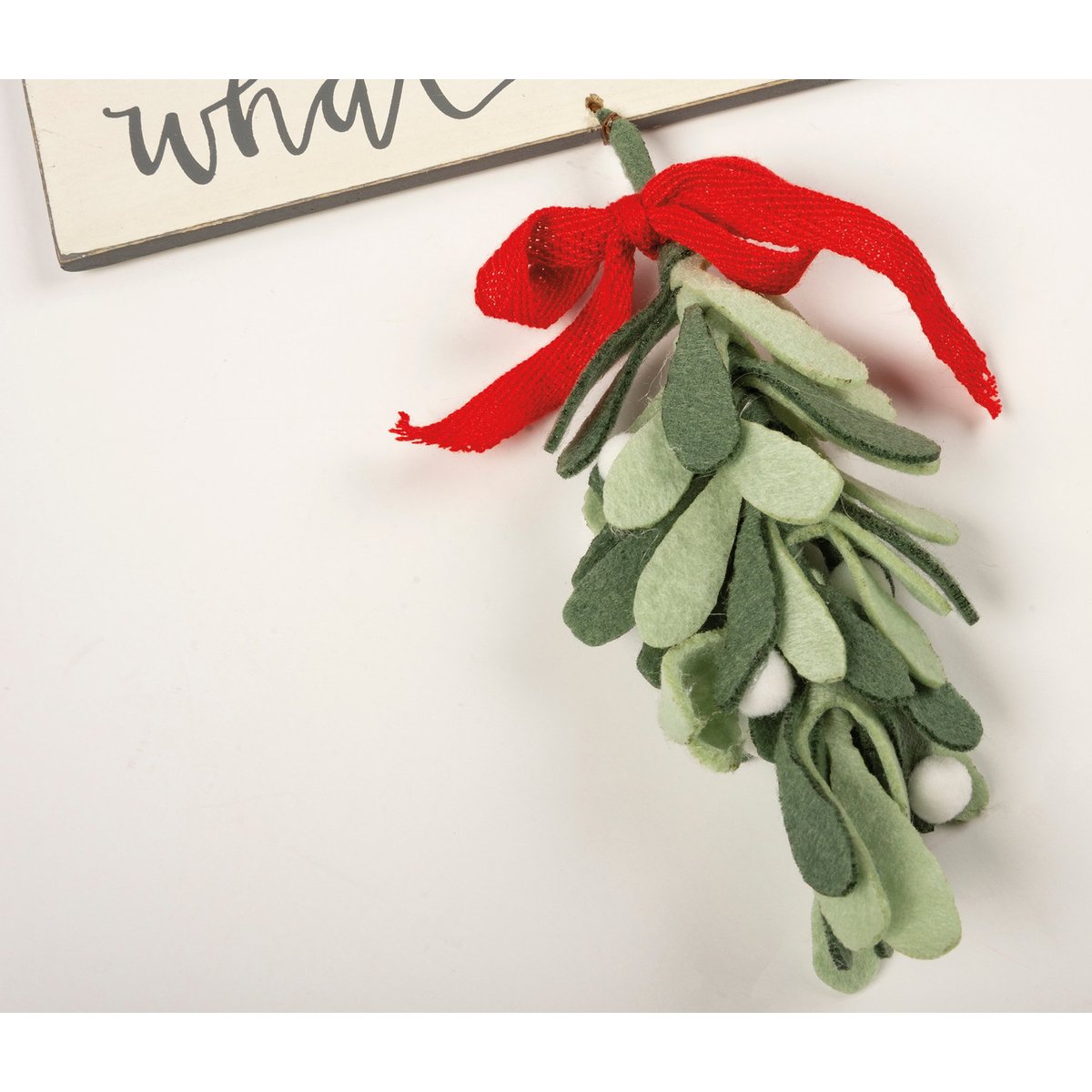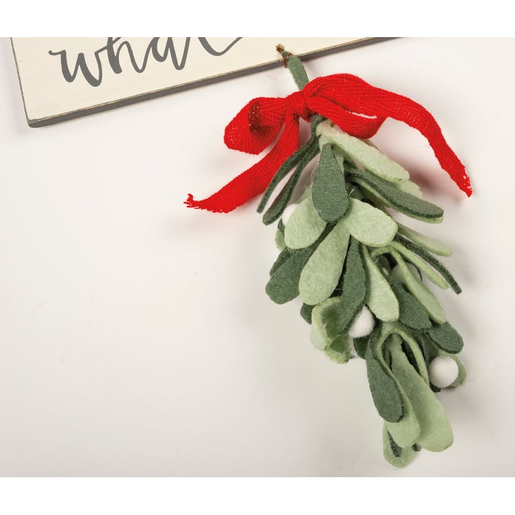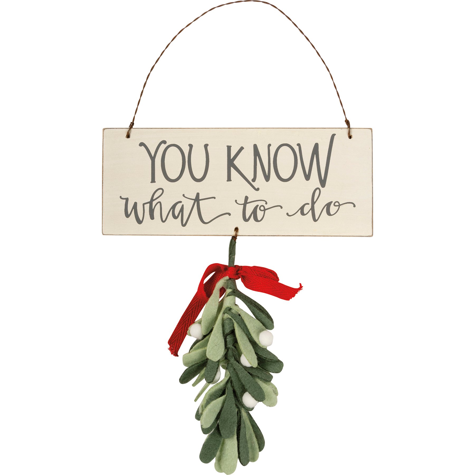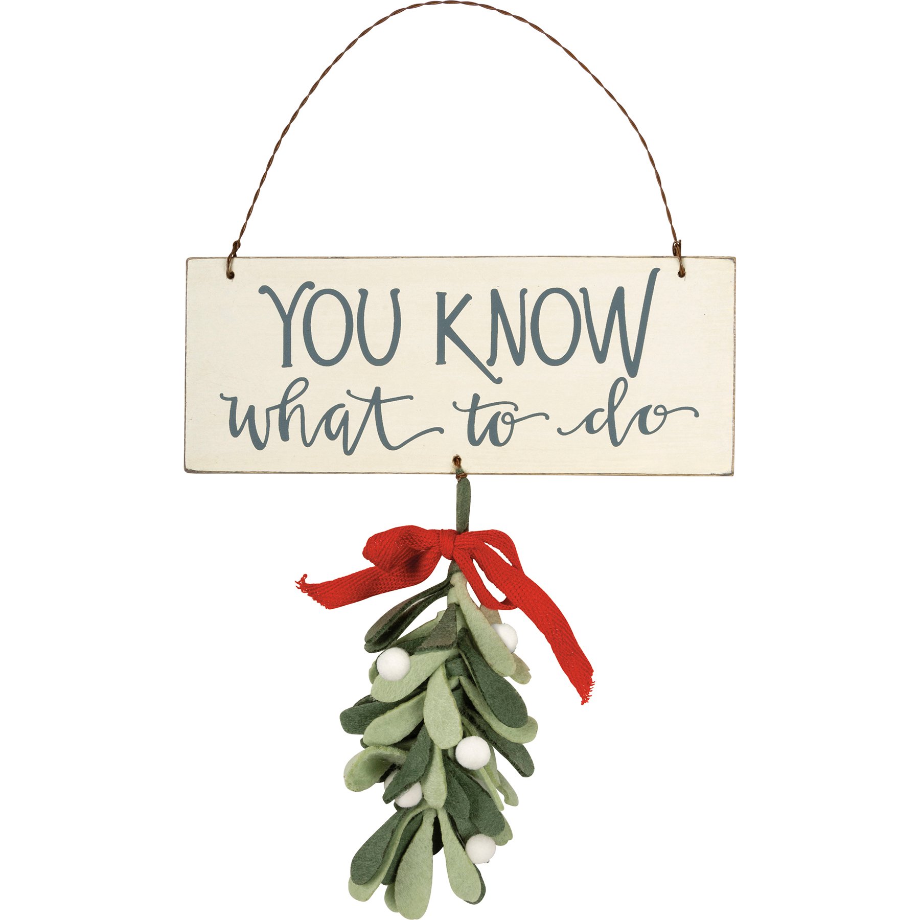 A wooden hanging décor piece featuring a hand lettered "You Know What To Do" sentiment. Includes hanging felt mistletoe element for added interest. Easily hangs by twisted wire loop.