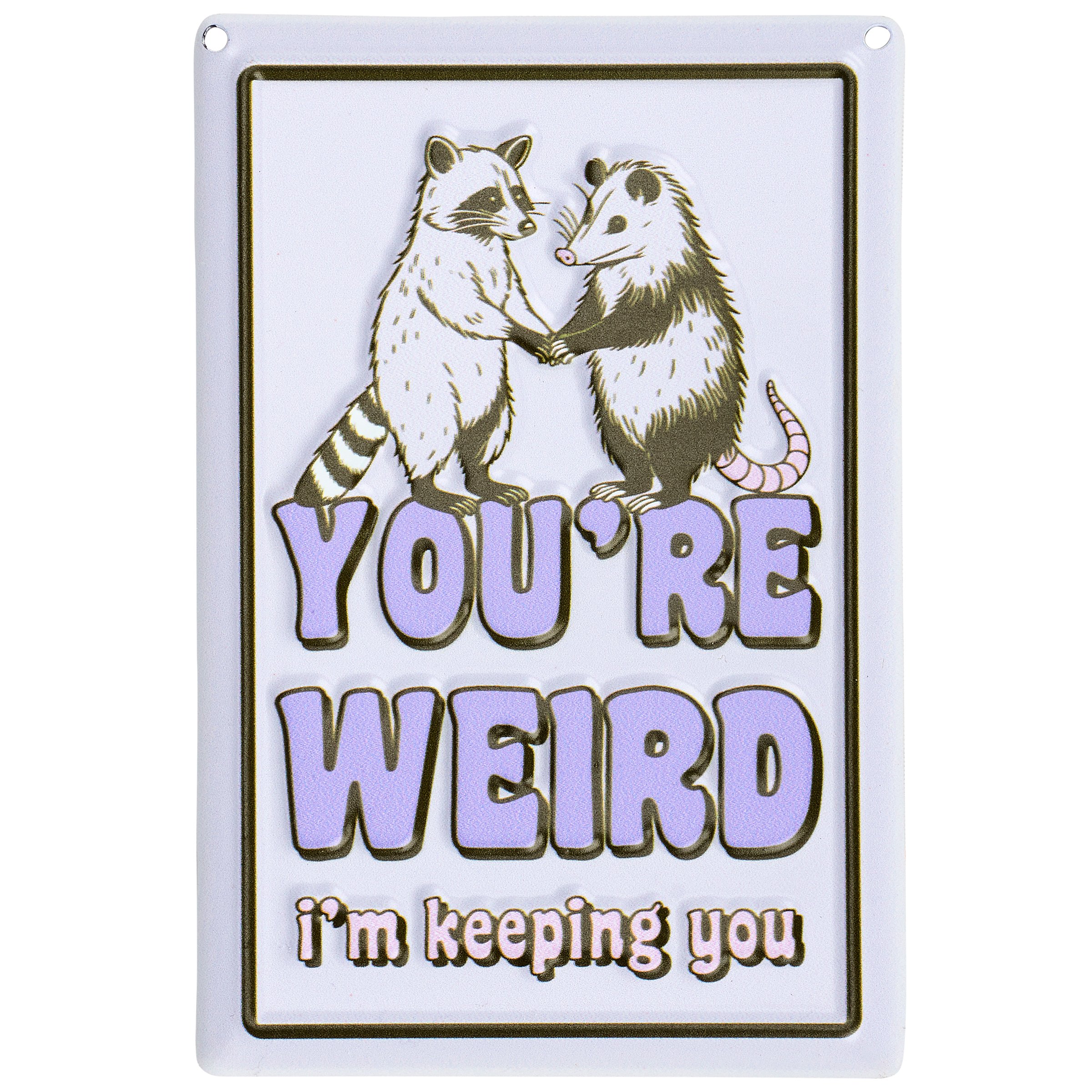 Easily add personality to any space with designs that "pop" off the wall in more ways than one. This ready to hang metal décor piece features a colorful eye-catching design full of self-expression with embossed details for added dimension. Put a call out to all fellow weirdos with this cute design of a raccoon and possum holding hands above a "You're Weird - I'm Keeping You" sentiment. Our You're Weird metal wall décor is easy to hang against wall using the included mounting hardware and pre-drilled holes in each corner. A fun gift for like-minded friends and family to remind them who their special someone is.