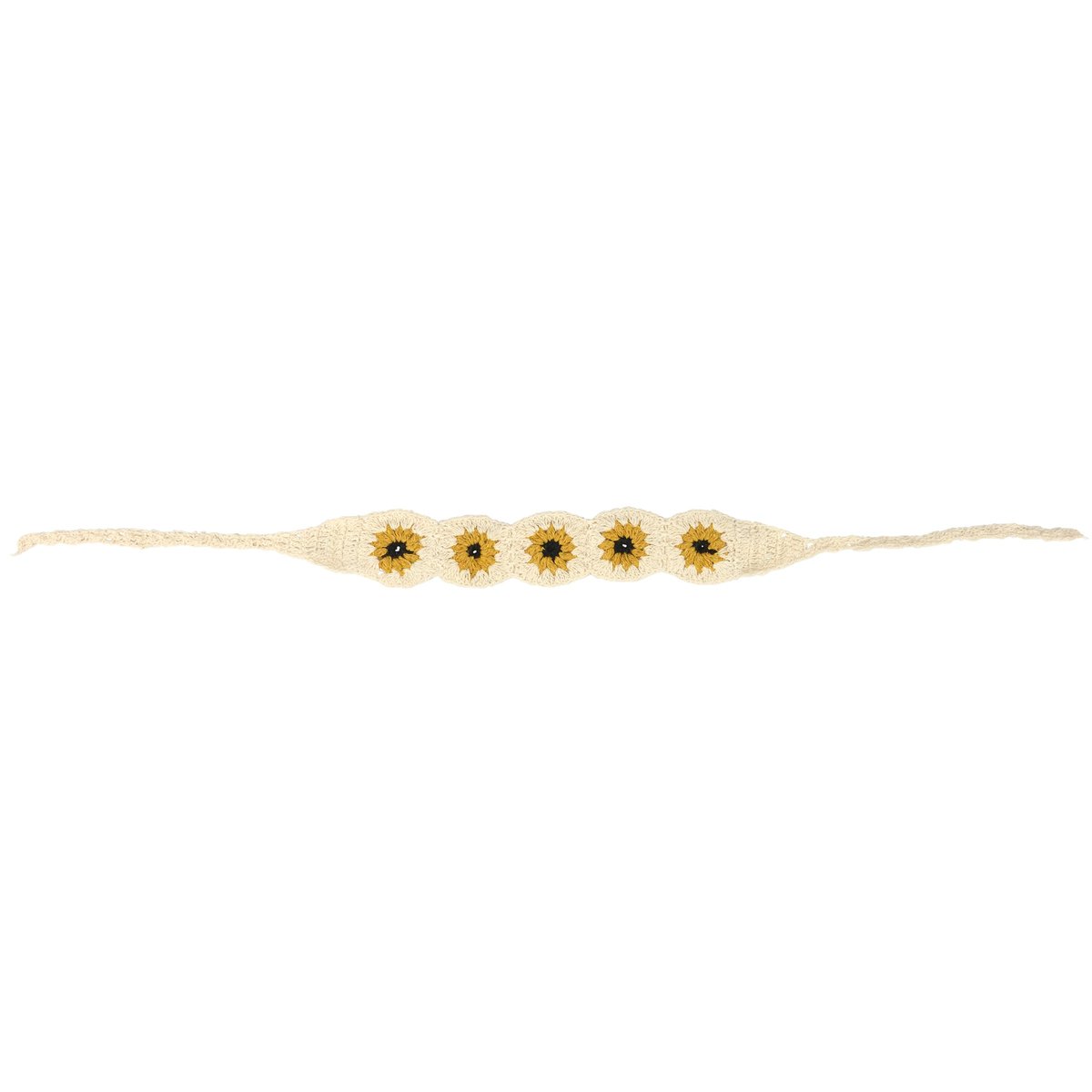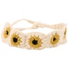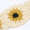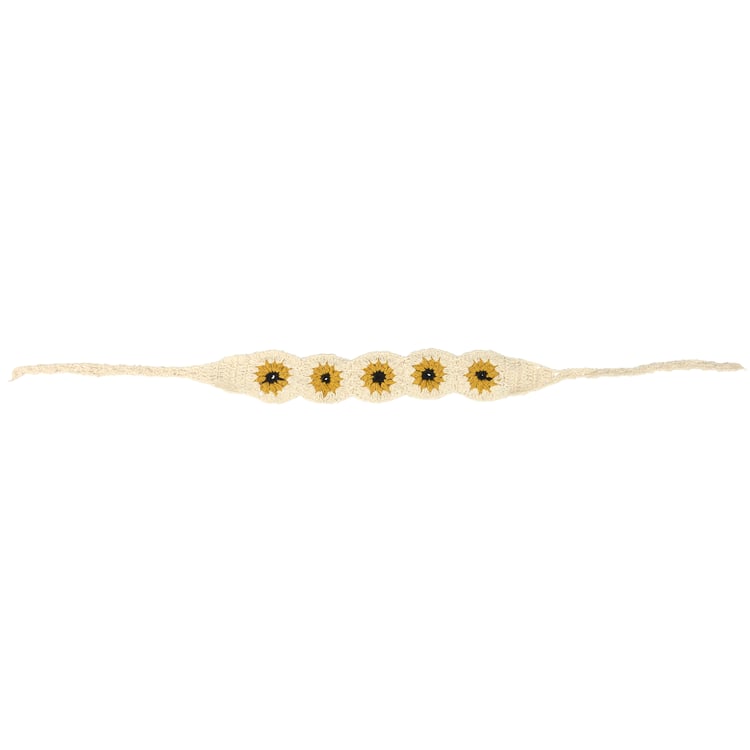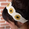 A stylish cotton headband from our Cottagecore Collection displaying a crochet inspired design of sunflowers for a unique handmade style. Crochet headband features five sunflower designs across the top where it sits on the head leading to cotton ties to create the perfect fit. Our Sunflowers headband is a cute nature-themed hair accessory great for gifting.