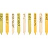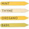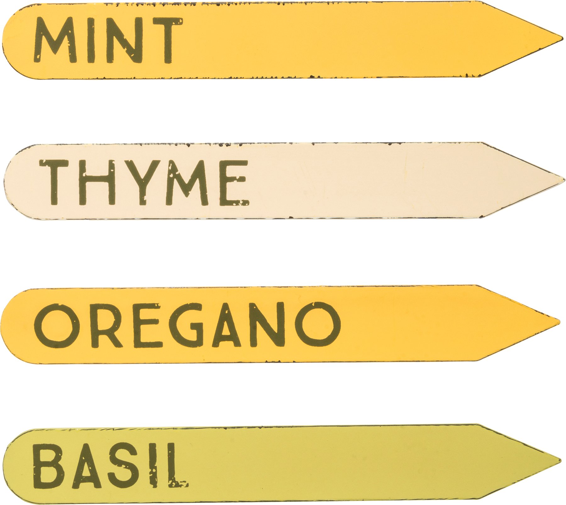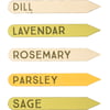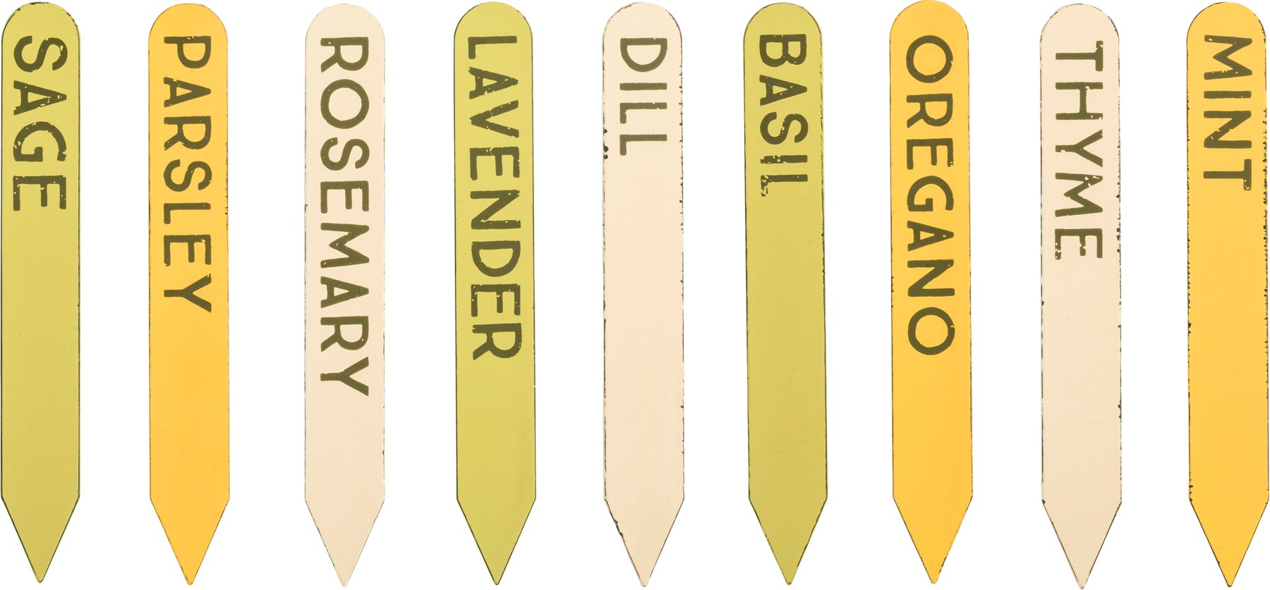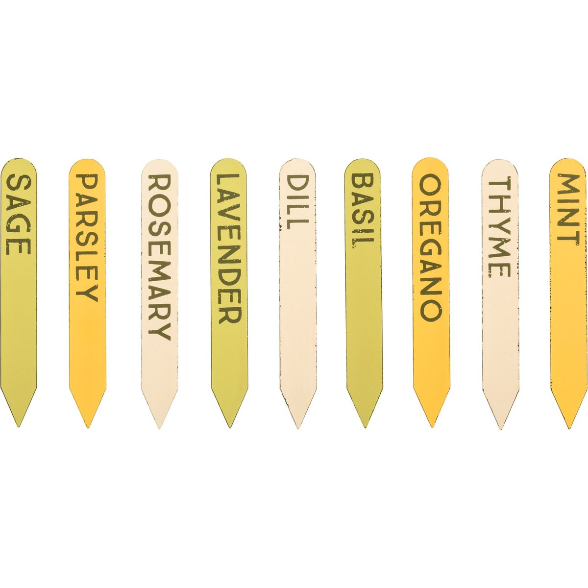 A set of nine metal garden markers lending "Mint," "Thyme," "Oregano," "Basil," "Dill," "Lavendar," "Rosemary," "Parsely," and "Sage" sentiments to colorfully organize a spice and herb garden.