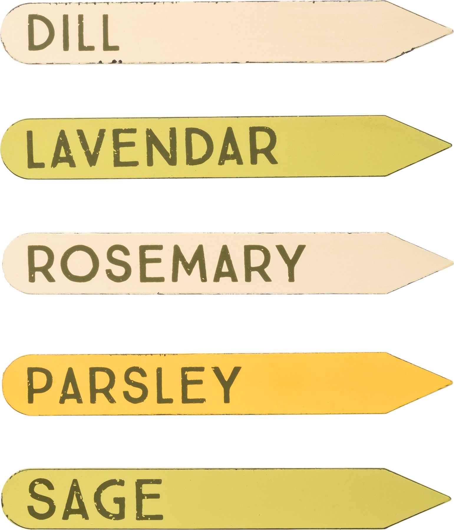 A set of nine metal garden markers lending "Mint," "Thyme," "Oregano," "Basil," "Dill," "Lavendar," "Rosemary," "Parsely," and "Sage" sentiments to colorfully organize a spice and herb garden.