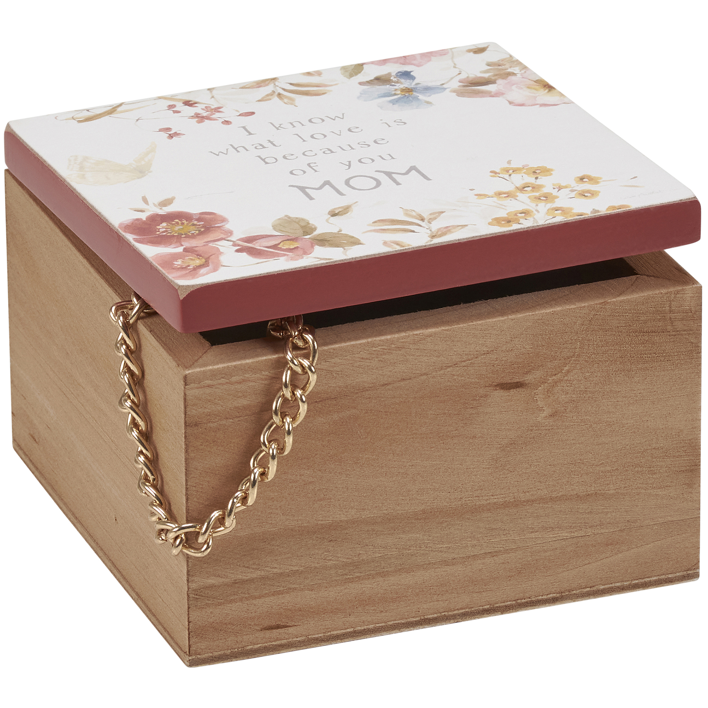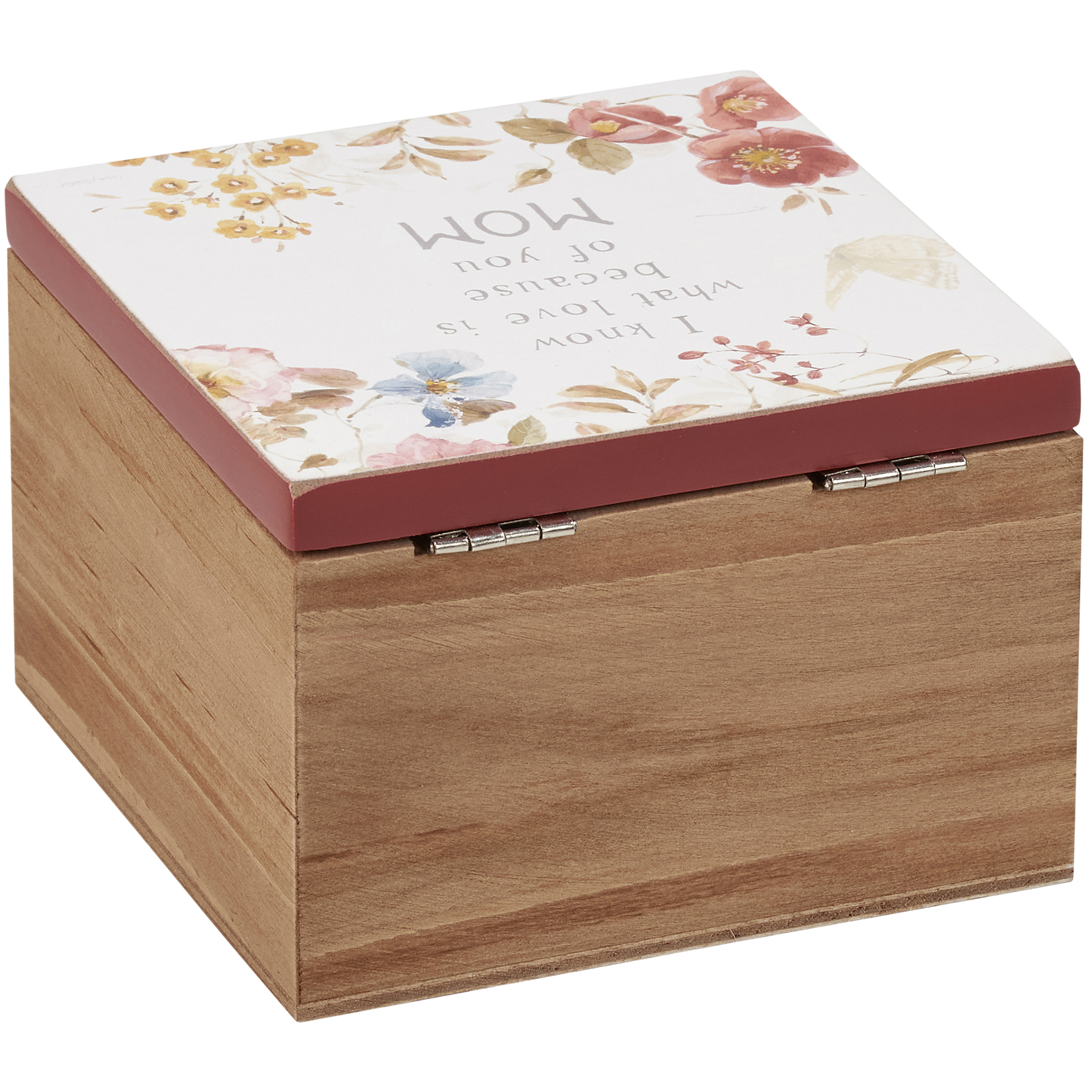 A wooden hinged box from our Mother's Day Collection displaying an elegant hand painted design on the lid with coordinating red color on the sides and bottom. Design features a butterfly and colorful flowers surrounding a heartwarming sentiment that reads "I Know What Love Is Because Of You Mom." Box is made of natural wood for added interest. Our Because Of You Mom hinged box is perfect for storing daily keepsakes. A lovely gift perfect for Mother's Day or as a functional everyday home accent.