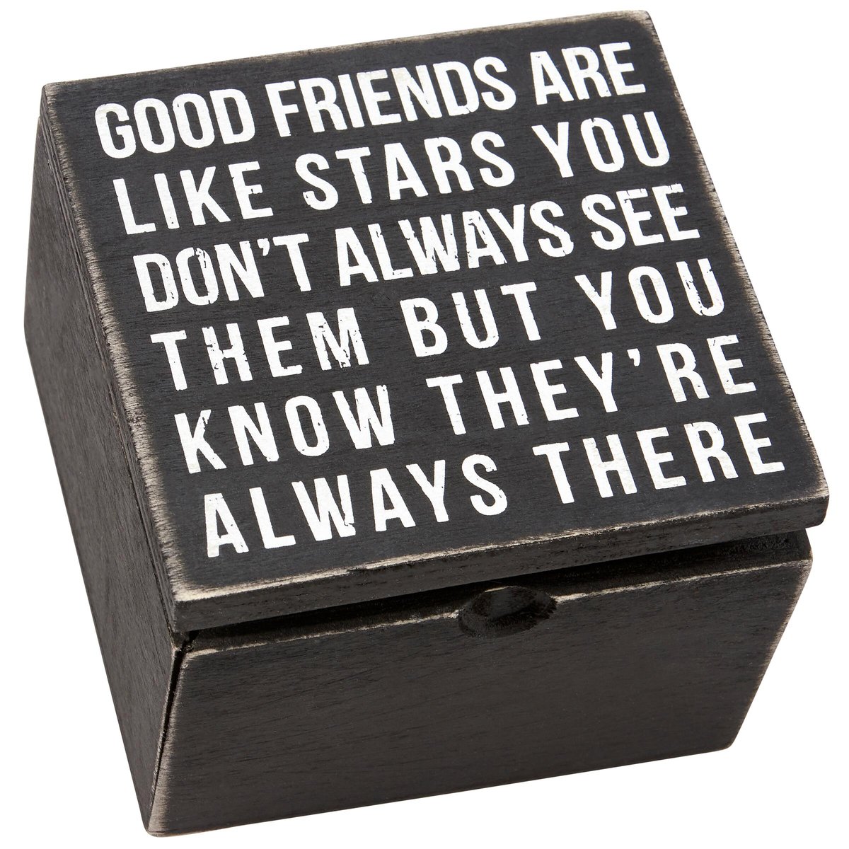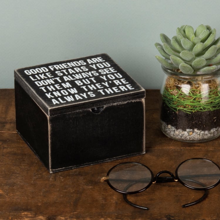 A black and white wooden hinged box featuring a distressed "Good Friends Are Like Stars - You Don't Always See Them But You Know They're Always There" top sentiment. This Good Friends Are Like Stars hinged box complements well with existing decor and coordinating box sign pieces.