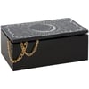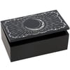 A wooden hinged box from our Mystical Collection displaying a hand illustrated moon design with burst accents on the lid and coordinating black color on the sides. Box is made of natural wood for added interest. Our Moon Burst hinged box is a unique celestial-themed home accent perfect for storing daily keepsakes.