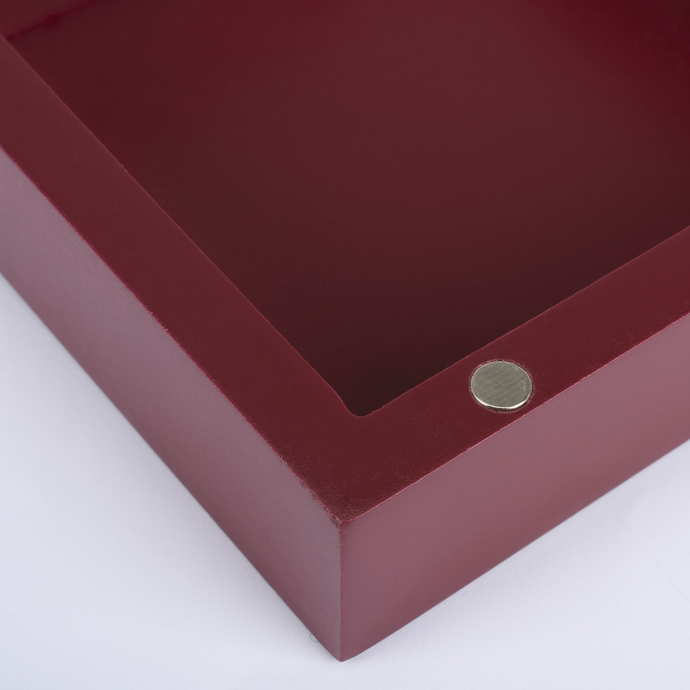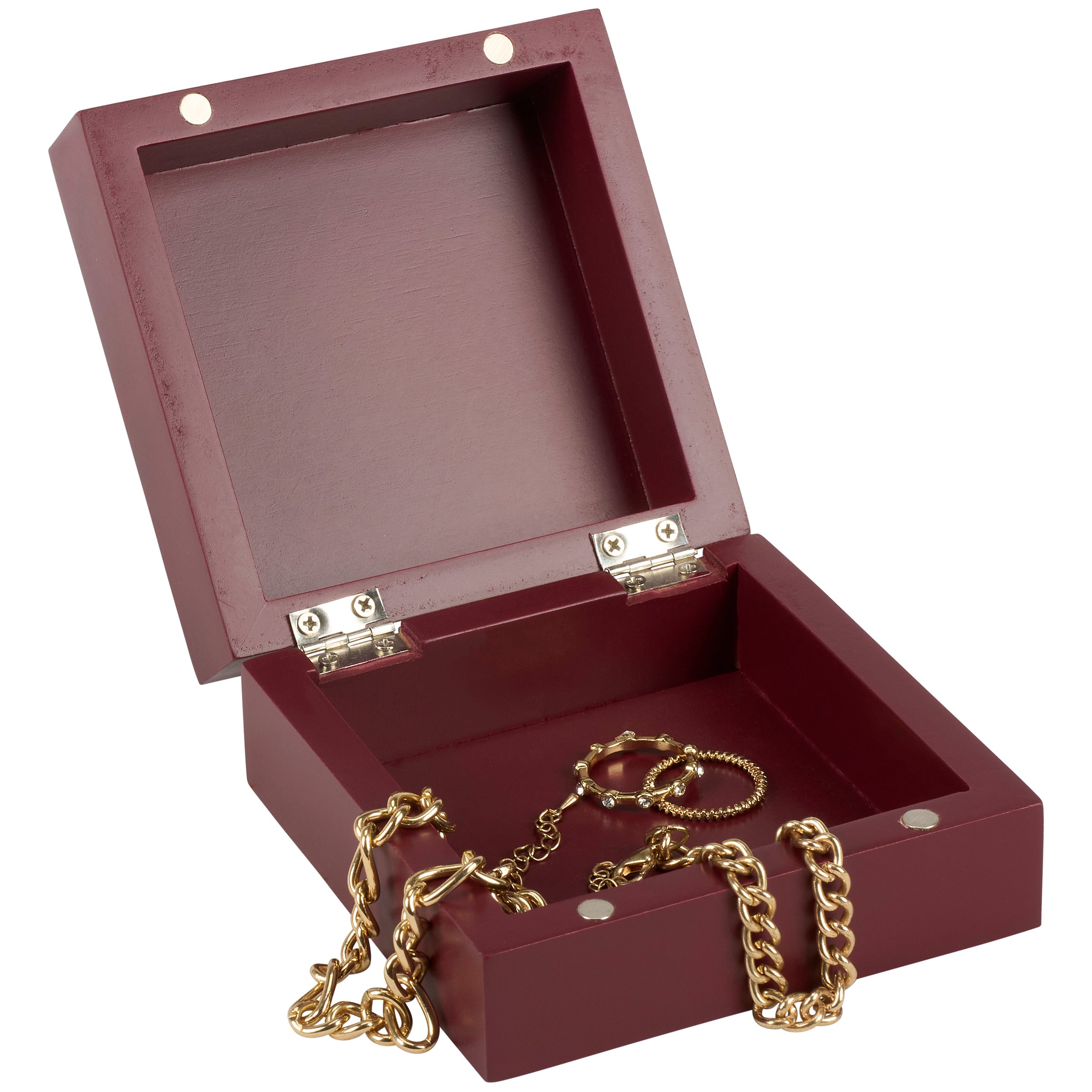 A wooden hinged box from our Valentine's Day Collection displaying a heartwarming scene of moody florals surrounding a fancy mouse gifting a piece of cheese on the lid and coordinating dark red color on the sides. Valentine mouse design is replicated from original artwork painted onto burlap canvas, giving the art a unique depth and texture. Hinged box is made with natural wood and features a magnet closure to keep items secure. Our Love You More Than Cheese hinged box is perfect for storing daily keepsakes as seasonal home decor. A moody love-themed home accent that is great for gifting.