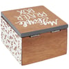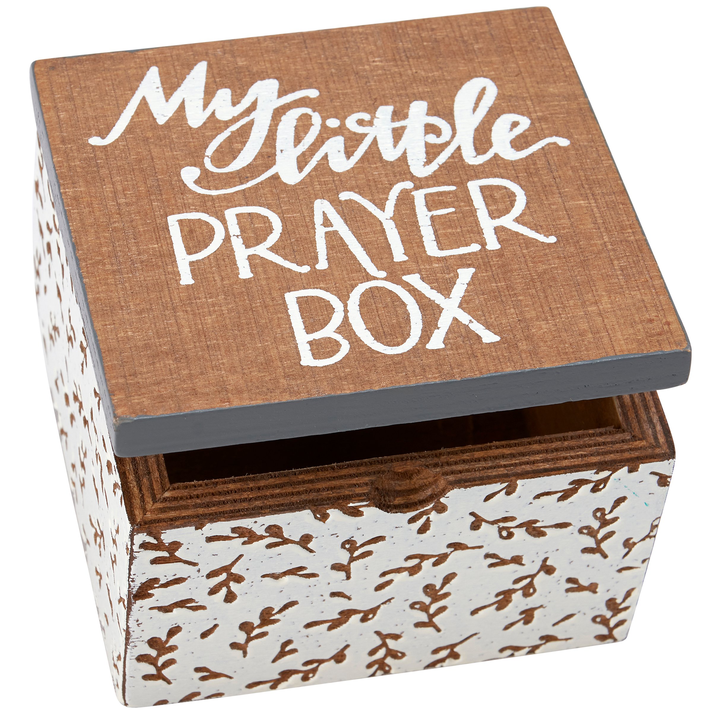 Write down your prayers and store them inside this wooden hinged box featuring debossed botanical designs and hand lettered "My Little Prayer Box" sentiment.