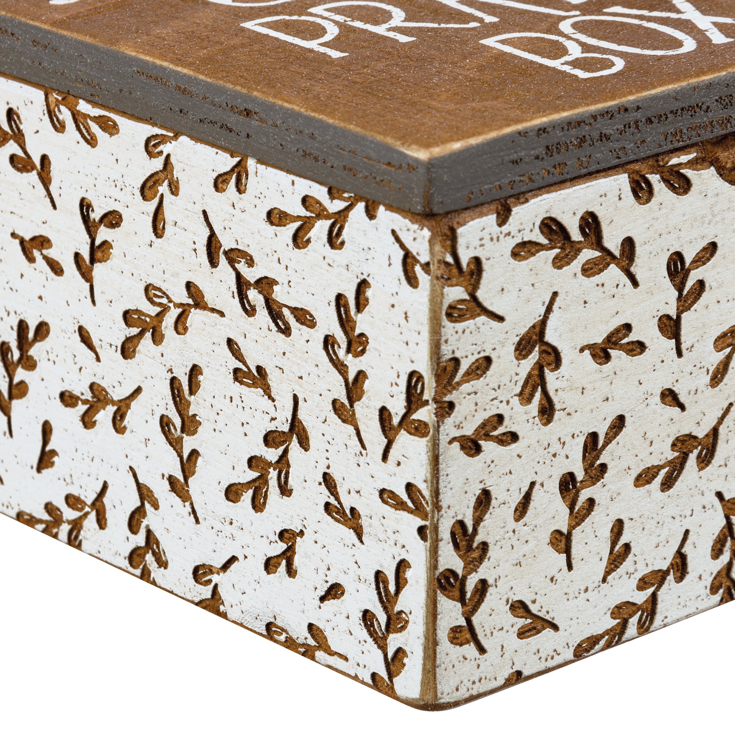 Write down your prayers and store them inside this wooden hinged box featuring debossed botanical designs and hand lettered "My Little Prayer Box" sentiment.