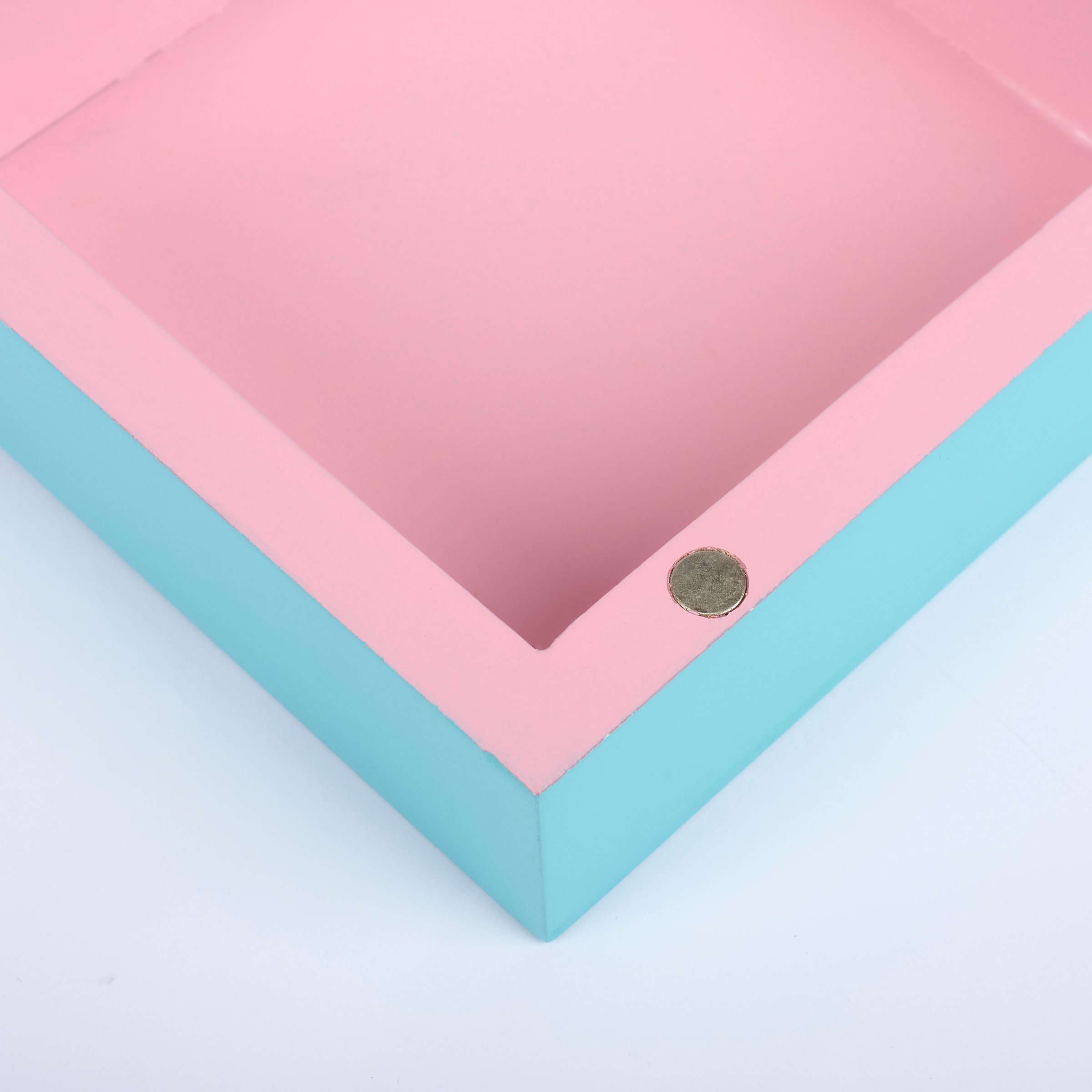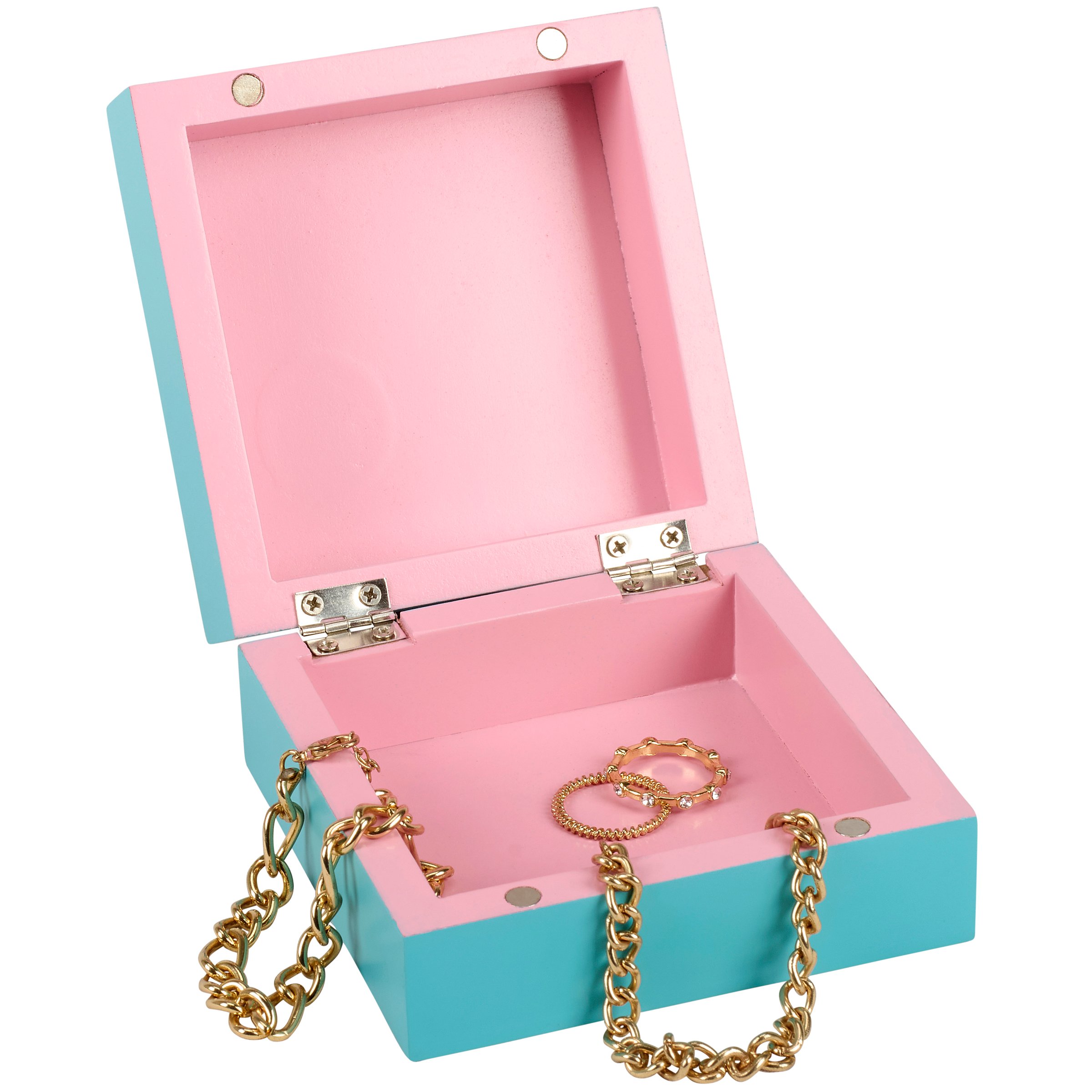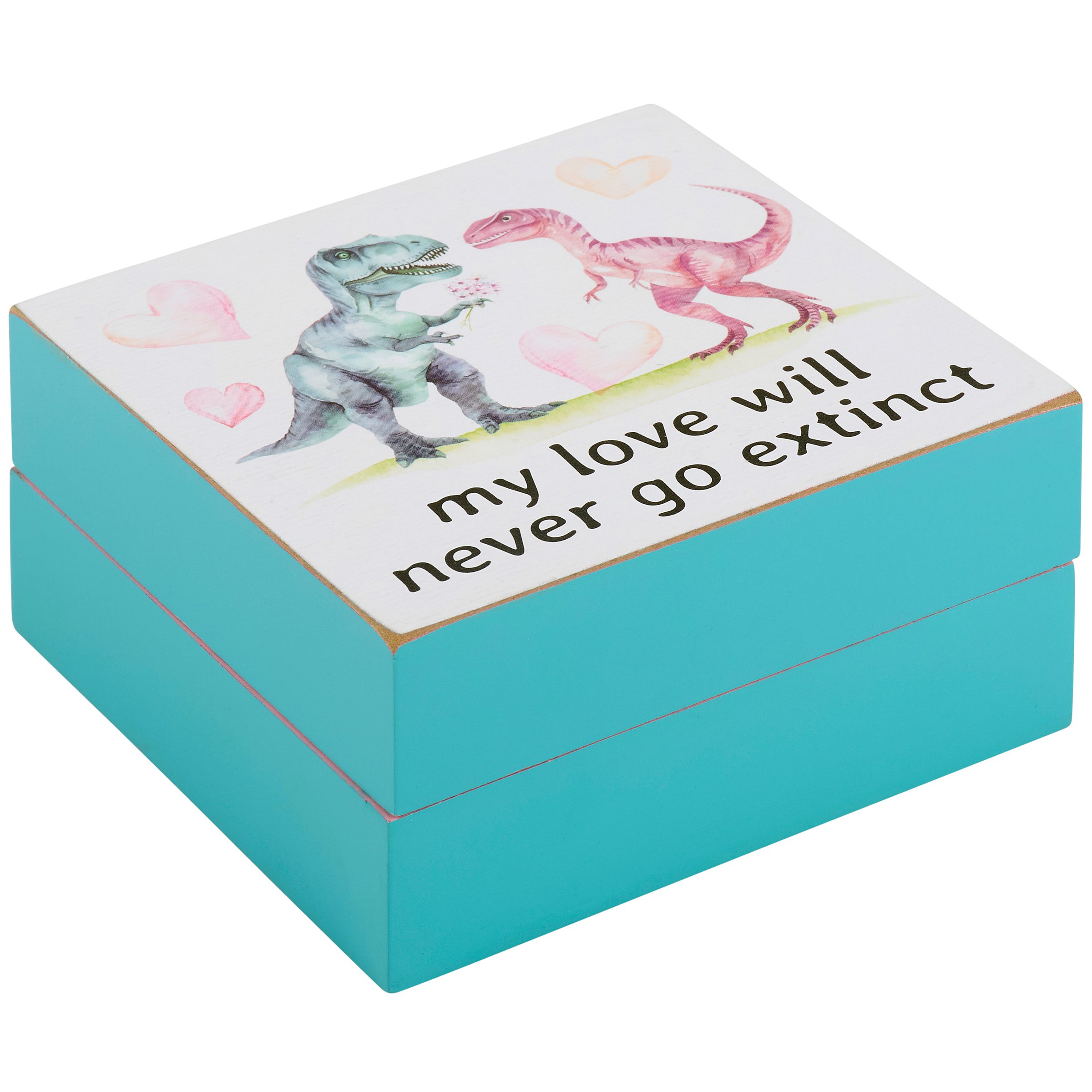 A wooden hinged box from our Valentine's Day Collection displaying a fun dinosaur inspired love-themed design and "My Love Will Never Go Extinct" sentiment. Hinged box is made with natural wood and features a magnet closure to keep items secure with coordinating pastel blue color on the outside and pastel pink on the inside. Our Never Go Extinct hinged box is perfect for storing daily keepsakes as seasonal home decor. A fun dinosaur-themed home accent that is great for gifting.
