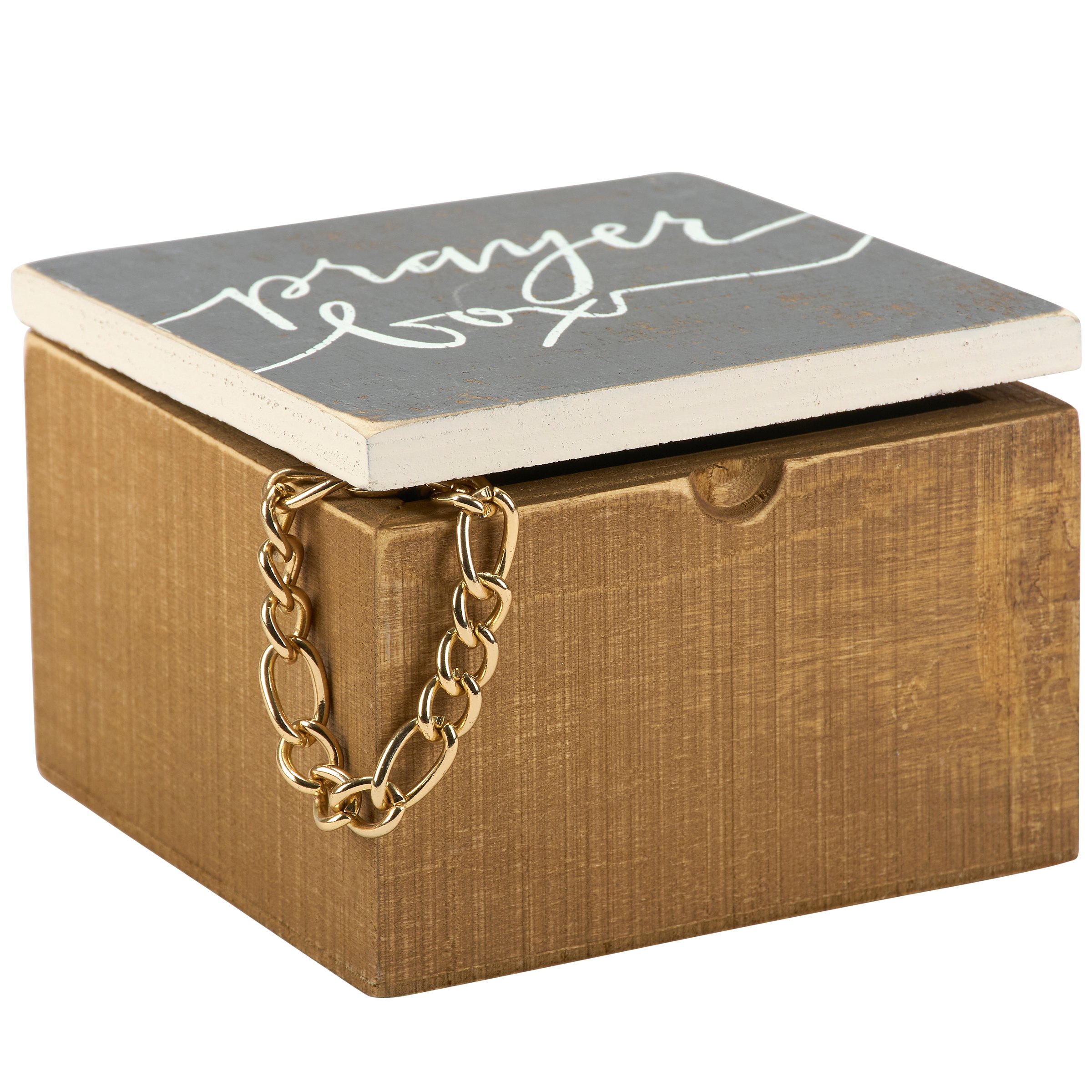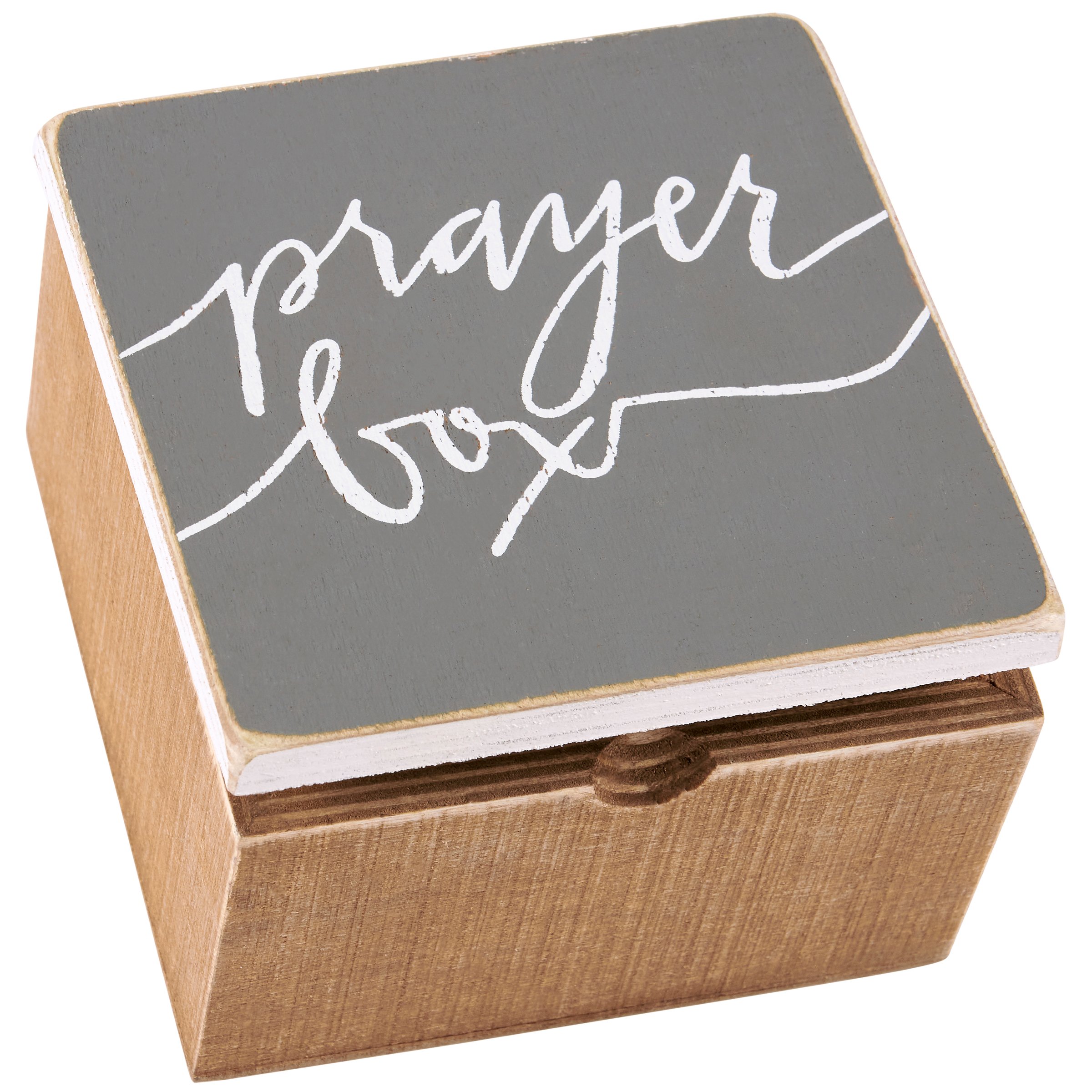 A wooden hinged box from our Faith Collection features a hand lettered "Prayer Box" top sentiment in a neutral palette with natural wood trim. This Wooden Pray Box complements well with existing decor or coordinating design pieces.