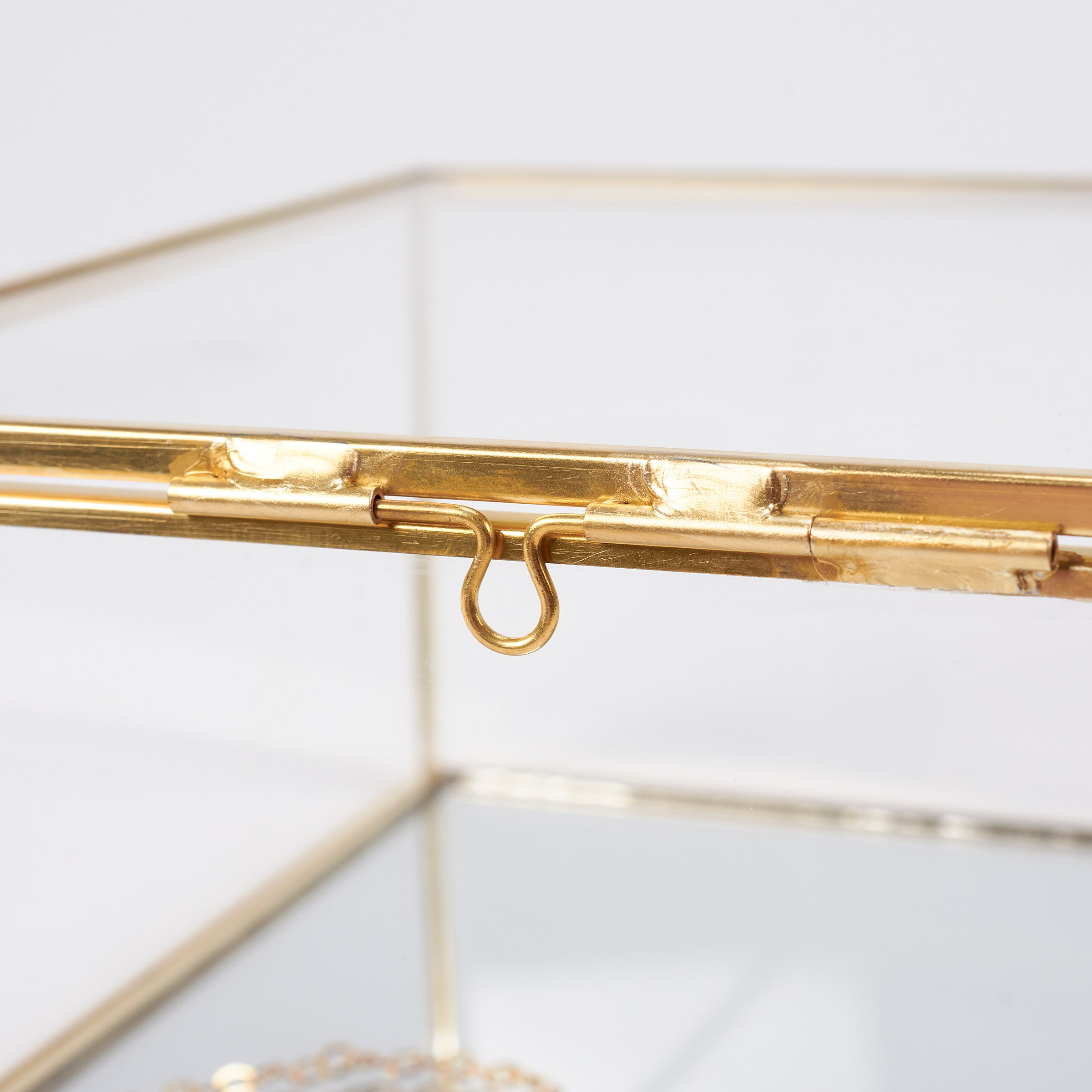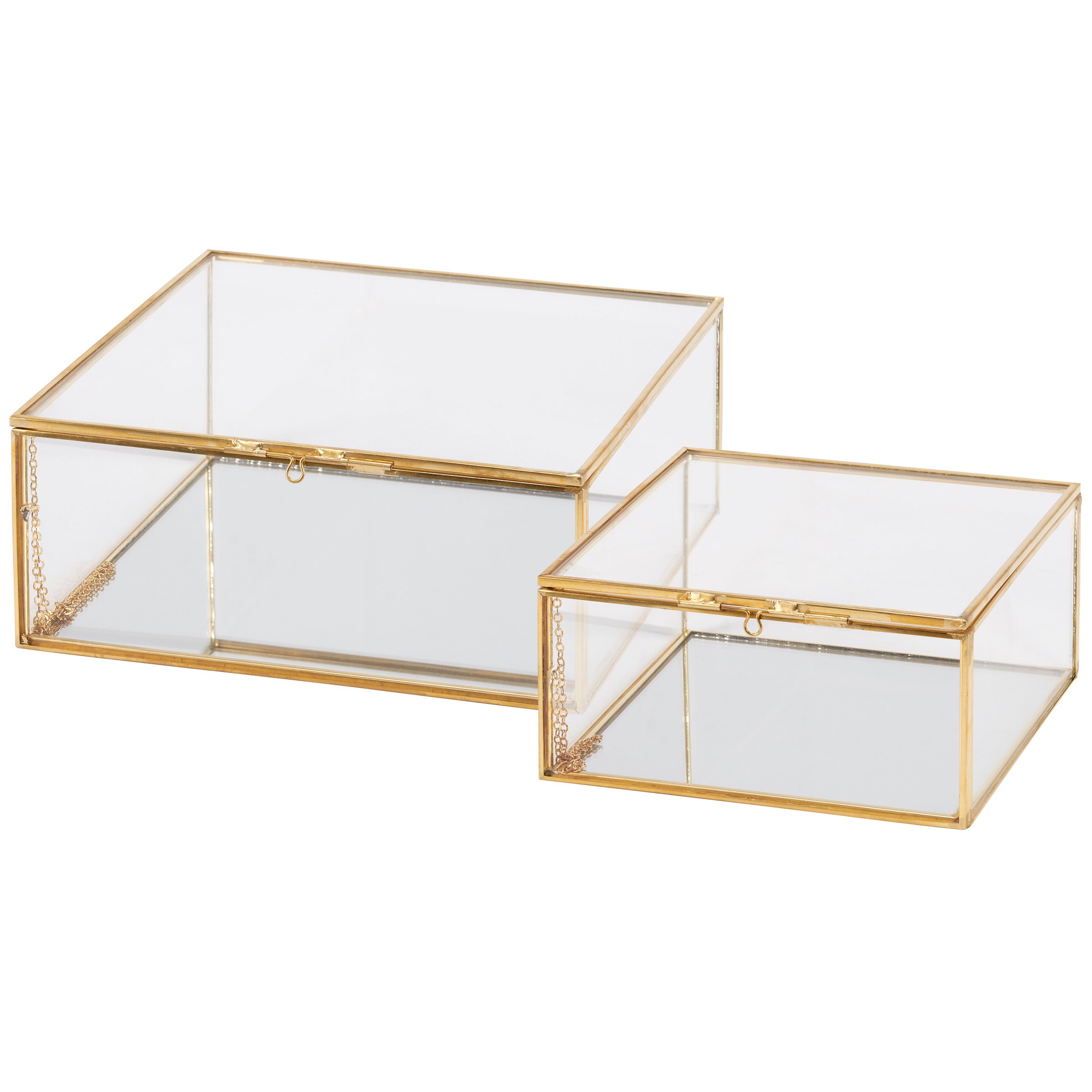 A set of decorative hinged boxes from our Home Collection including 2 individually sized rectangle shapes made with glass and brass trim for an antique style. Each hinged box features a mirror bottom and brass chain to hold lid open with a latch to secure closed. Our glass Square hinged box set is a unique vintage inspired home accent perfect for storing daily keepsakes or decorative items.