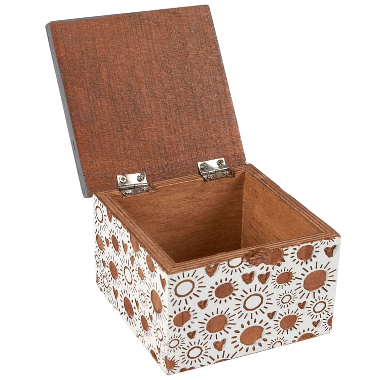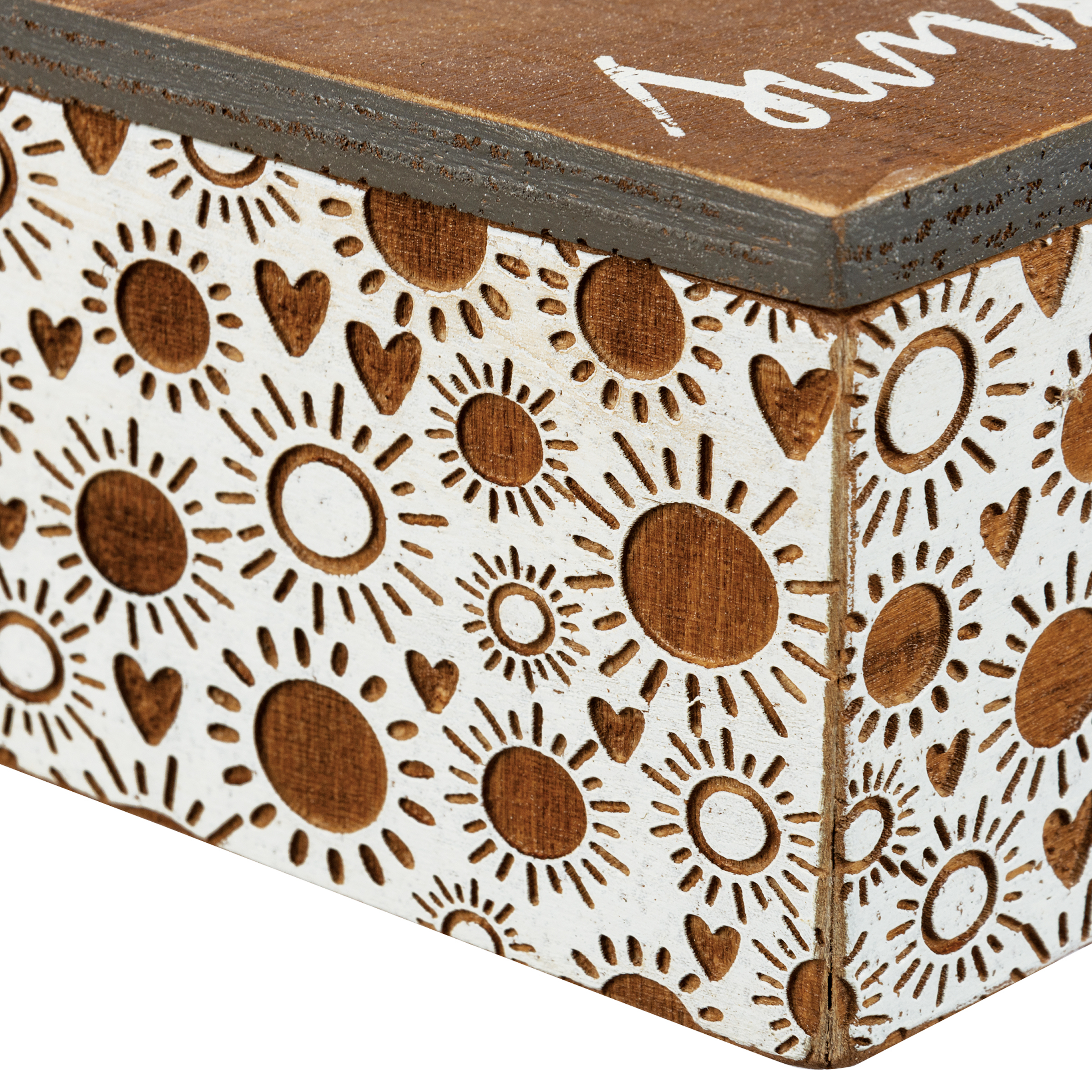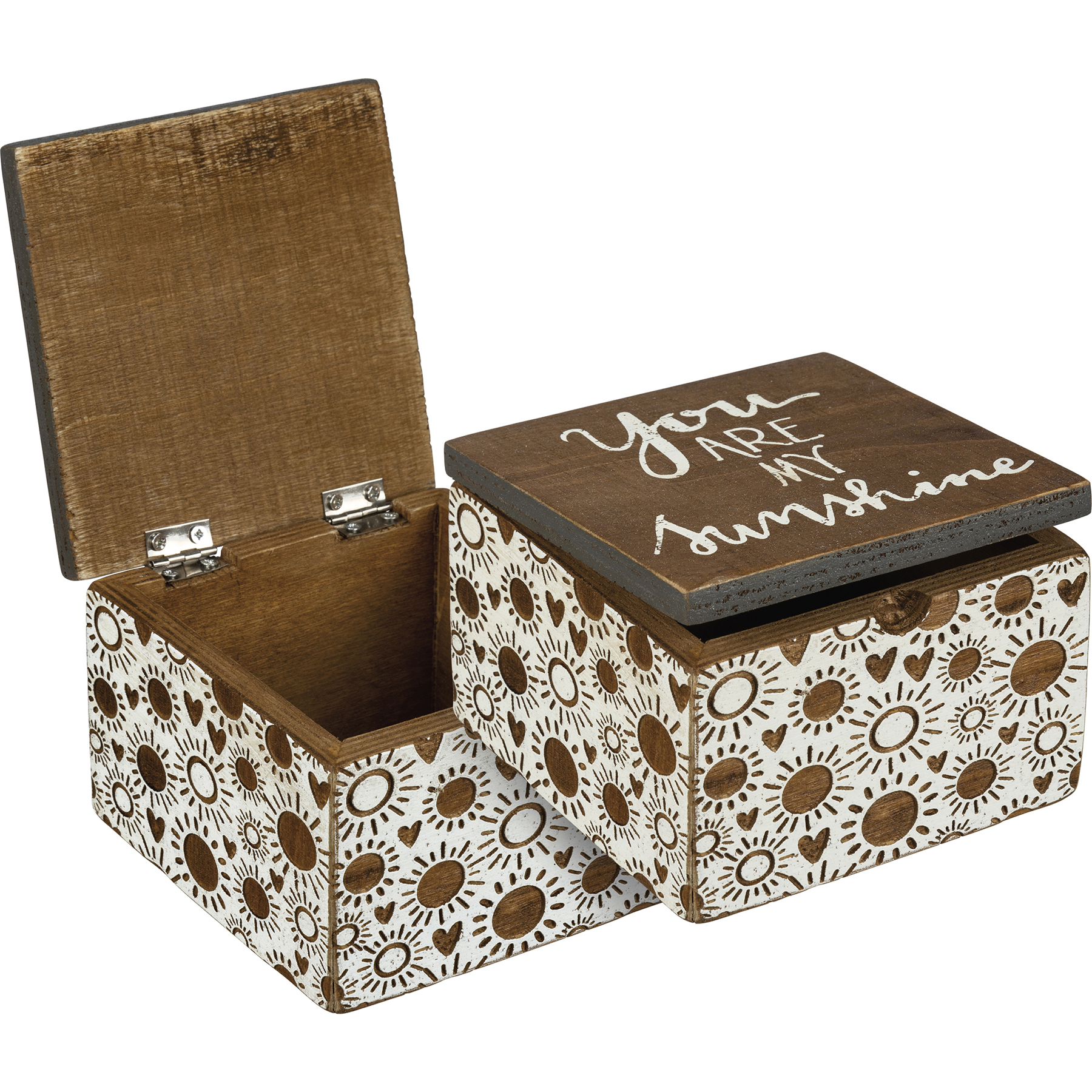 A wooden hinged box featuring debossed sun and heart designs and hand lettered "You Are My Sunshine" sentiment.
