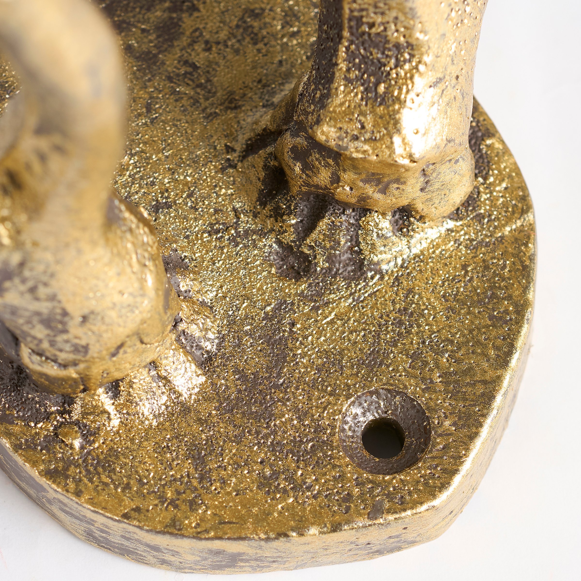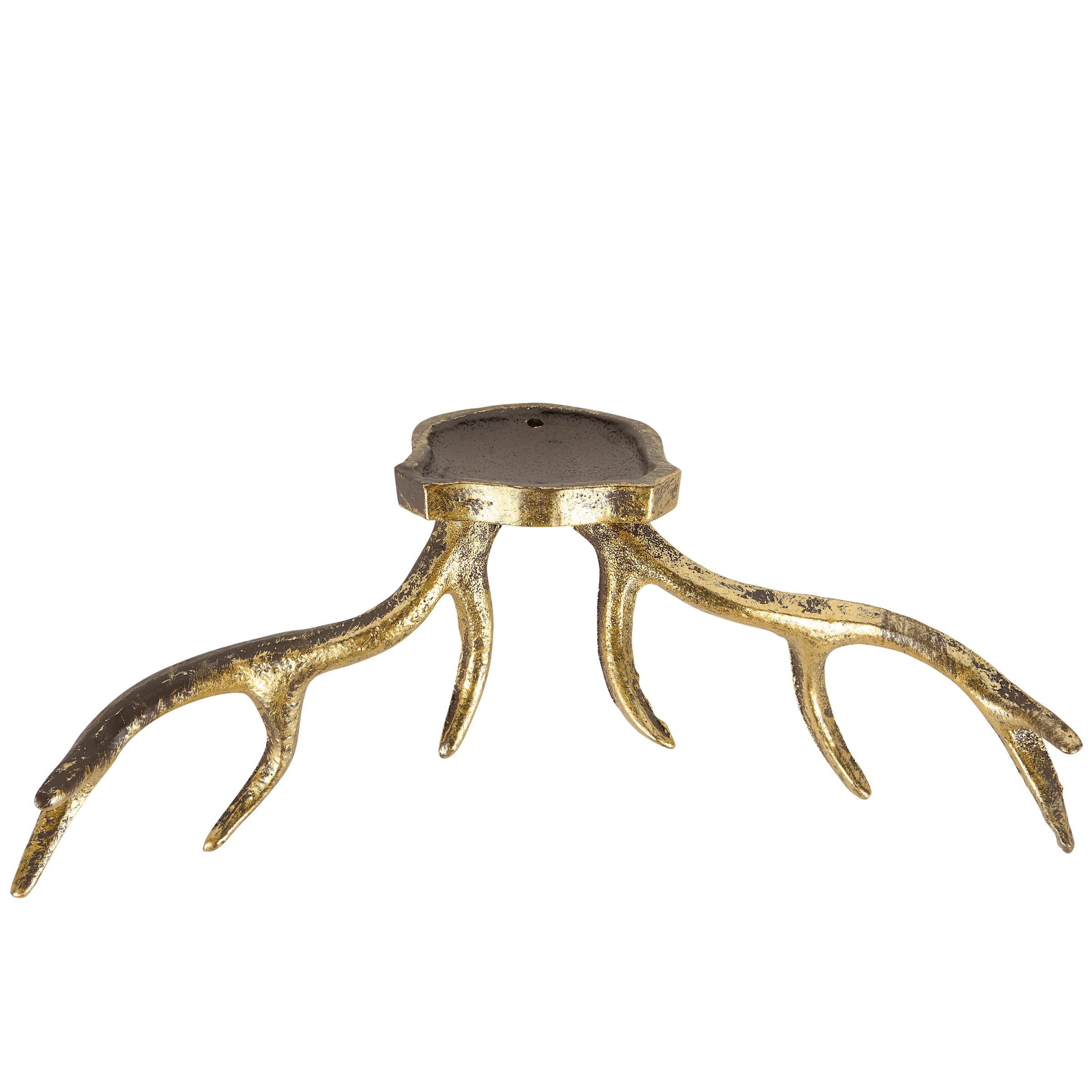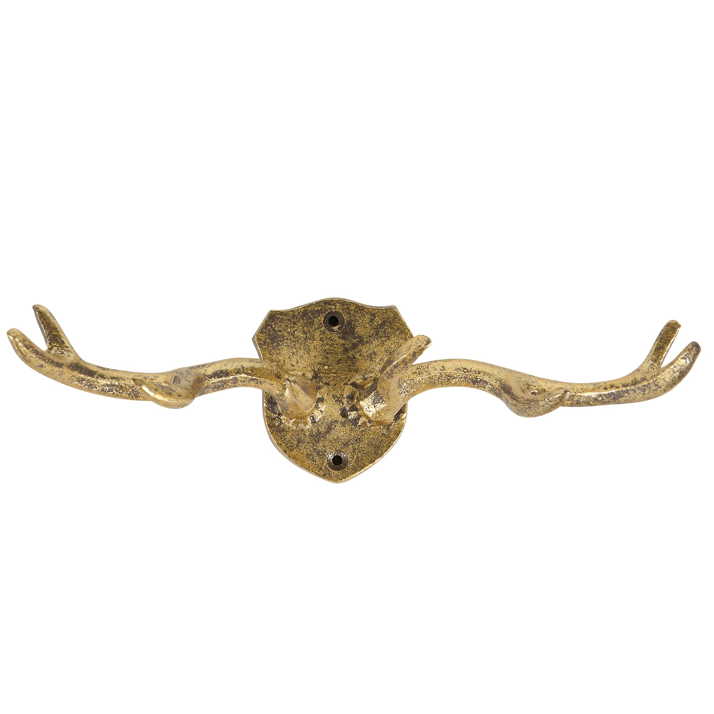 A decorative hook board from our Christmas Collection featuring a vintage metal plate attached to sculpted antlers hanging accessories on a wall that coordinates well with cabin decor. Antlers design features metallic gold finish with antique detailing. Our Antlers hook board is easy to hang against wall via predrilled holes. A vintage cabin-themed home accent perfect for seasonal display.