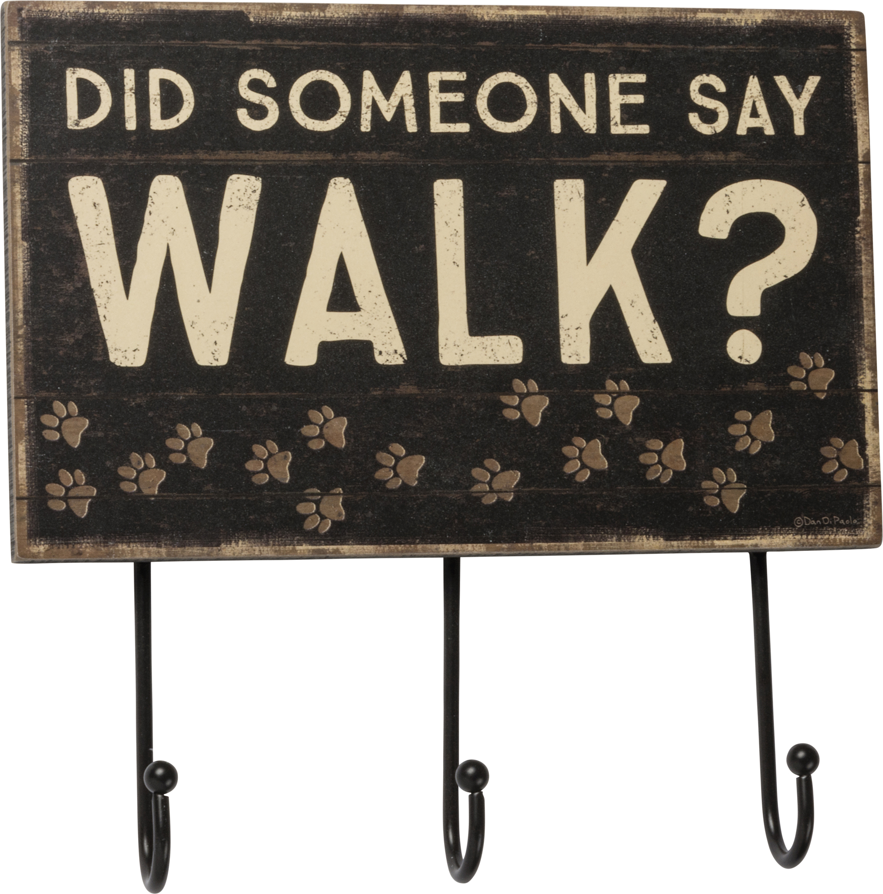 A slat wood hook board lending a distressed "Did Someone Say Walk?" sentiment with paw print designs. Includes three curved metal hooks for leashes and everyday essentials and accessories. Complements well with coordinating design pieces.