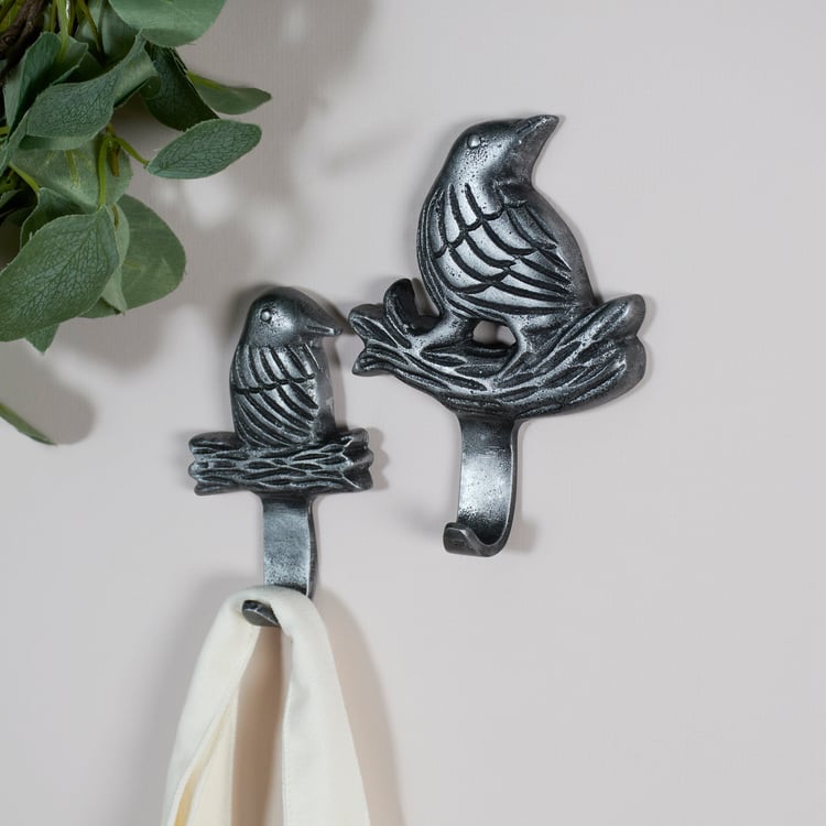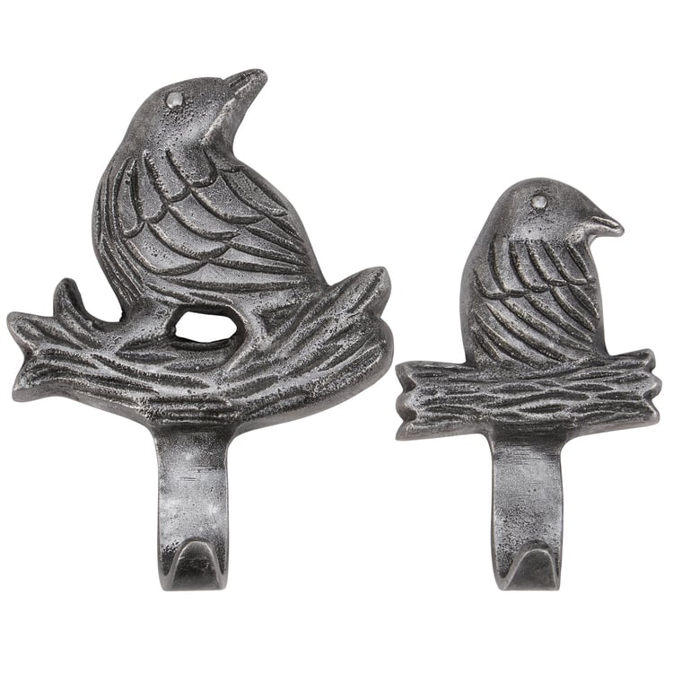 A set of 2 decorative wall hooks from our Easter & Spring Collection featuring sculpted designs of birds on branches attached to a metal hook for hanging accessories on a wall. Designs feature antique metal finish with textured details. Our Bird hook set is easy to hang against wall via keyhole slots on the back of each. A set of nature-themed home accents perfect for seasonal display.