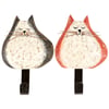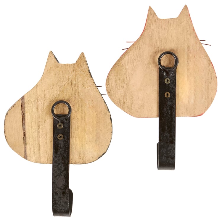 A decorative hook set from our Pet Collection including two wall hooks displaying charming tabby cat inspired designs recreated from hand carved and painted pieces. Decorative cats feature a rustic style with distressed details and wire whisker accents as well as metal hooks for hanging accessories. Our Tabby Cat hook set is designed to hang individually via attached hangers on the back. A rustic set of pet-themed home accents that add character to any home or work space.