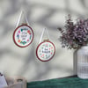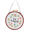 A decorative hoop from our Inspiration & Blooms Collection displaying colorful flowers and bees surrounding an inspirational sentiment that reads "Be Happy." Designs are embroidered on linen and fixed to solid wood base with metal clasp and screw designed to resemble an embroidery hoop. Our Be Happy hoop is easy to hang via the attached cotton tape hanger. An inspirational everyday home accent that can be easily displayed in any home or work space.