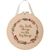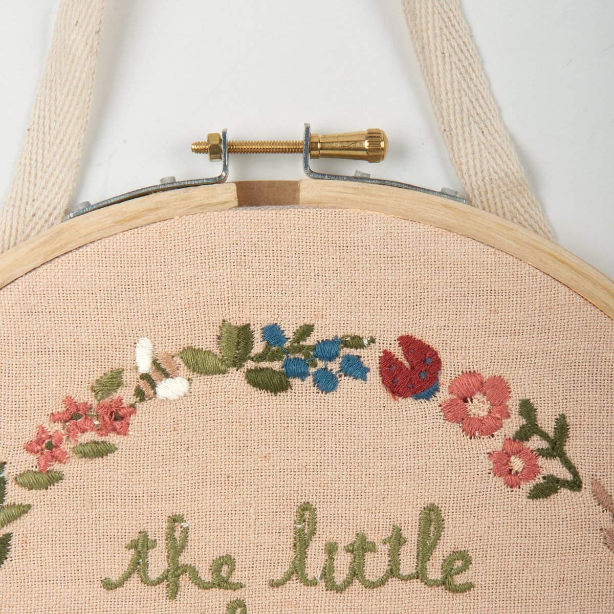 A decorative hoop from our Cottagecore Collection displaying charming design of bee, snail, and greenery surrounding "The Little Things Are The Big Things" sentiment. Embroidered design is on linen and fixed to solid wood base with metal clasp and screw designed to imitate embroidery hoop. Our Little Things hoop is easy to hang via cotton loop attached behind clasp.