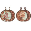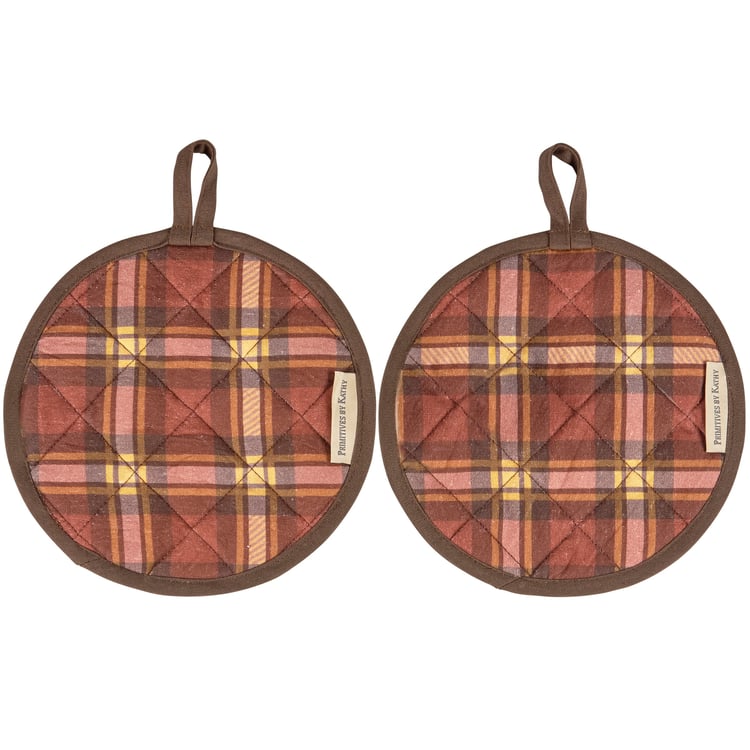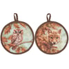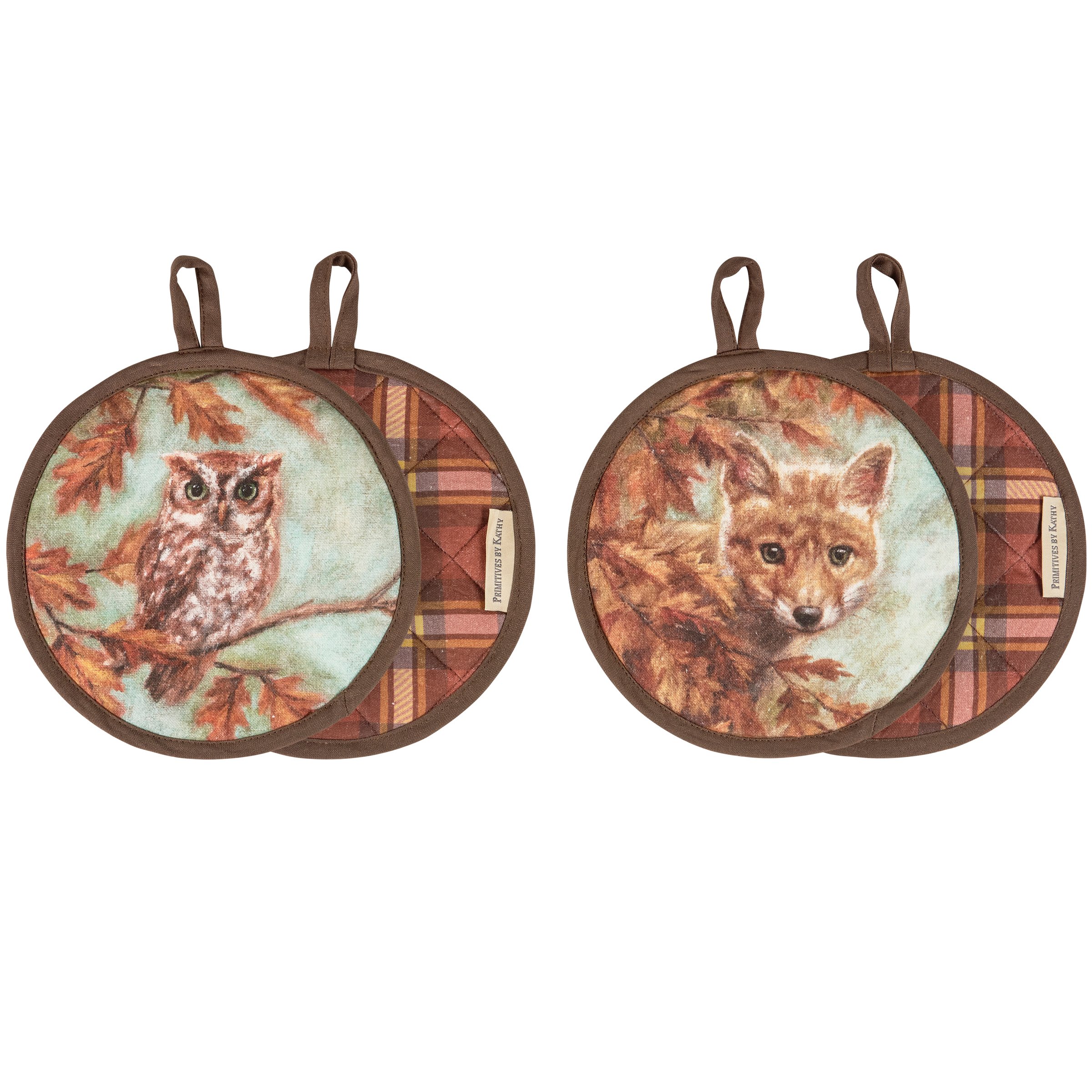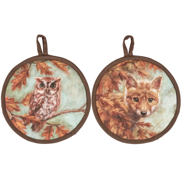 A coordinating hot pad set from our Fall & Harvest Collection including two double-sided hot pads displaying charming hand painted fall scenes of a fox on one pad and an owl on the other. Seasonal hot pads also feature fall inspired plaid on the back with complementing brown trim. Designs are replicated from original artwork painted onto burlap canvas, giving the art a unique depth and texture. Our Fox And Owl hot pads are conveniently machine-washable for easy cleaning and includes a loop on each pad to easily hang. A charming fall-themed gift set perfect for a seasonal kitchen accessory.
