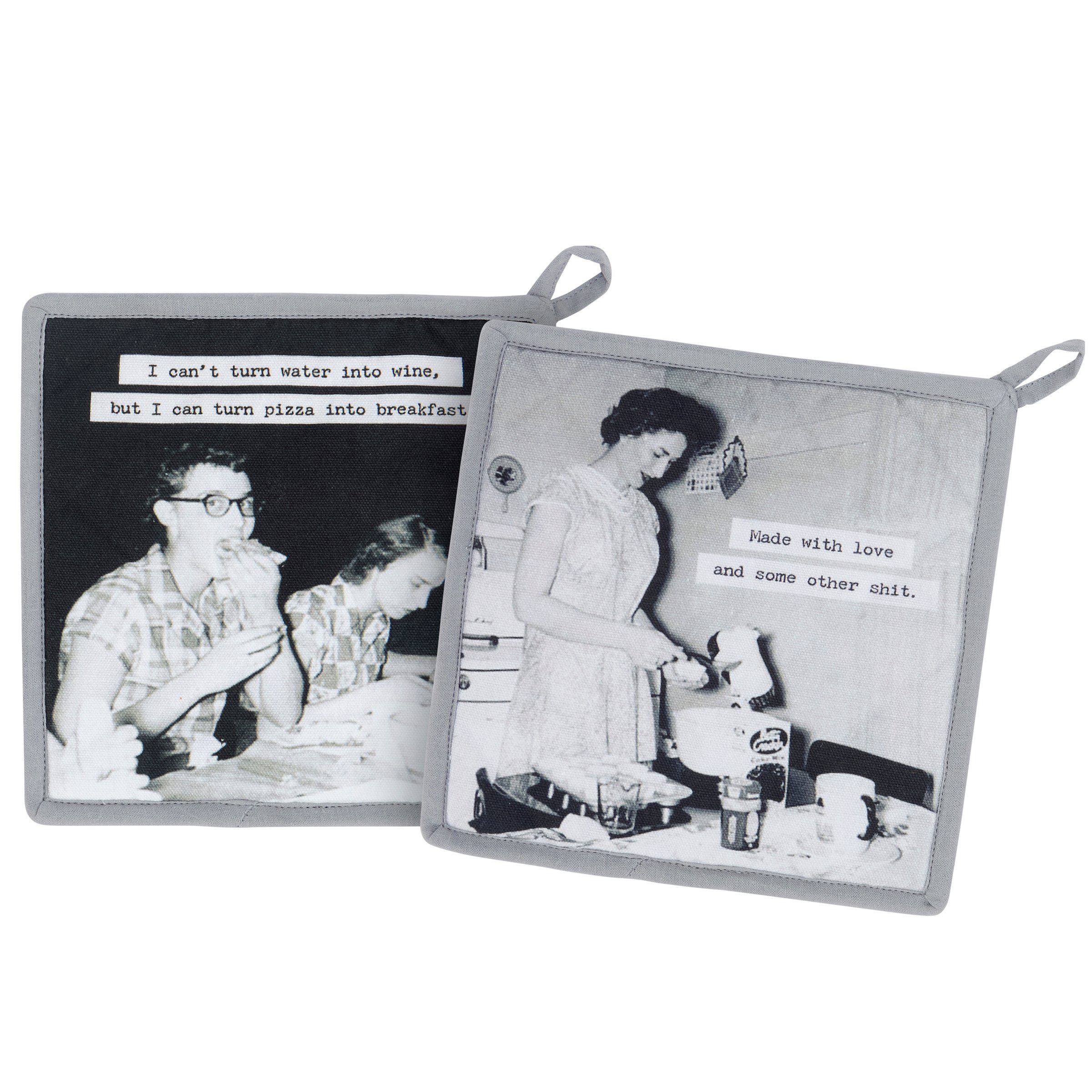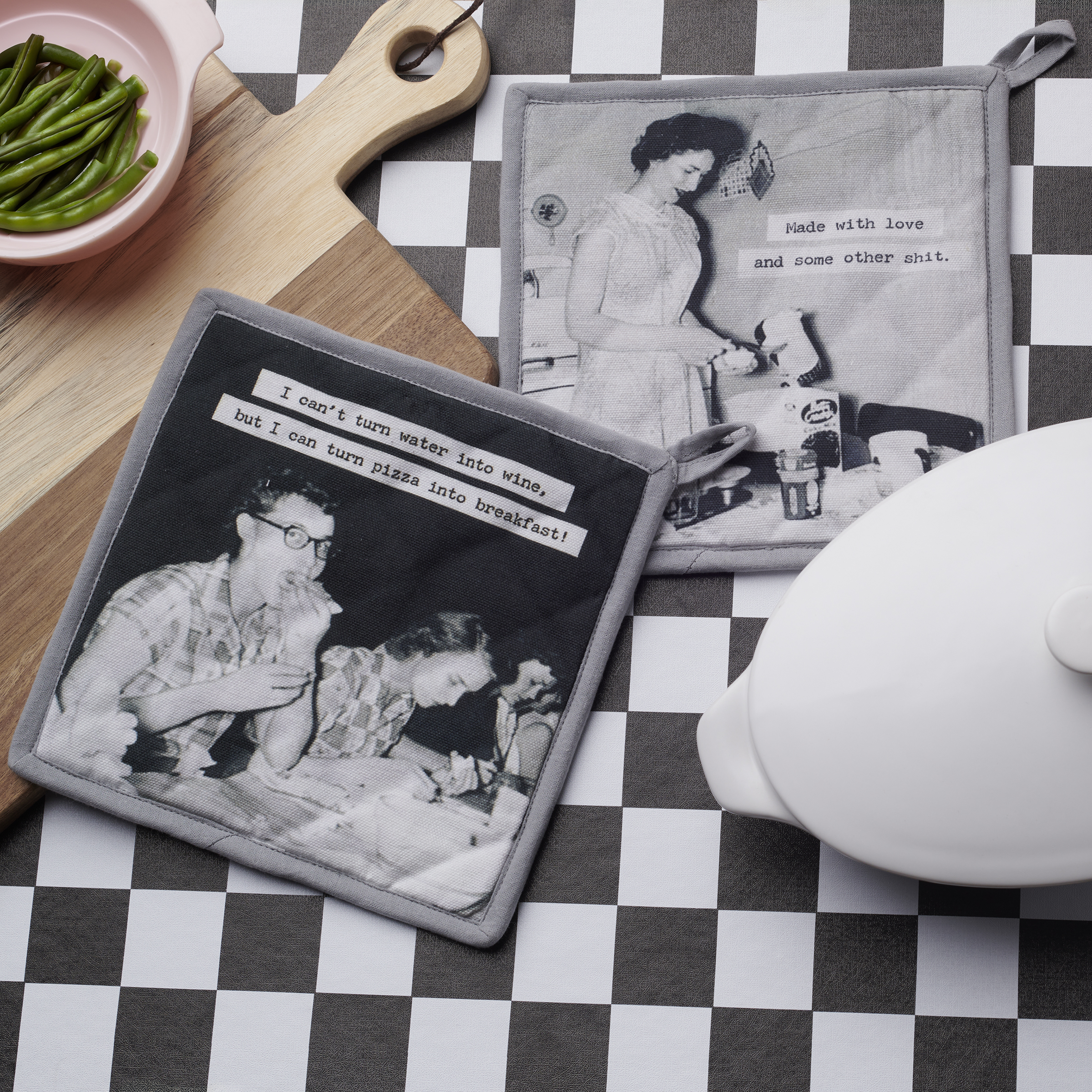 A coordinating hot pad set from our Trash Talk By Annie Collection including two double-sided hot pads displaying vintage black and white photographs complemented with humorous food themed sentiments that read "I Can't Turn Water Into Wine, But I Can Turn Pizza Into Breakfast." and "Made With Love And Some Other Shit." Vintage hot pads feature a coordinating retro pattern on the back with gray trim. Our Made With Love hot pads are conveniently machine-washable for easy cleaning and include a loop on each pad to easily hang. A fun set of vintage style kitchen accessories that are great for everyday gifting.