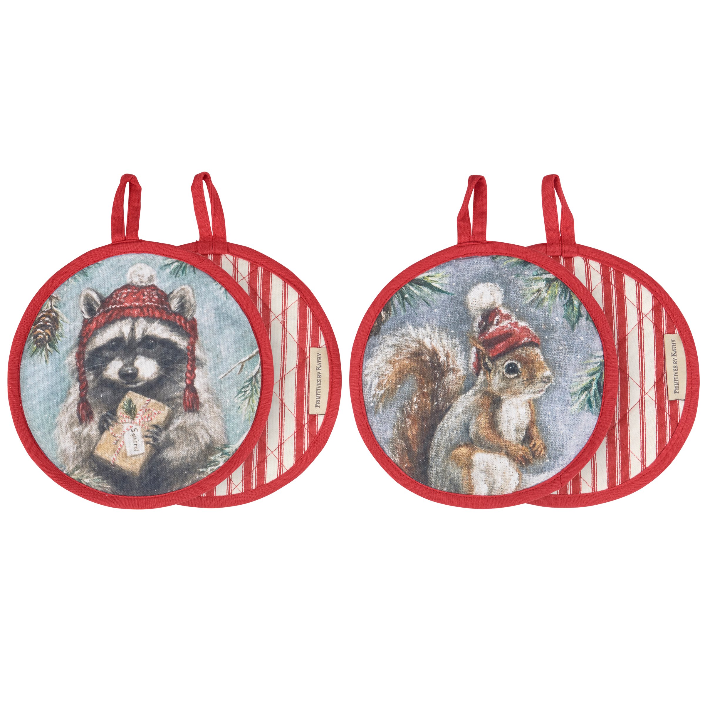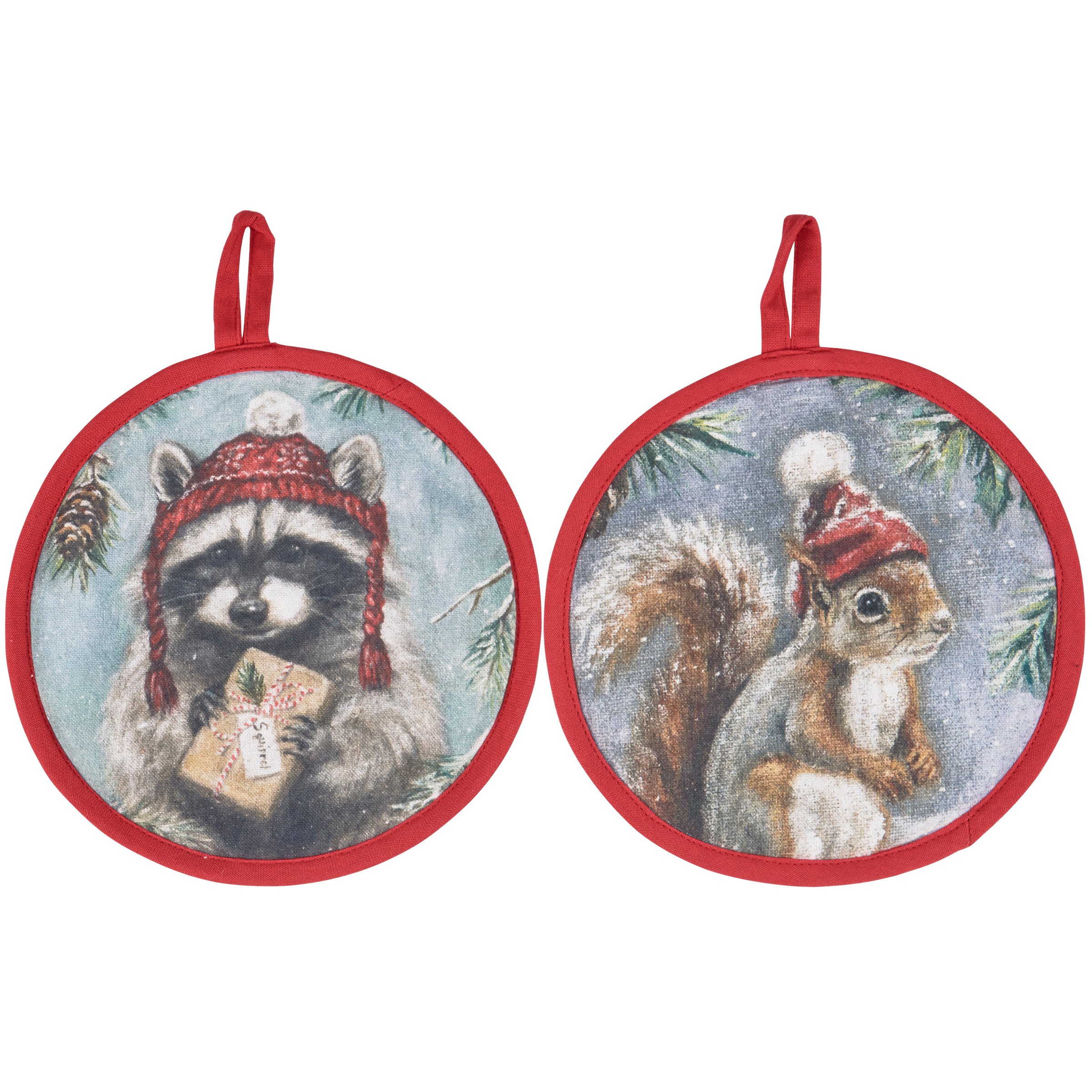 A coordinating hot pad set from our Christmas Collection including two double-sided hot pads displaying charming hand painted winter scenes of a raccoon on one pad and a squirrel on the other. Seasonal hot pads also feature Christmas inspired stripes on the back with complementing red trim. Designs are replicated from original artwork painted onto burlap canvas, giving the art a unique depth and texture. Our Winter Animals hot pads are conveniently machine-washable for easy cleaning and includes a loop on each pad to easily hang. A charming winter-themed gift set perfect for a seasonal kitchen accessory.