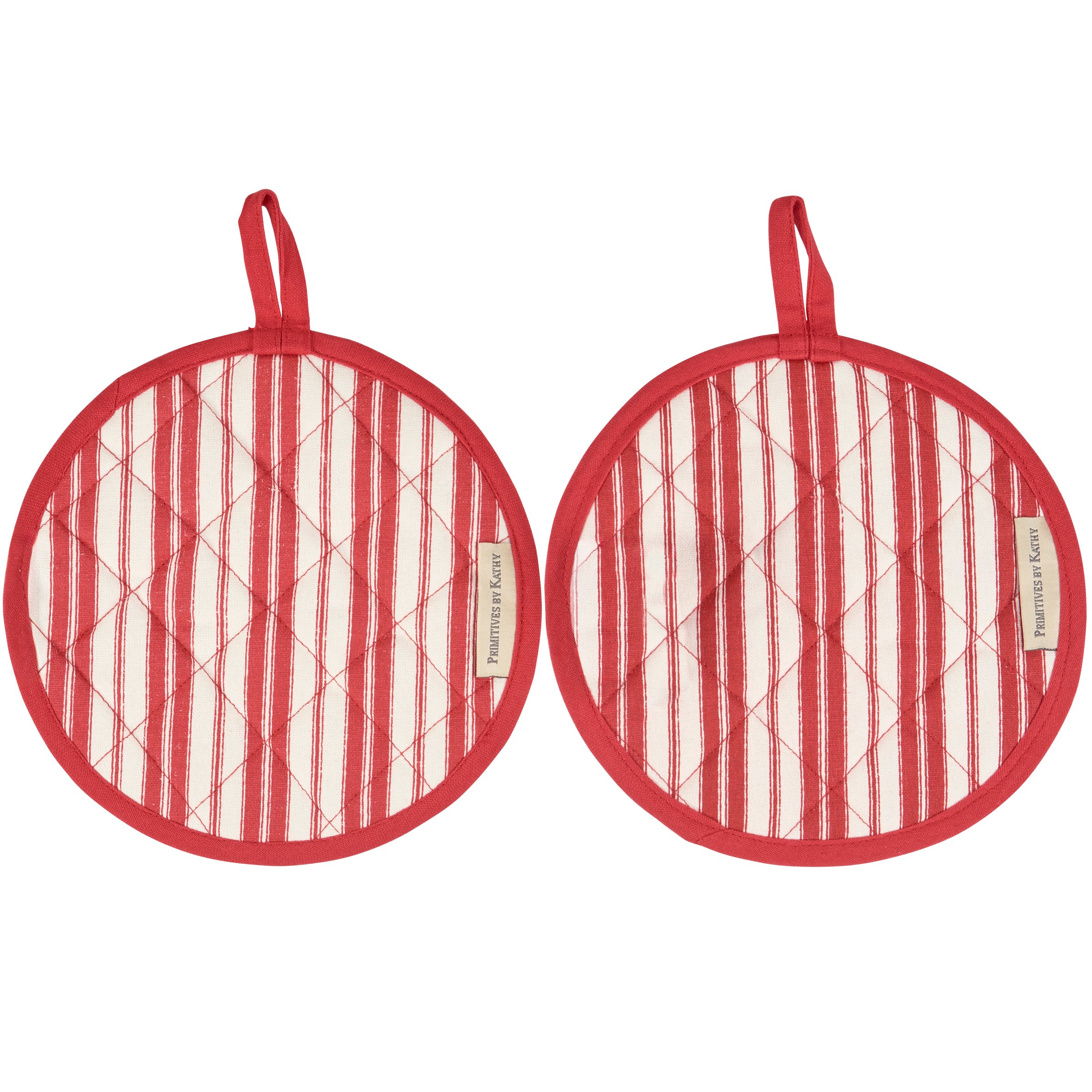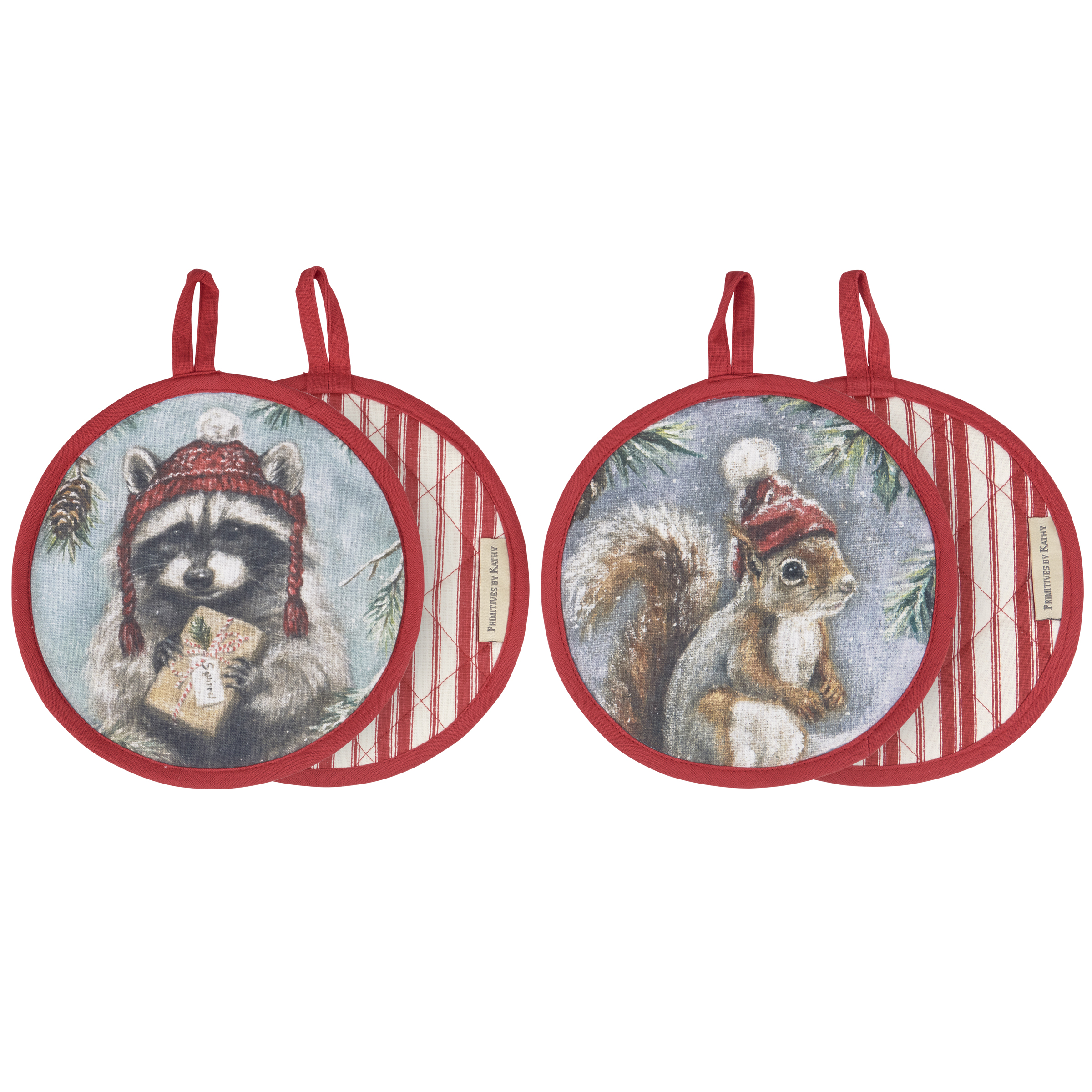A coordinating hot pad set from our Christmas Collection including two double-sided hot pads displaying charming hand painted winter scenes of a raccoon on one pad and a squirrel on the other. Seasonal hot pads also feature Christmas inspired stripes on the back with complementing red trim. Designs are replicated from original artwork painted onto burlap canvas, giving the art a unique depth and texture. Our Winter Animals hot pads are conveniently machine-washable for easy cleaning and includes a loop on each pad to easily hang. A charming winter-themed gift set perfect for a seasonal kitchen accessory.